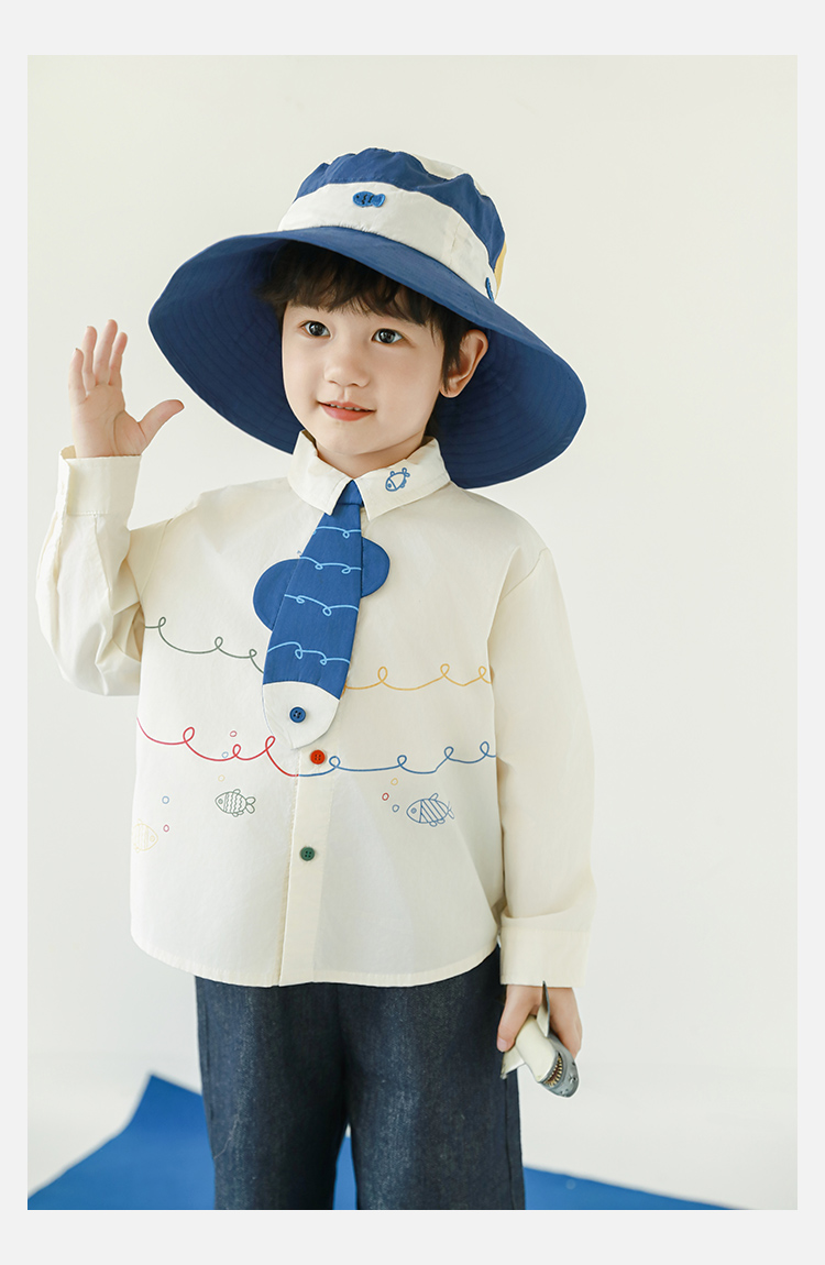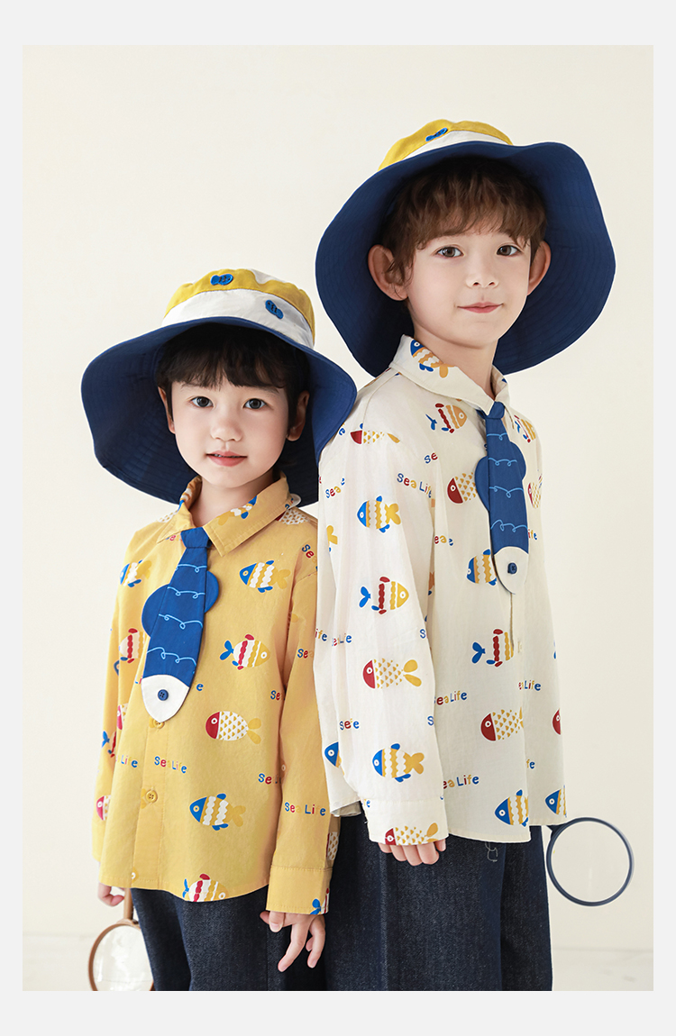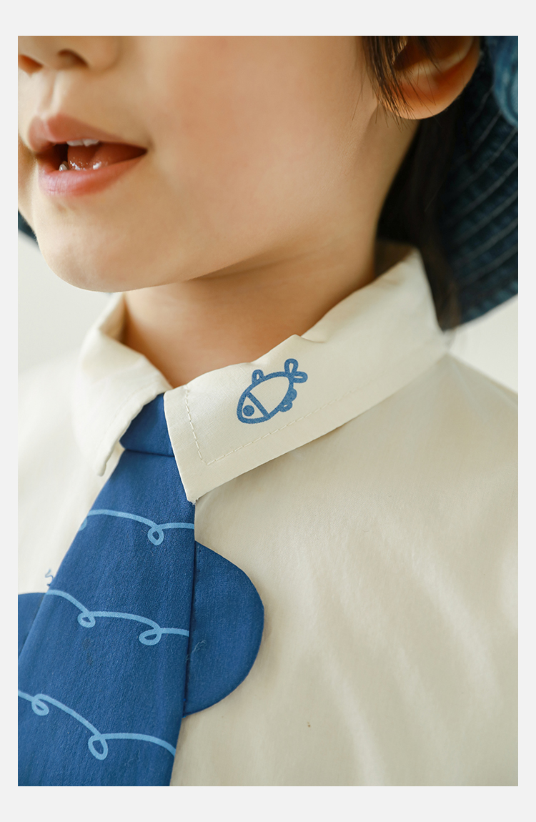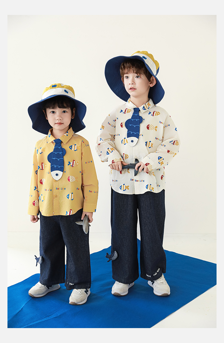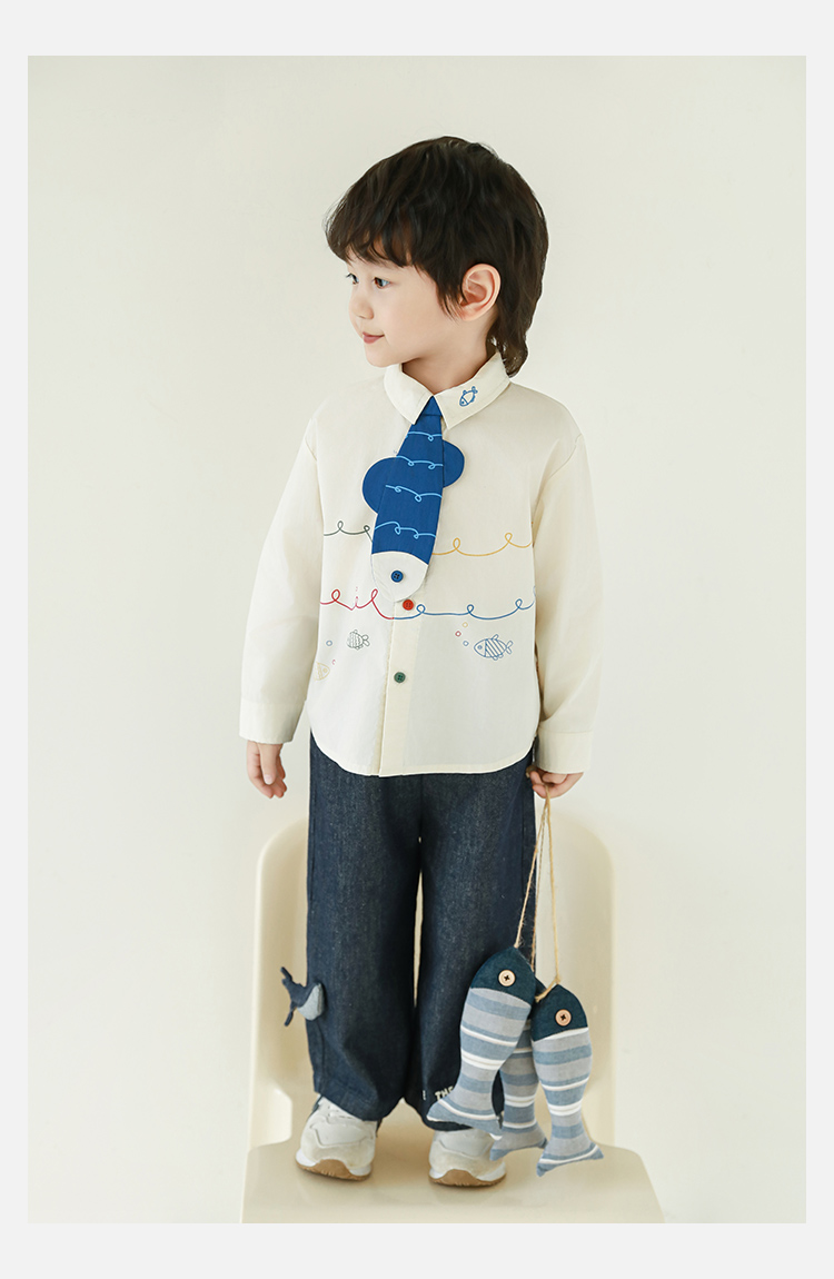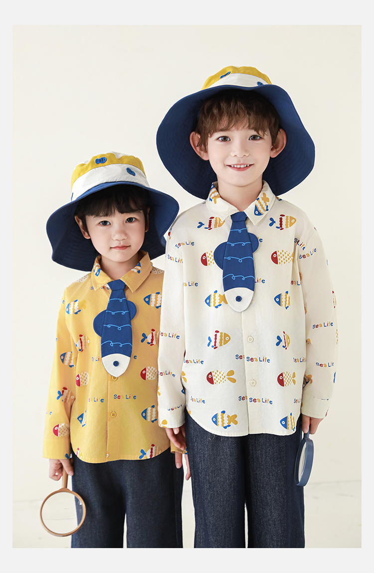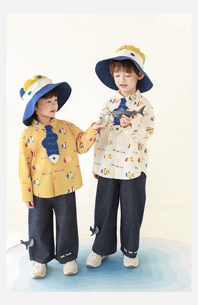 Wurib 소년 봄 새로운 긴 소매 옷깃 만화 생선 셔츠 짧은 뒤로 긴 유행 올 매치 셔츠스토어 가기