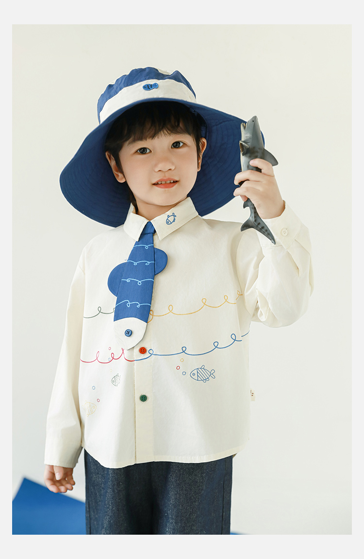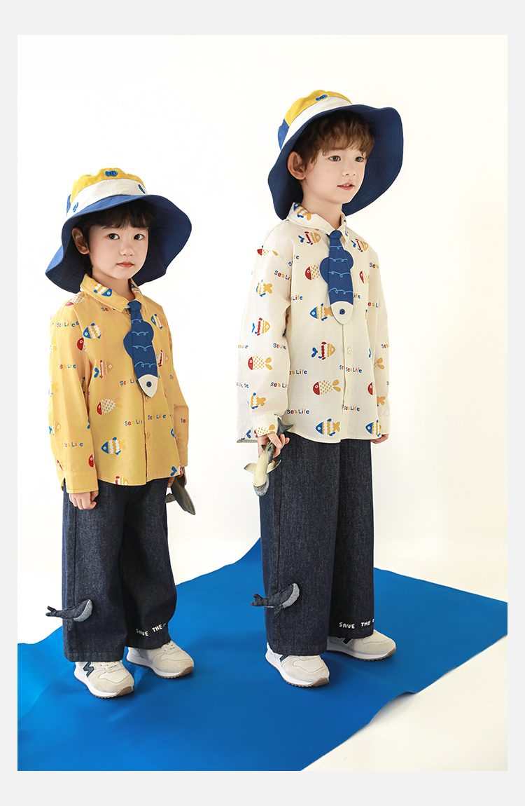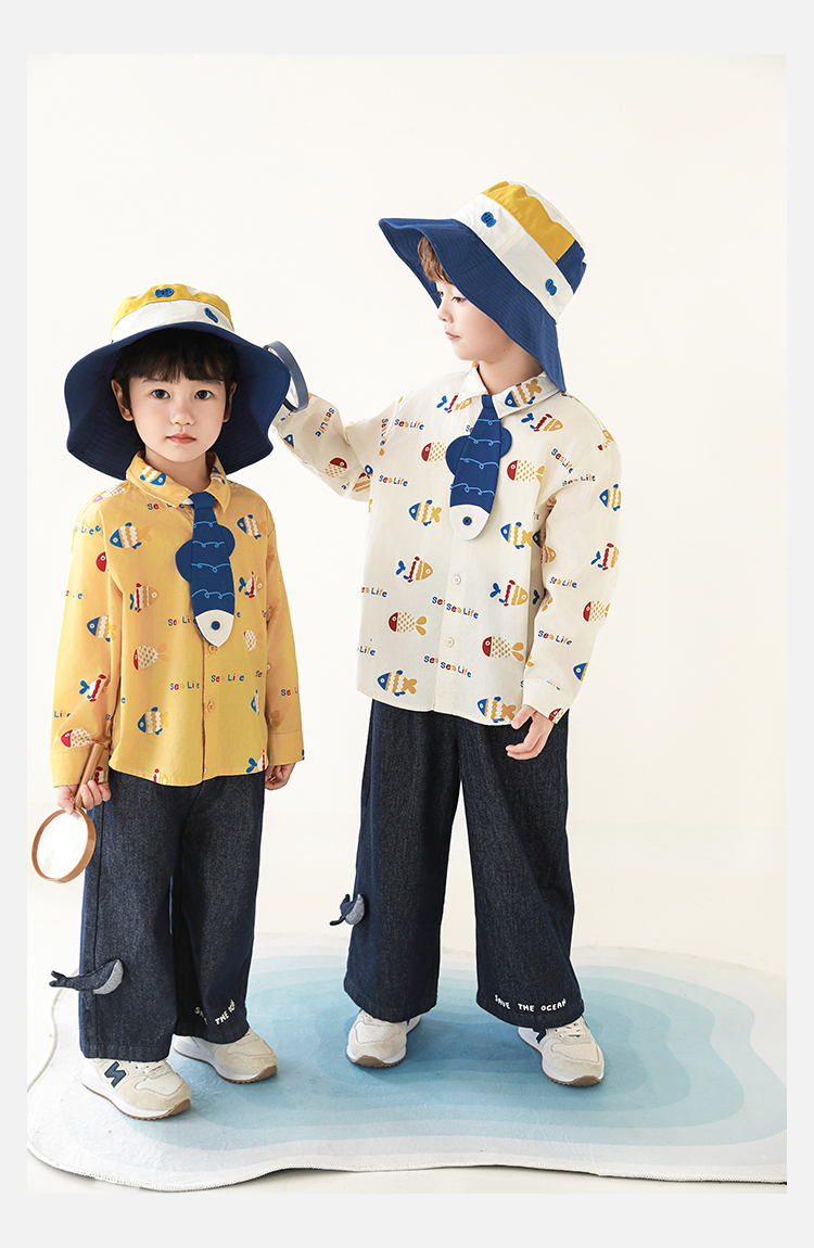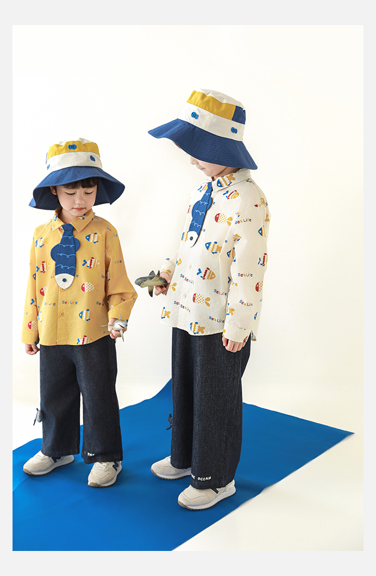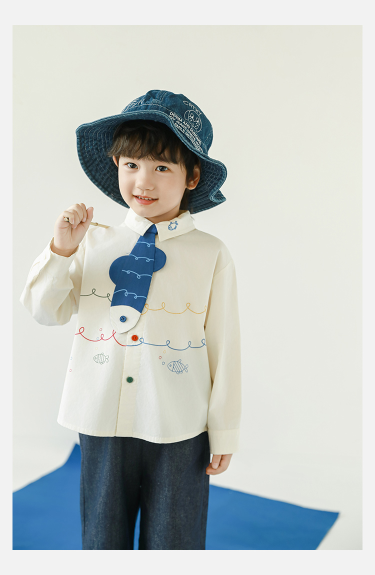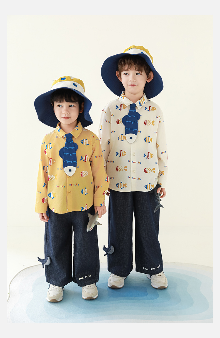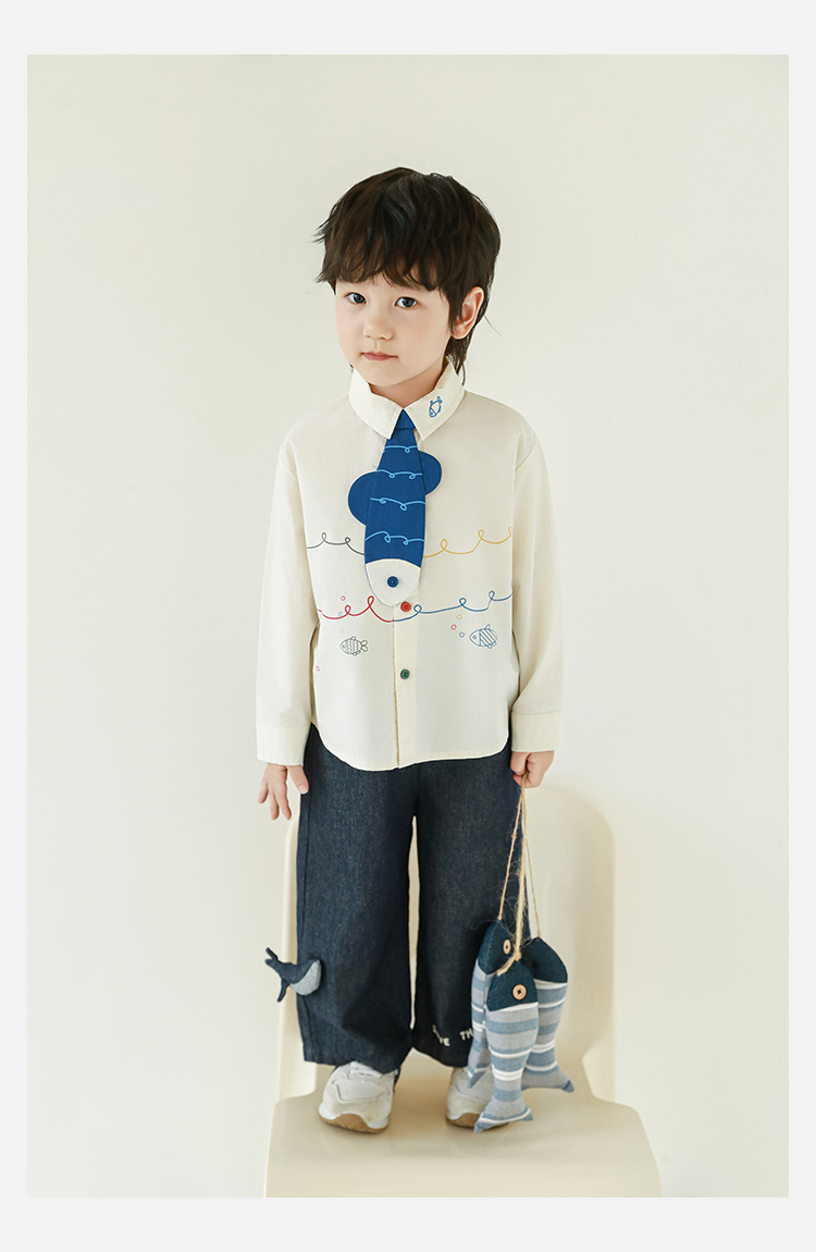 Wurib 소년 봄 새로운 긴 소매 옷깃 만화 생선 셔츠 짧은 뒤로 긴 유행 올 매치 셔츠스토어 가기