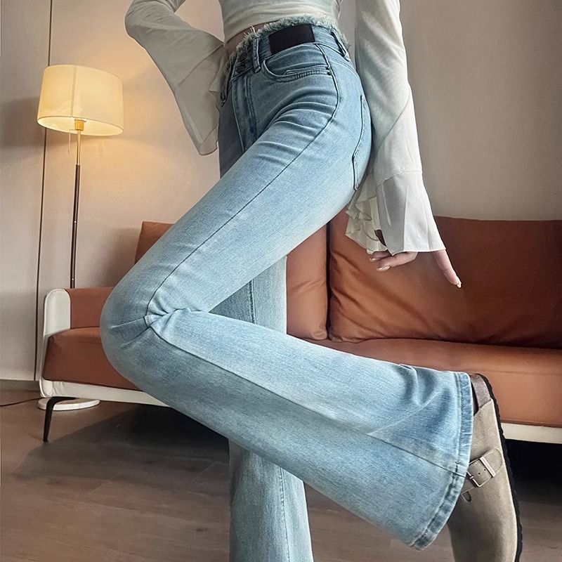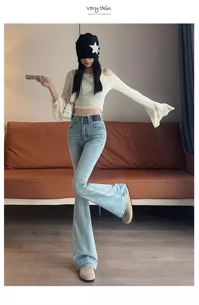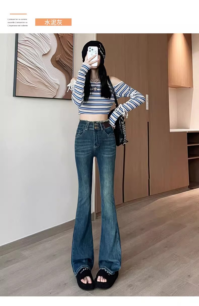 라이트 블루 마이크로 플레어 진 여성용 2025 년 봄과 가을 기모 두꺼운 엉덩이 리프팅과 배 꽉 작은 9 점 말굽 바지스토어 가기