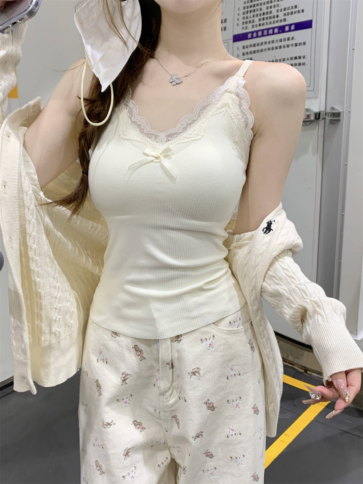 순수 V-넥 레이스 스트랩 어깨 스트랩 조정 가능한 조끼 여성 봄 2025 슬림 핏 원피스 탑 가슴 패드