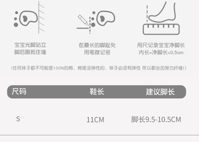 • S 사이즈, 신발 길이 11CM, 권장 발 길이 9.5-10.5CM