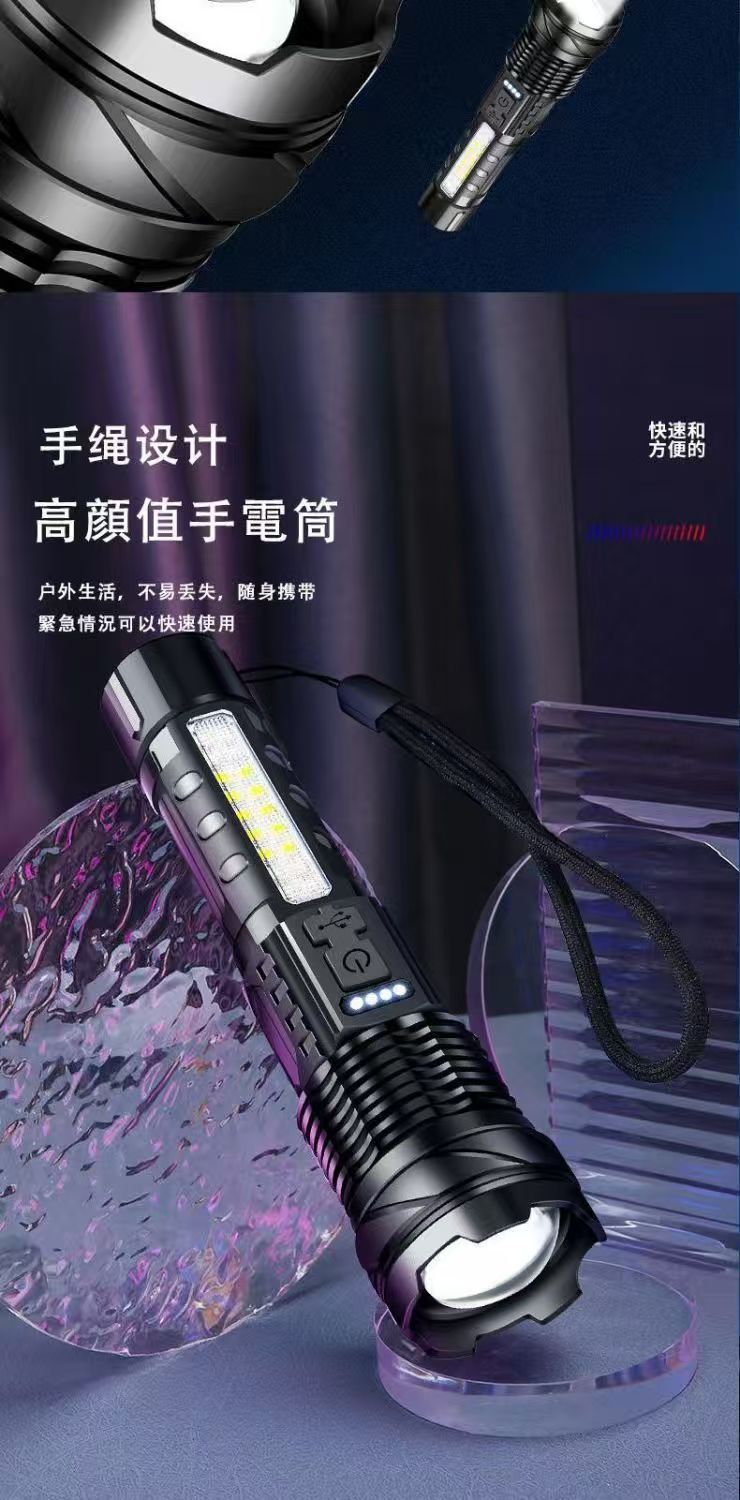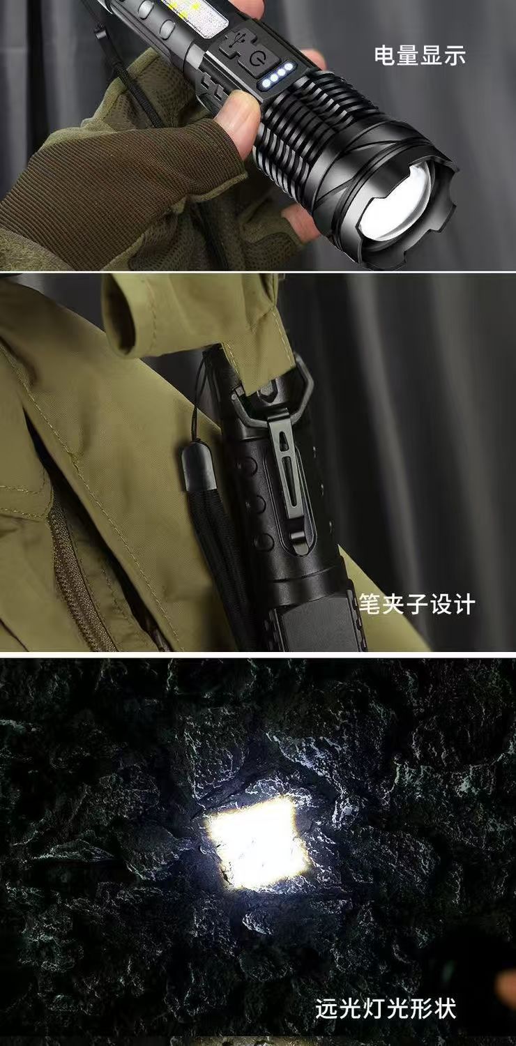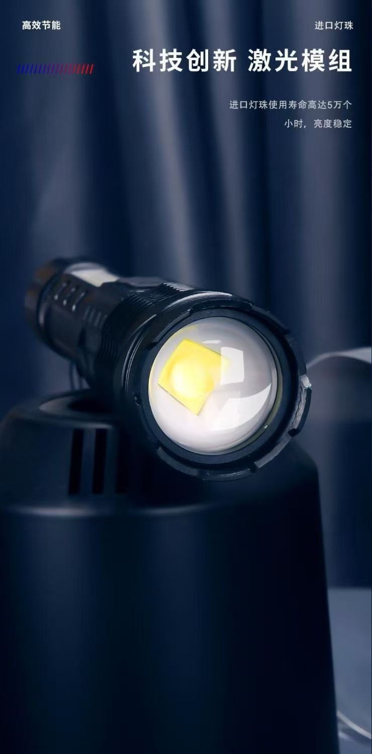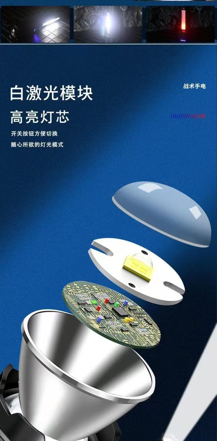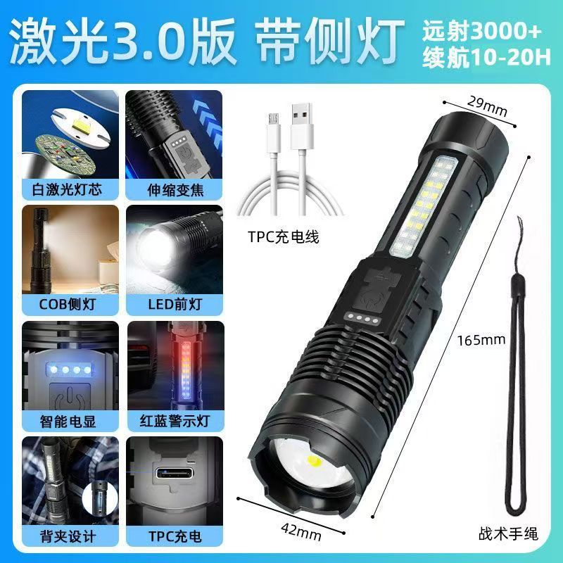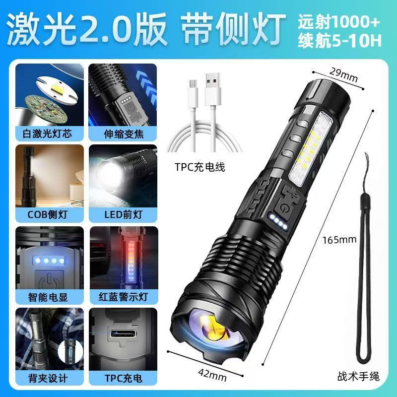 새로운 흰색 레이저 망원경 줌 원격 LED 손전등 홈 야외 빨간색과 파란색 경고 COB 사이드 라이트