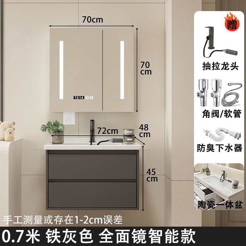 • 아이언 그레이 스마트 풀 미러 캐비닛 - 70cm 세라믹 일체형 세면대 + 액세서리 풀 세트