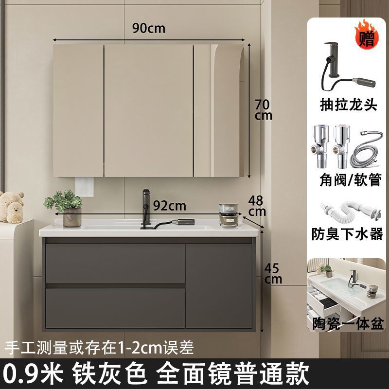 • 아이언 그레이 일반 풀 미러 캐비닛 - 90cm 세라믹 일체형 세면대 + 액세서리 풀 세트