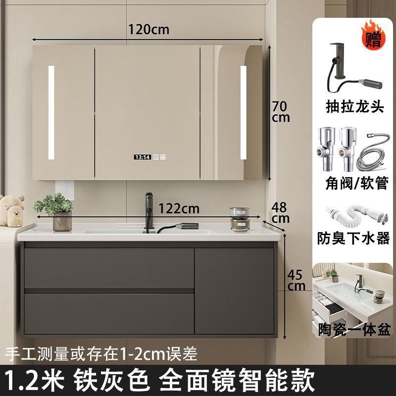 • 아이언 그레이 스마트 풀 미러 캐비닛 - 120cm 세라믹 일체형 세면대 + 액세서리 풀 세트