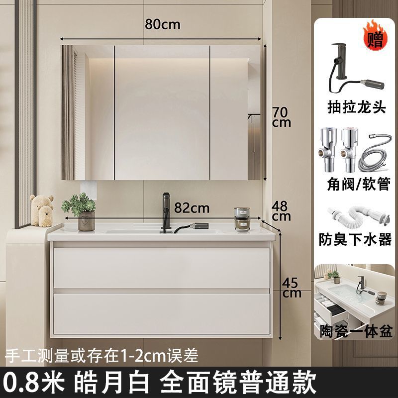 • Haoyue 흰색 일반 전체 거울 캐비닛 - 80cm 세라믹 일체형 세면대 + 액세서리 풀 세트