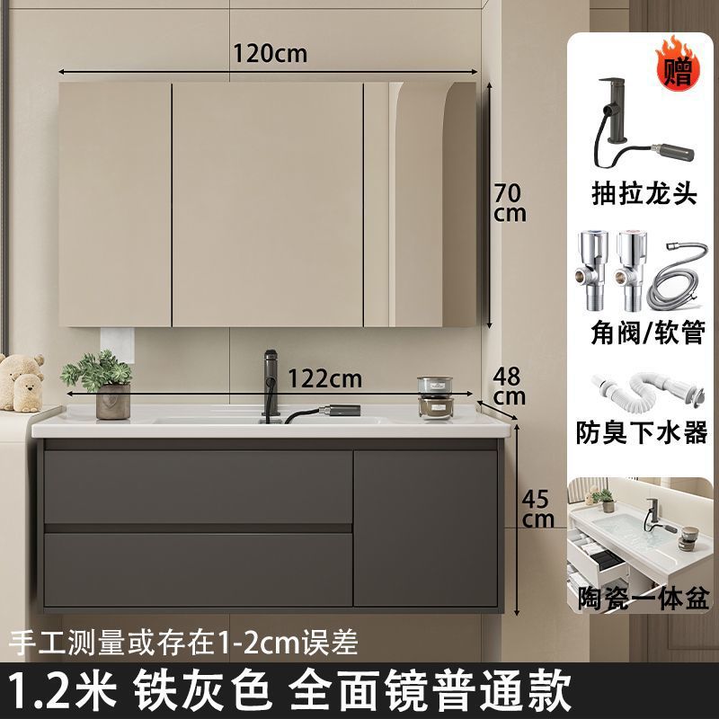 • 아이언 그레이 일반 풀 미러 캐비닛 - 120cm 세라믹 일체형 세면대 + 액세서리 풀 세트