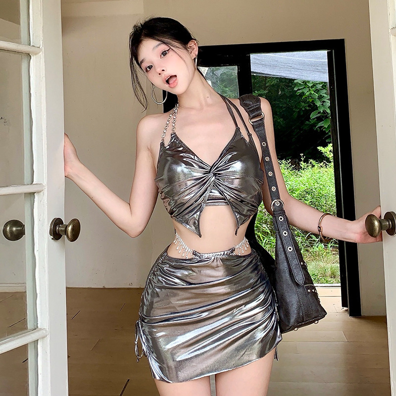 섹시한 태국 스타일 뜨거운 소녀 수영복 여성 Instagram 스타일 분할 스커트 3 피스 세트 나이트 클럽 스타일 실버 스커트 온천 수영복