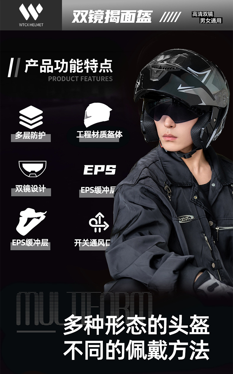 3.镜片:双镜片,外镜PC透明,内镜防晒。