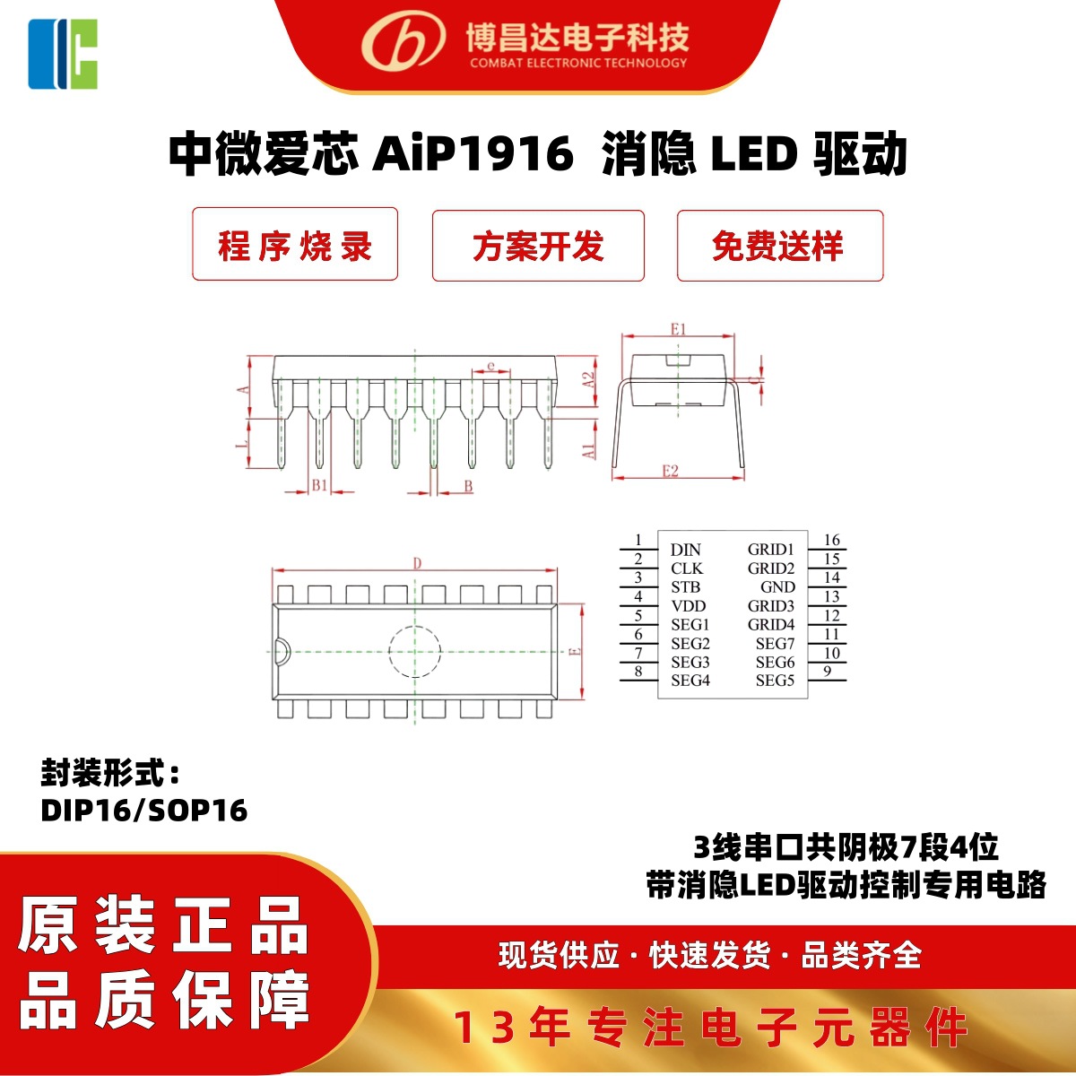오리지널 마이크로 Aixin AiP1916 SOP16 3 와이어 직렬 포트 캐소드 7 세그먼트 4 비트 블랭킹 LED 드라이버