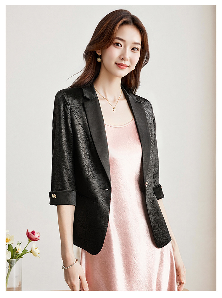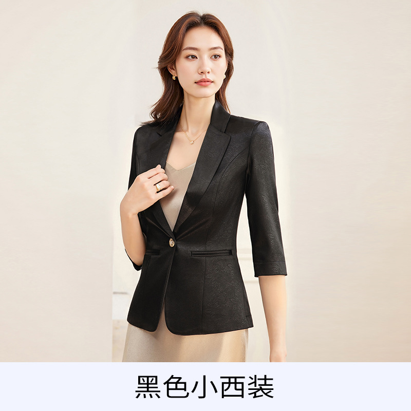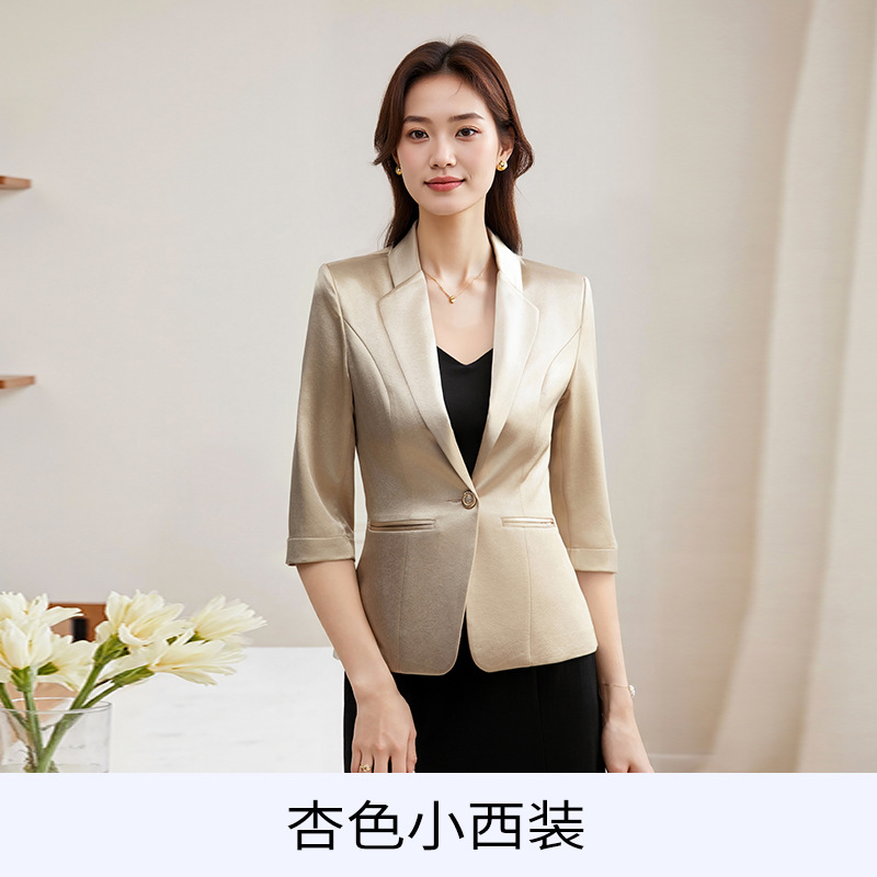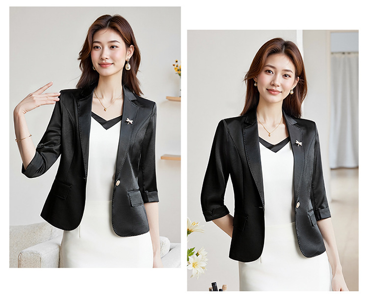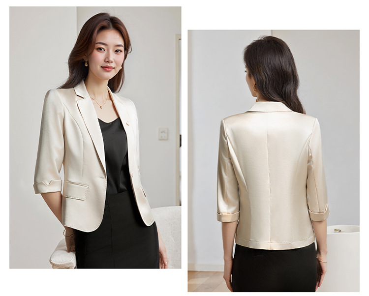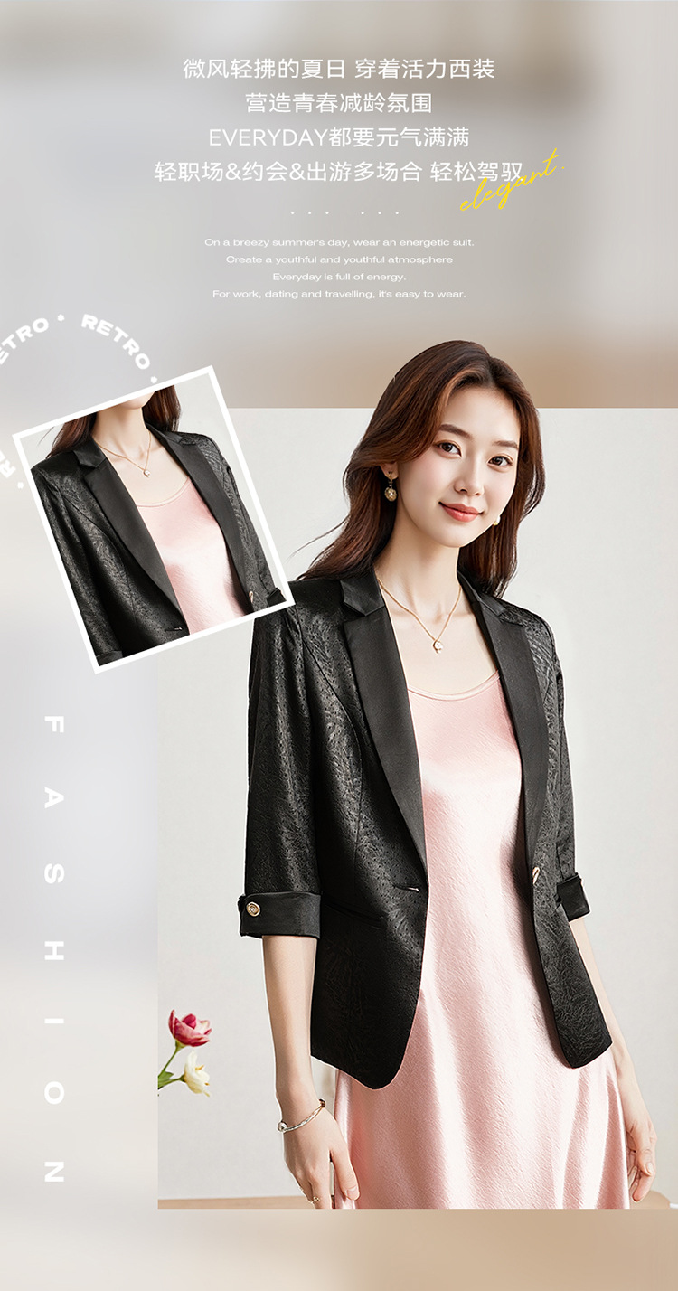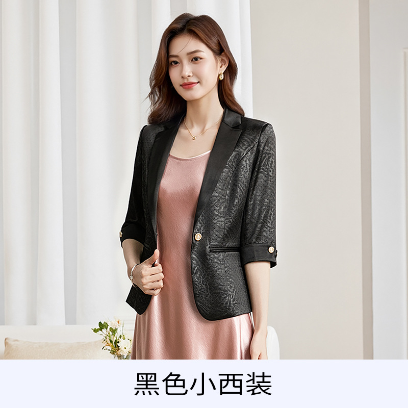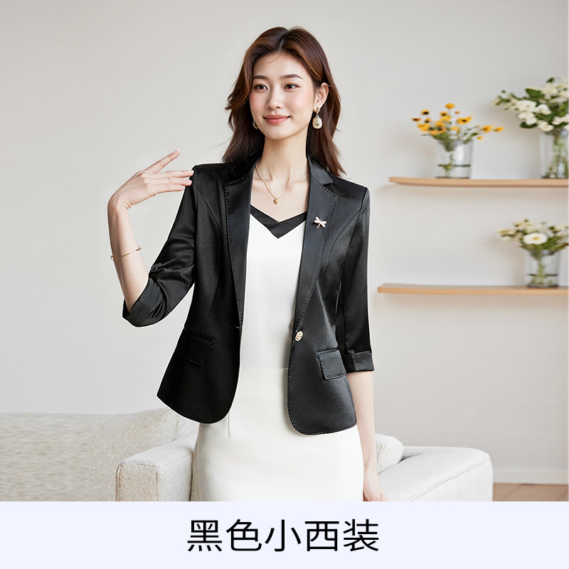 블랙 하이 엔드 Acetic Acid Satin 작은 세트 자켓 여성의 처진 여름 얇은 2025 새로운 도착 7 점 슬리브 탑스토어 가기