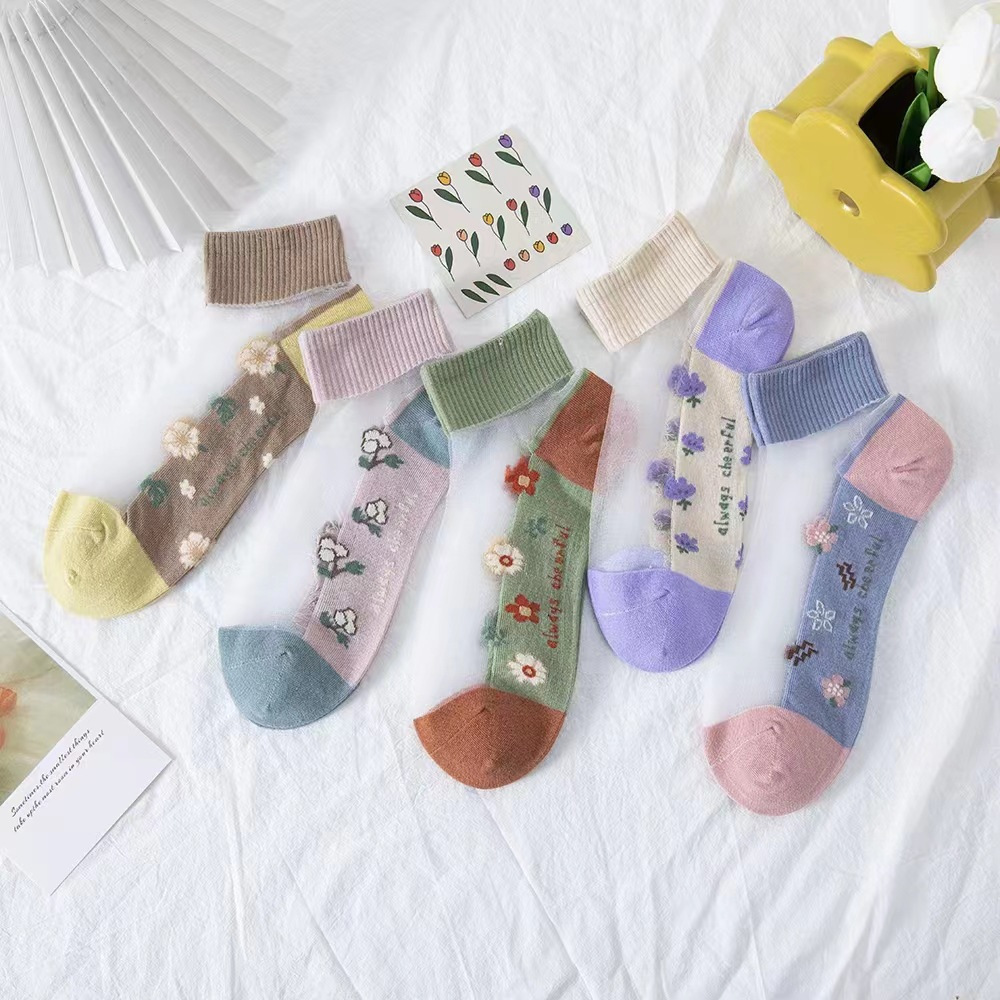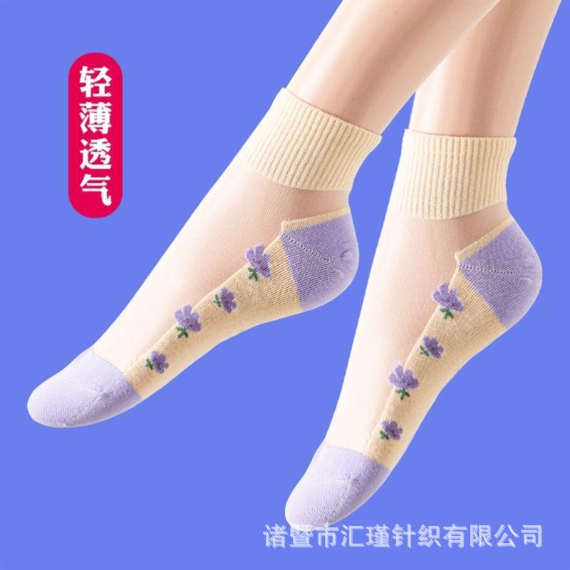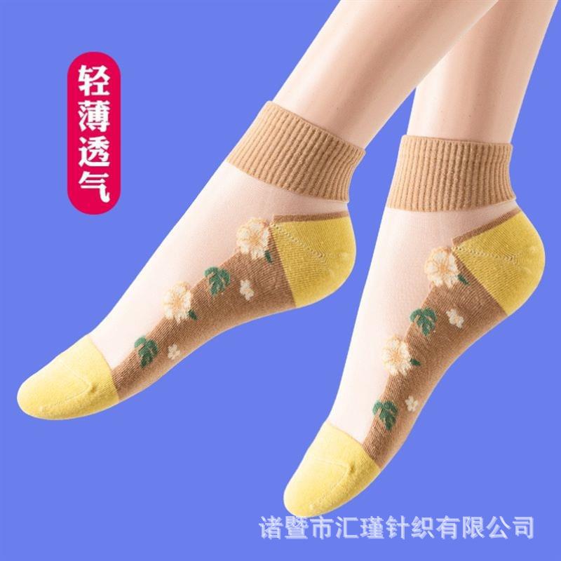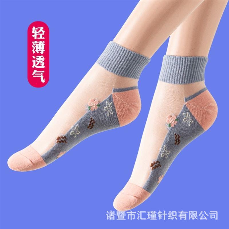 여름 얼음 실크 짧은 튜브 면 하단 크리스탈 양말 유리 실크 짧은 자수 캐럿 보트 양말 통기성 안티 후크 실크 여성용 실크 스타킹