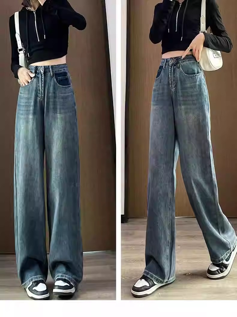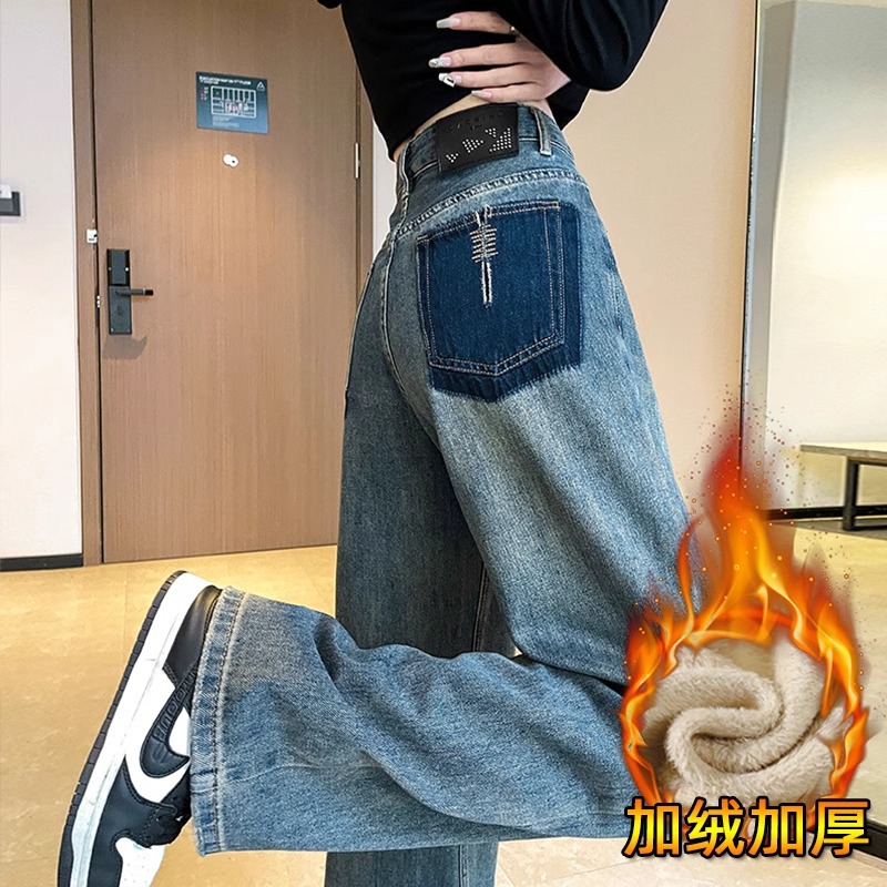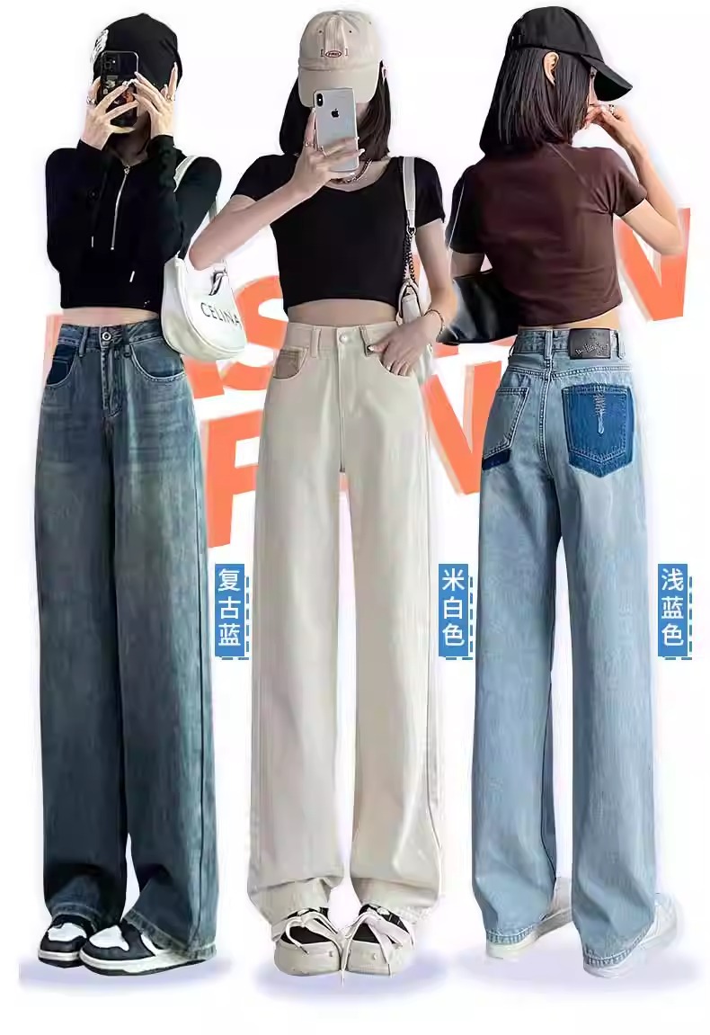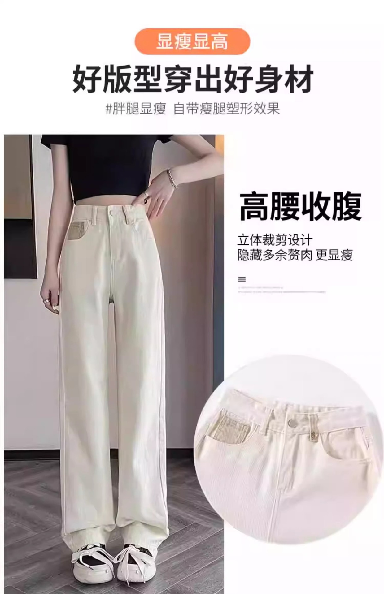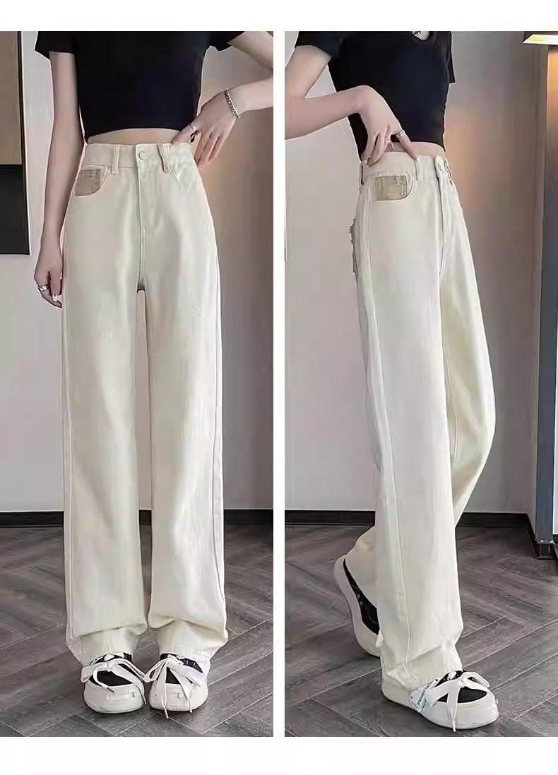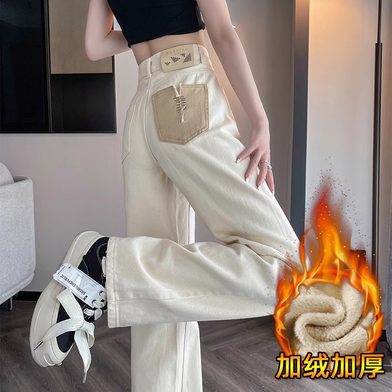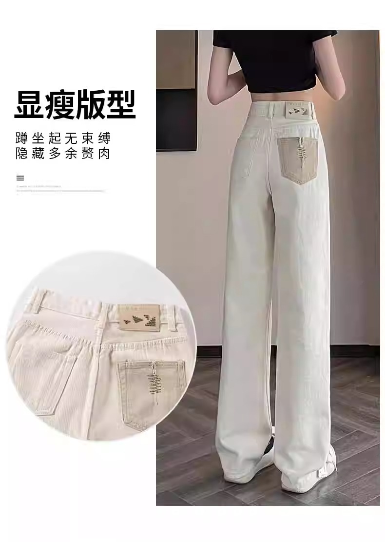 화이트 청바지 여성의 스트레이트 2025 봄과 가을 기모 새로운 아이보리 작은 디자인 감각 좁은 넓은 다리 바지스토어 가기