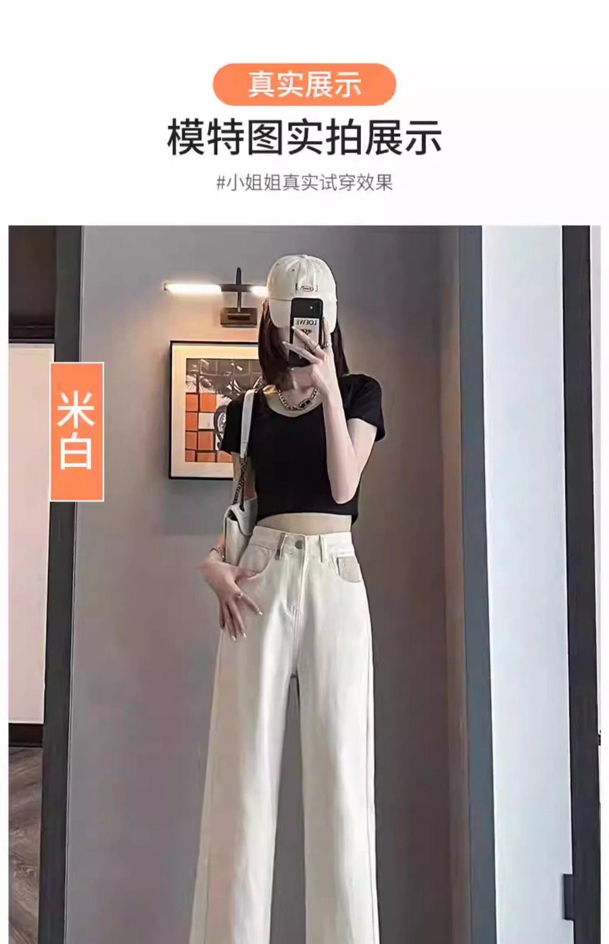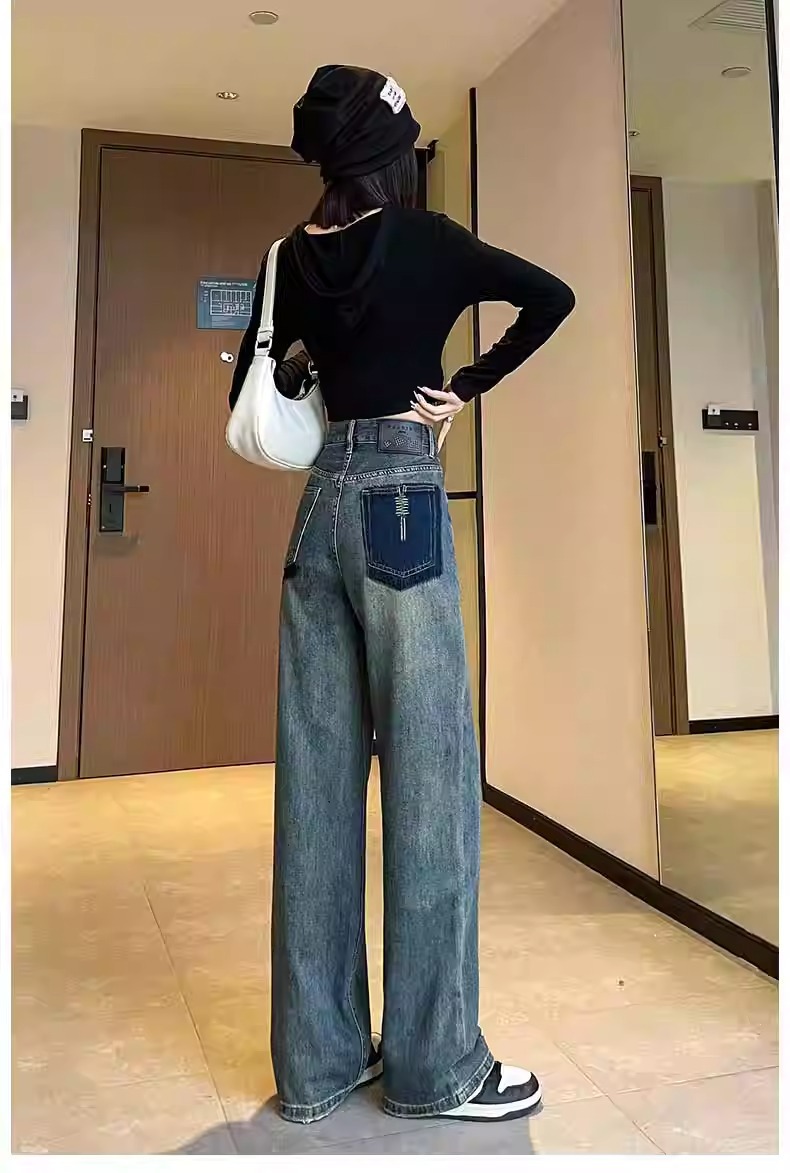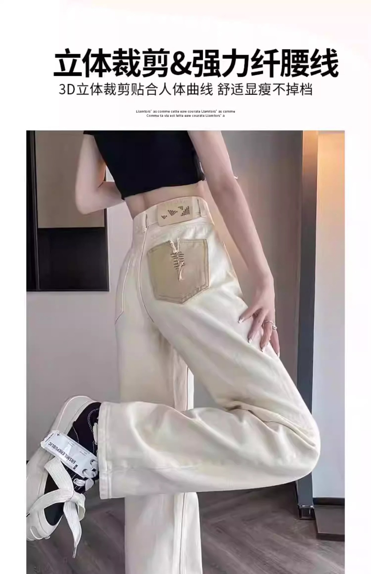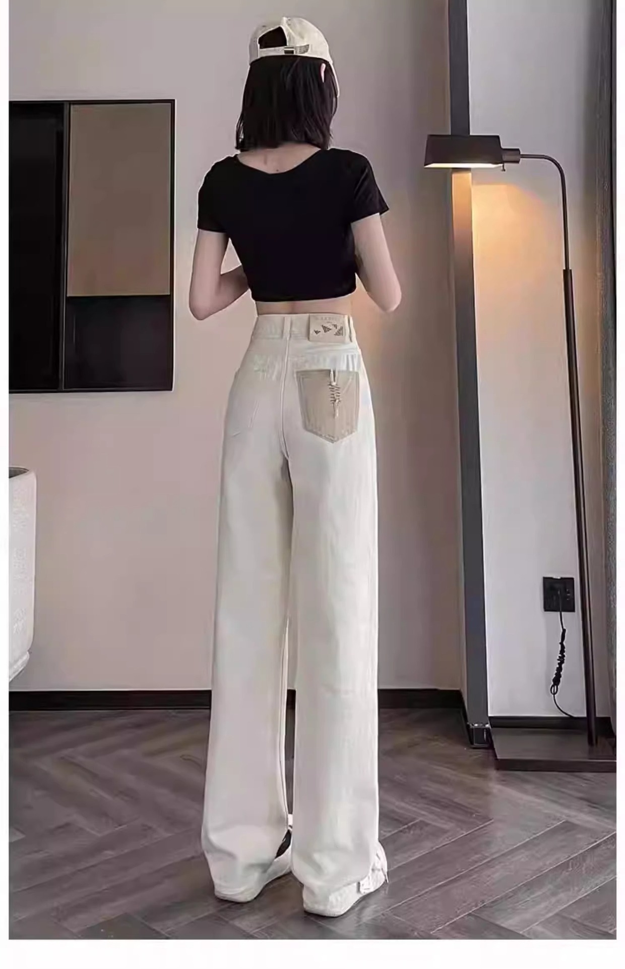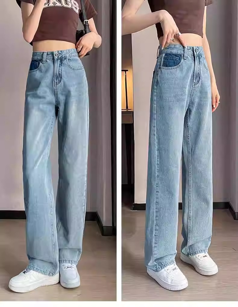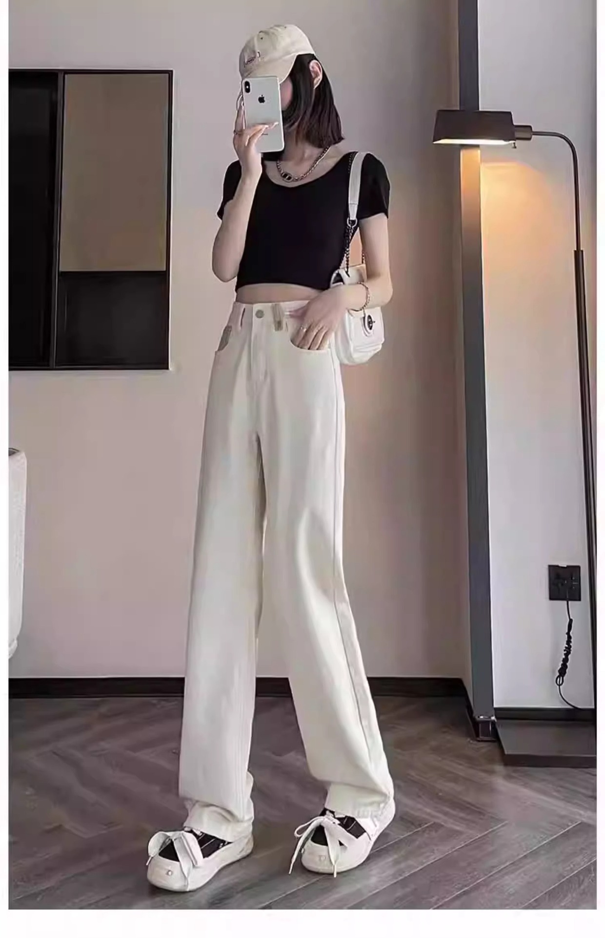 화이트 청바지 여성의 스트레이트 2025 봄과 가을 기모 새로운 아이보리 작은 디자인 감각 좁은 넓은 다리 바지스토어 가기