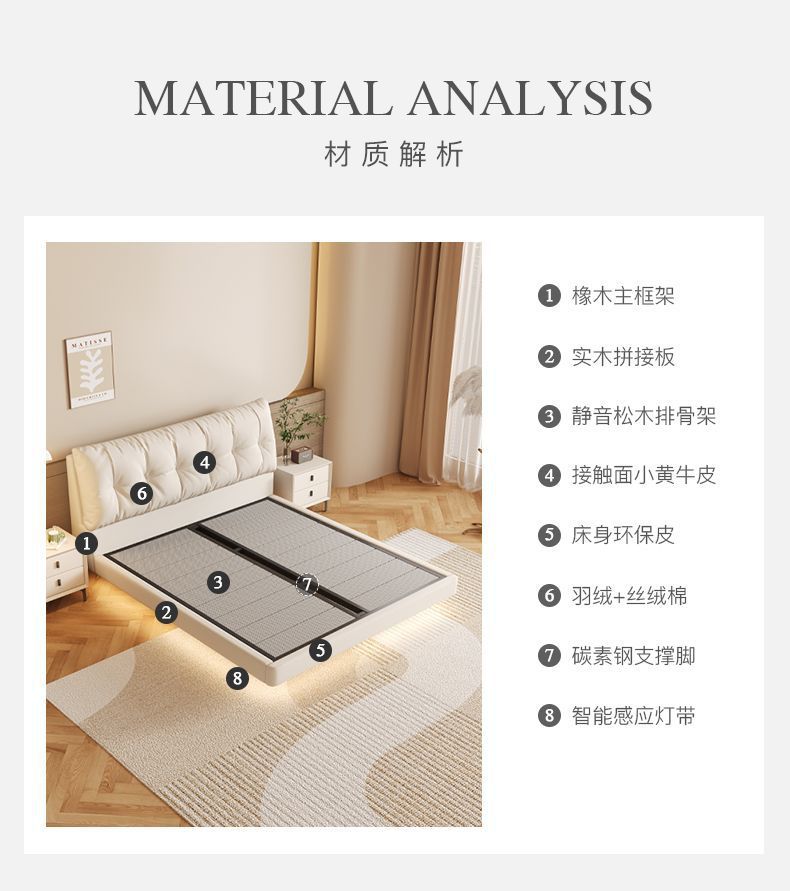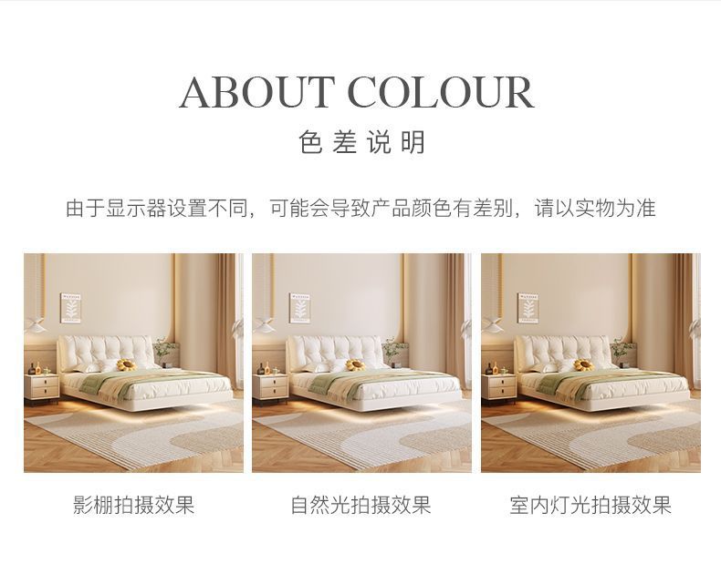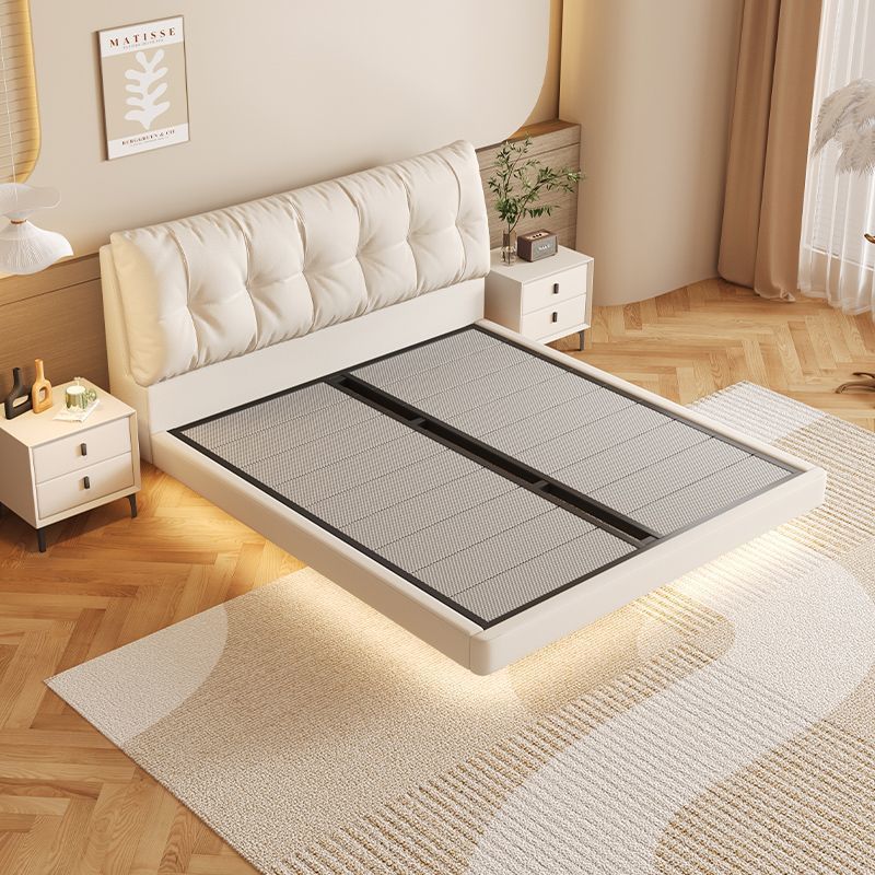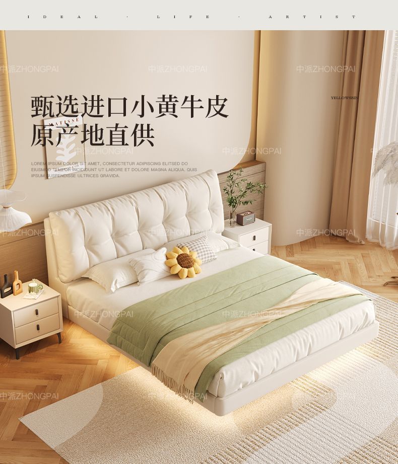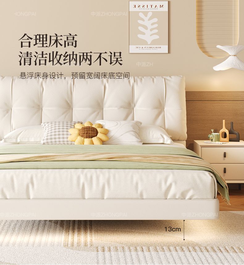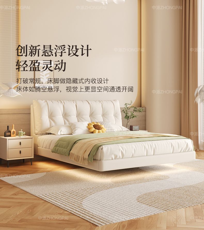 Ruoxing 서스펜션 침대 크림 스타일 라이트 럭셔리 가죽 침대 현대 간단한 홈 마스터 침실 클라우드 소프트 백 퍼프 가죽 아트 침대