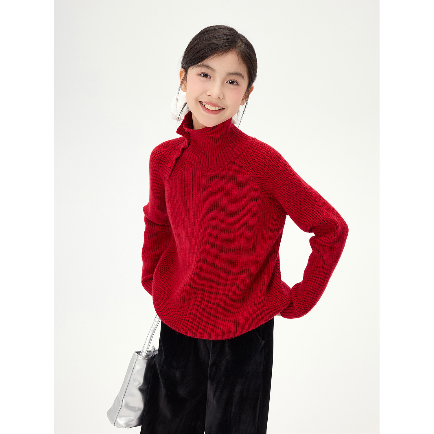 소녀의 새로운 중국 스타일 터틀넥 버클 스웨터 2024 서양식 신년 옷 어린이 두꺼운 니트 스웨터 디자인 탑