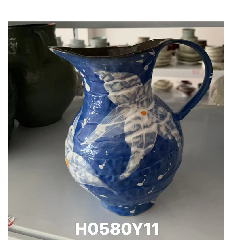 • H0580Y11 단일 손잡이 기울어진 주둥이 냄비 - 파란색 배경 (입 15 높이 20) 흰색 꽃