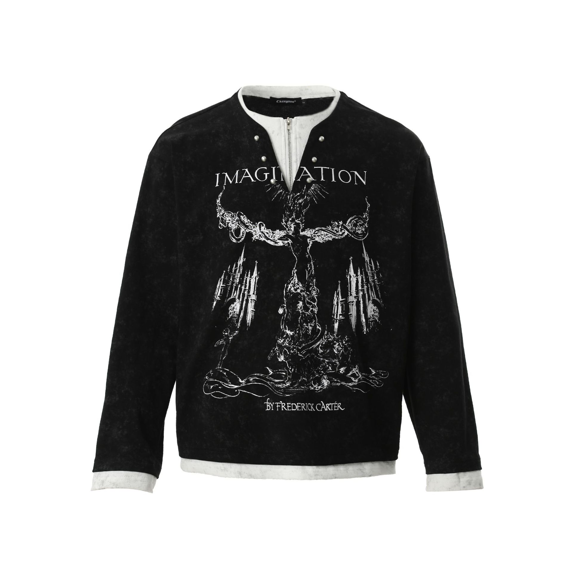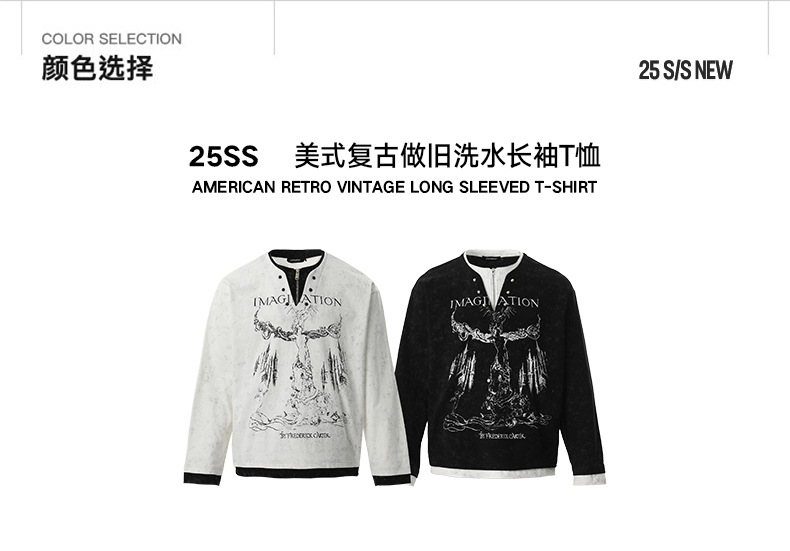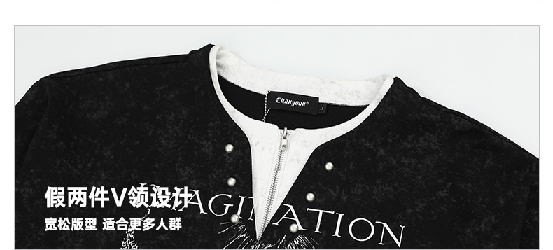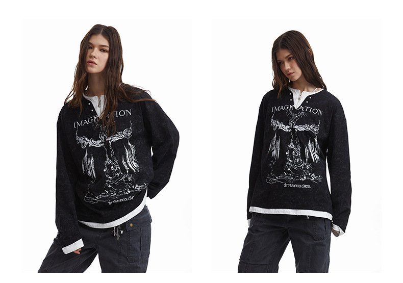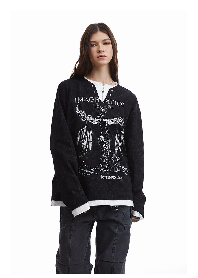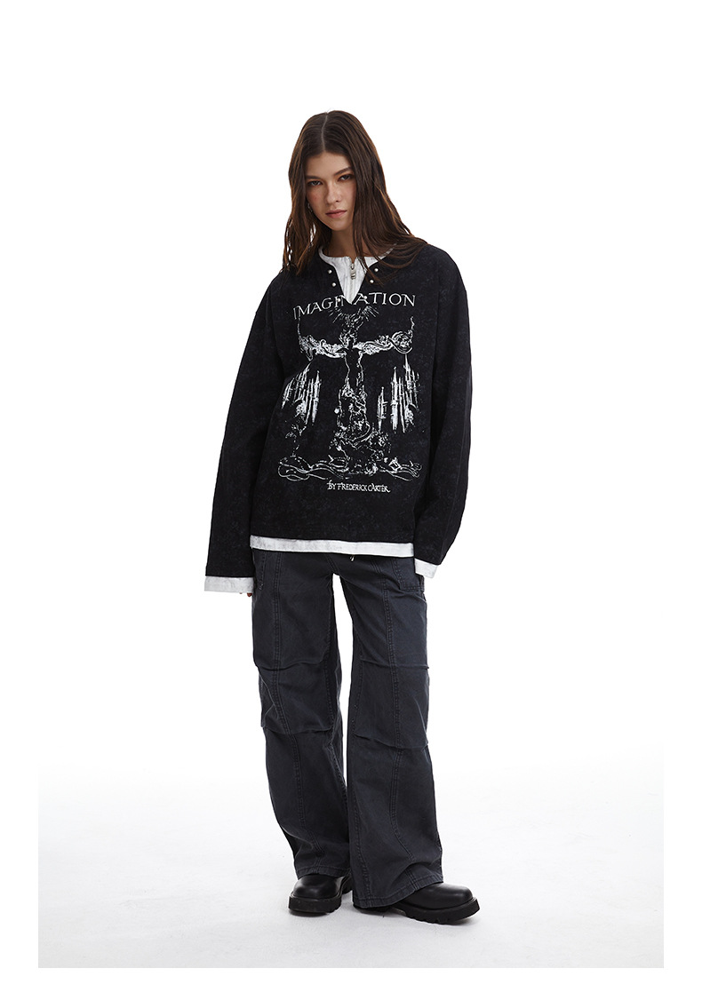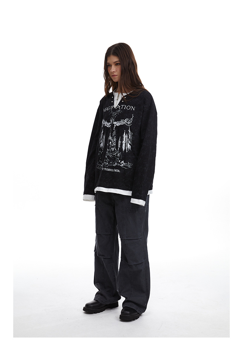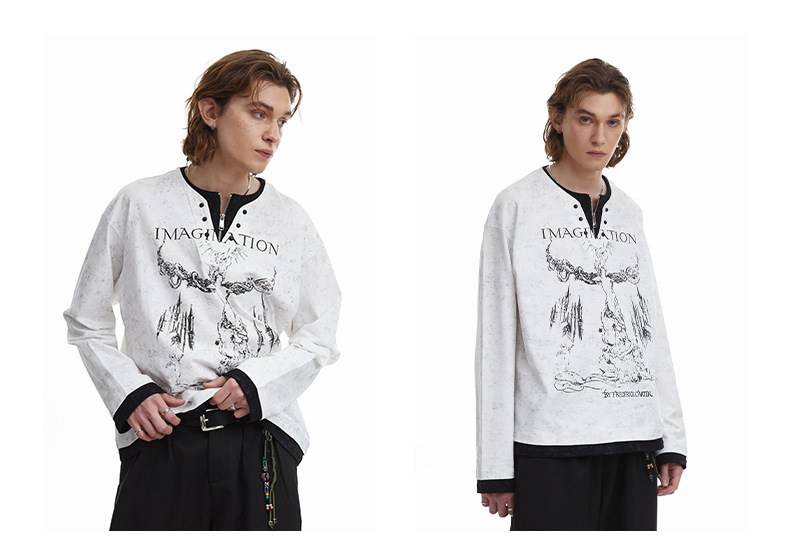 얕은 남성 의류 | 미국 복고풍 펑크 인쇄 진주 버클 가짜 두 긴팔 티셔츠 남성 가을 느슨한 슬리밍