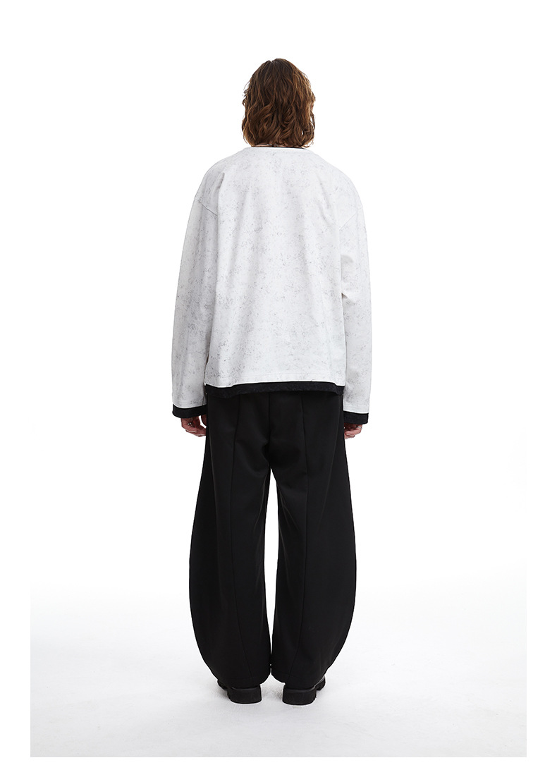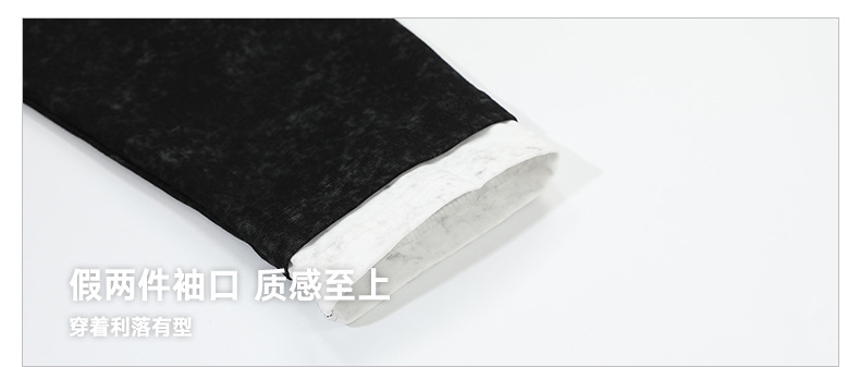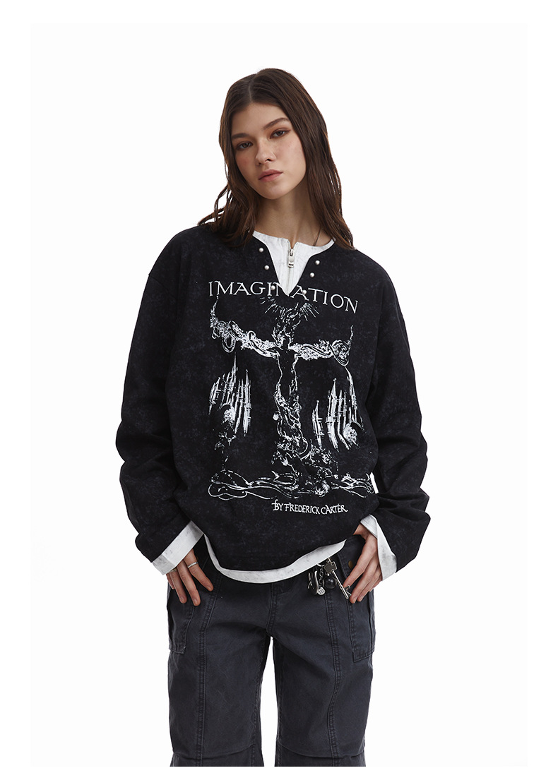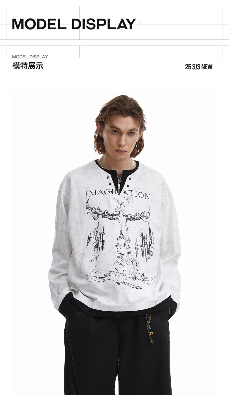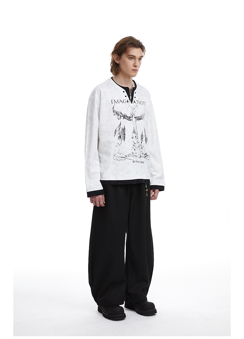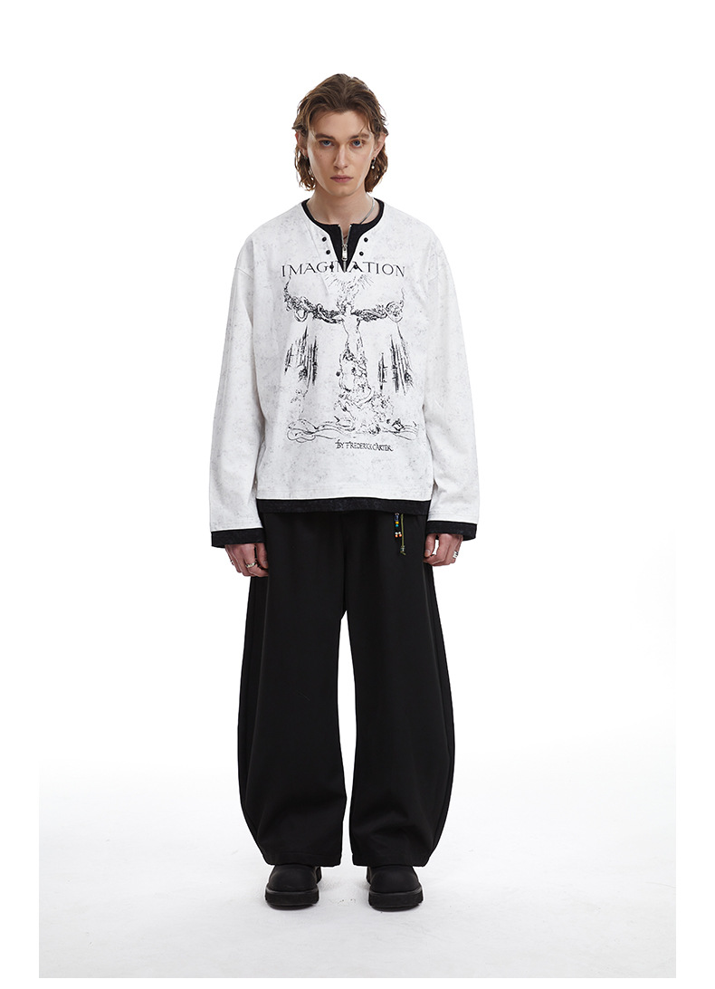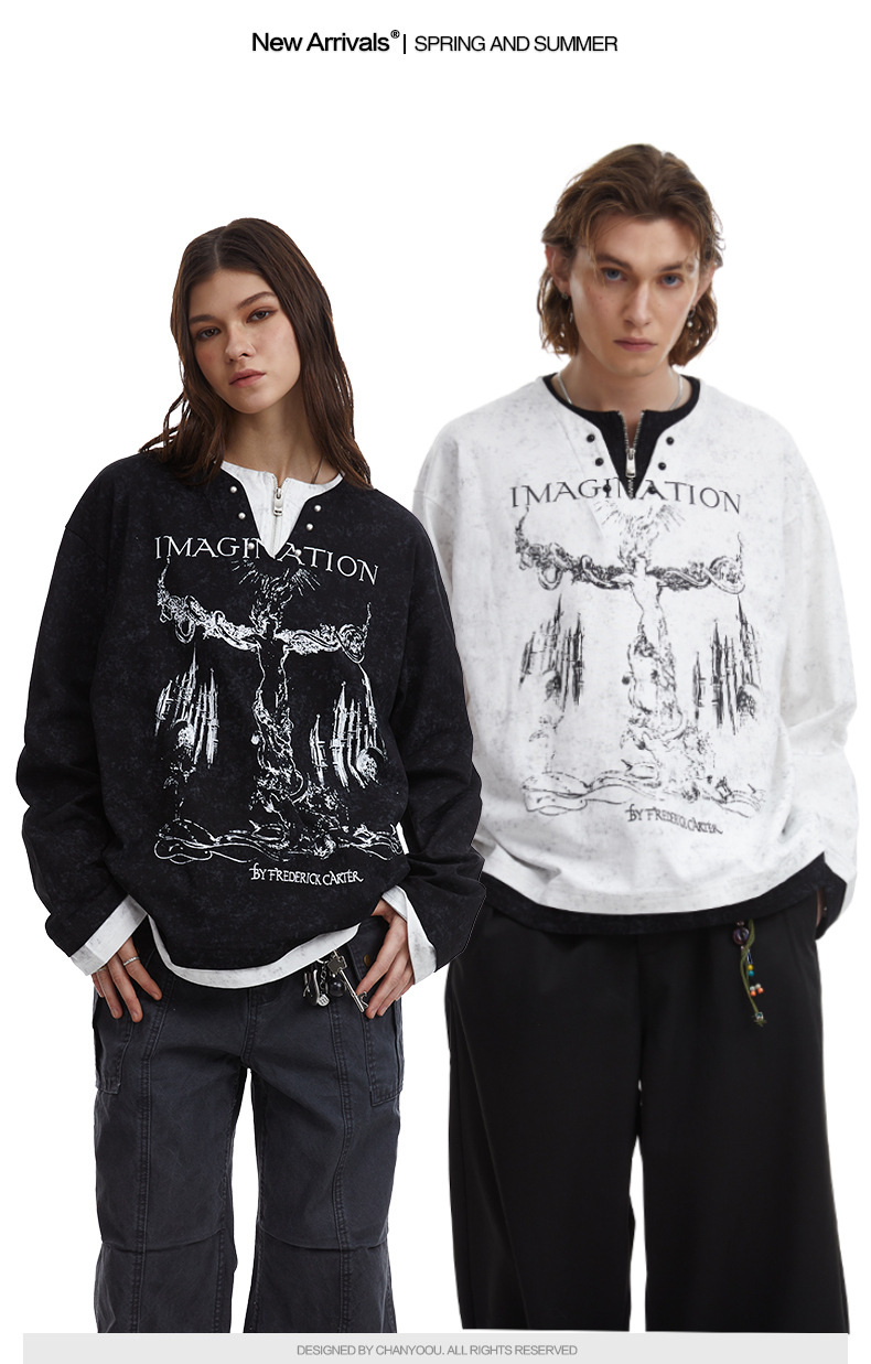 얕은 남성 의류 | 미국 복고풍 펑크 인쇄 진주 버클 가짜 두 긴팔 티셔츠 남성 가을 느슨한 슬리밍