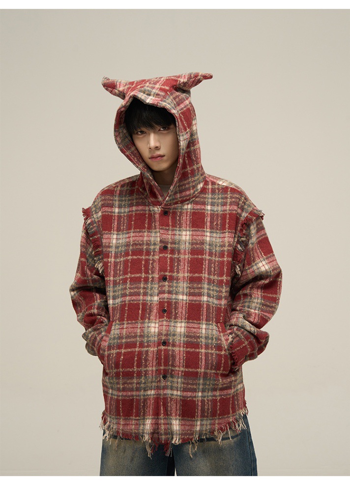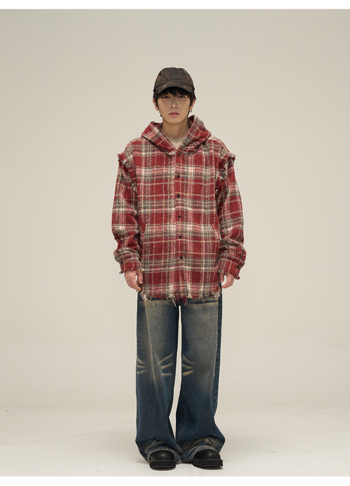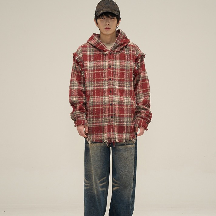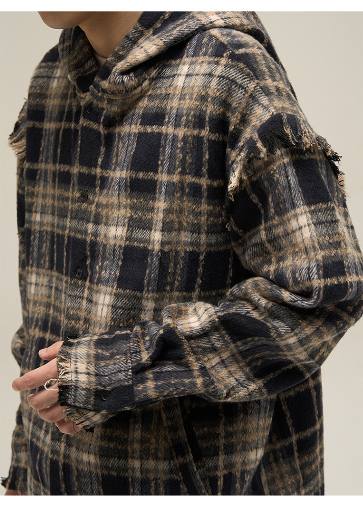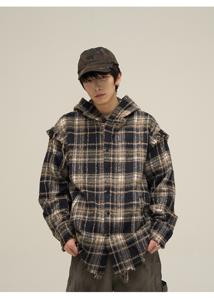 격자 무늬 긴팔 셔츠 남성용 트렌디 브랜드 봄과 가을 일본 스타일 레트로 하이 엔드 루즈 후드 셔츠 남성용 캐주얼 재킷