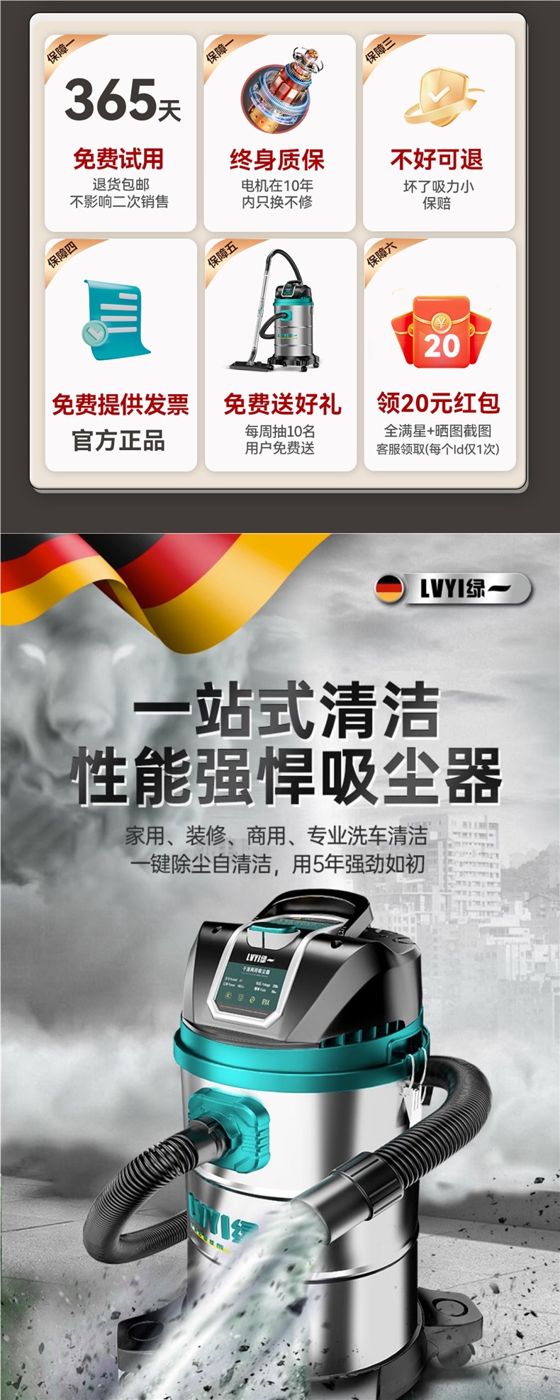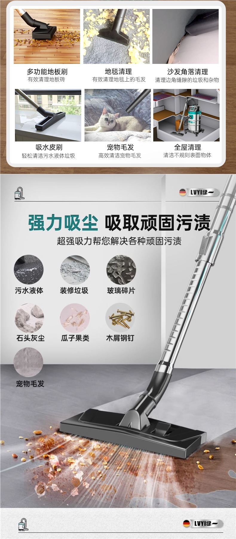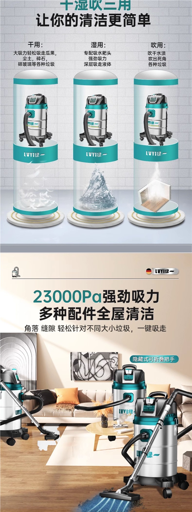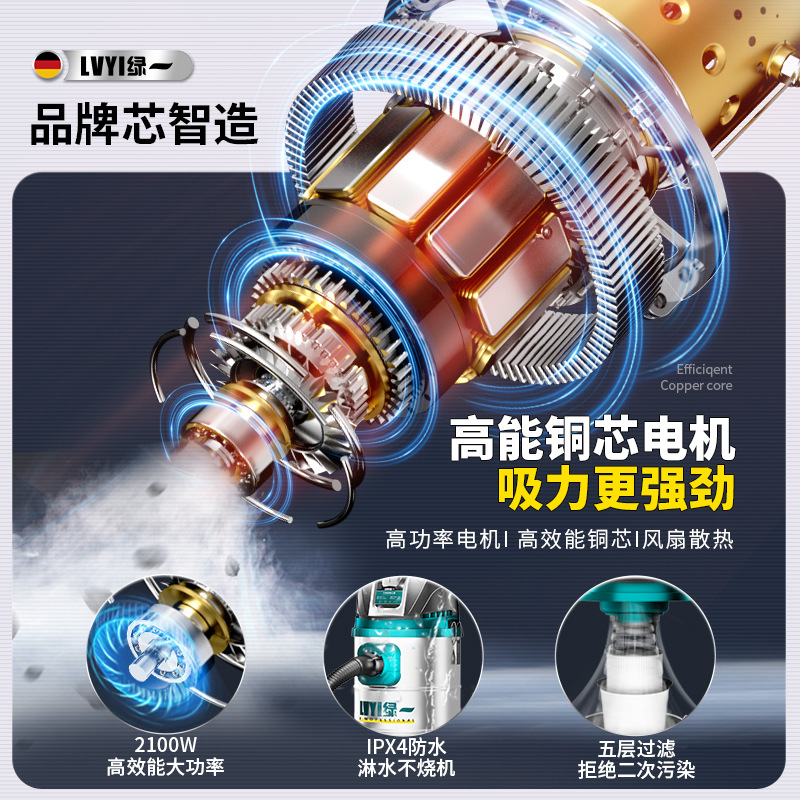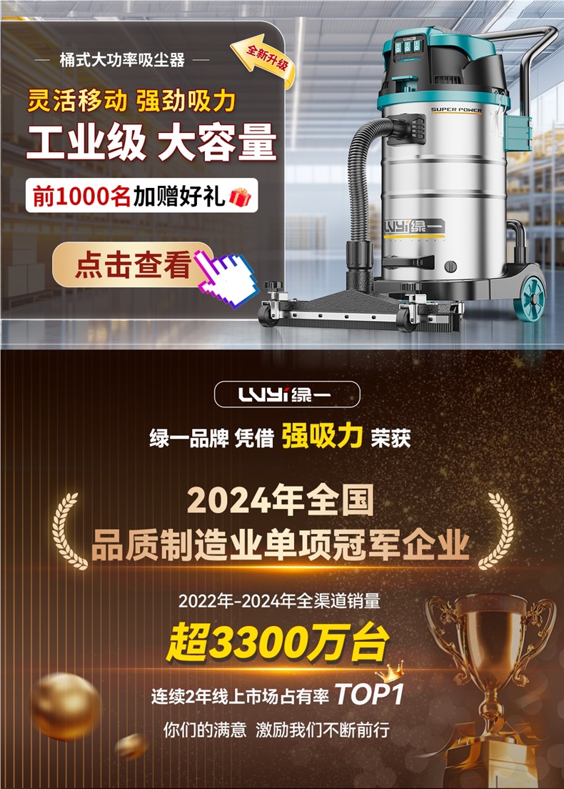 • 3290W-50L [공냉식 모터-99900Pa Pa] 두꺼운 강철 드럼 + 3개의 필터 요소 + 금속 막대 + 걱정 없는 장식 모델