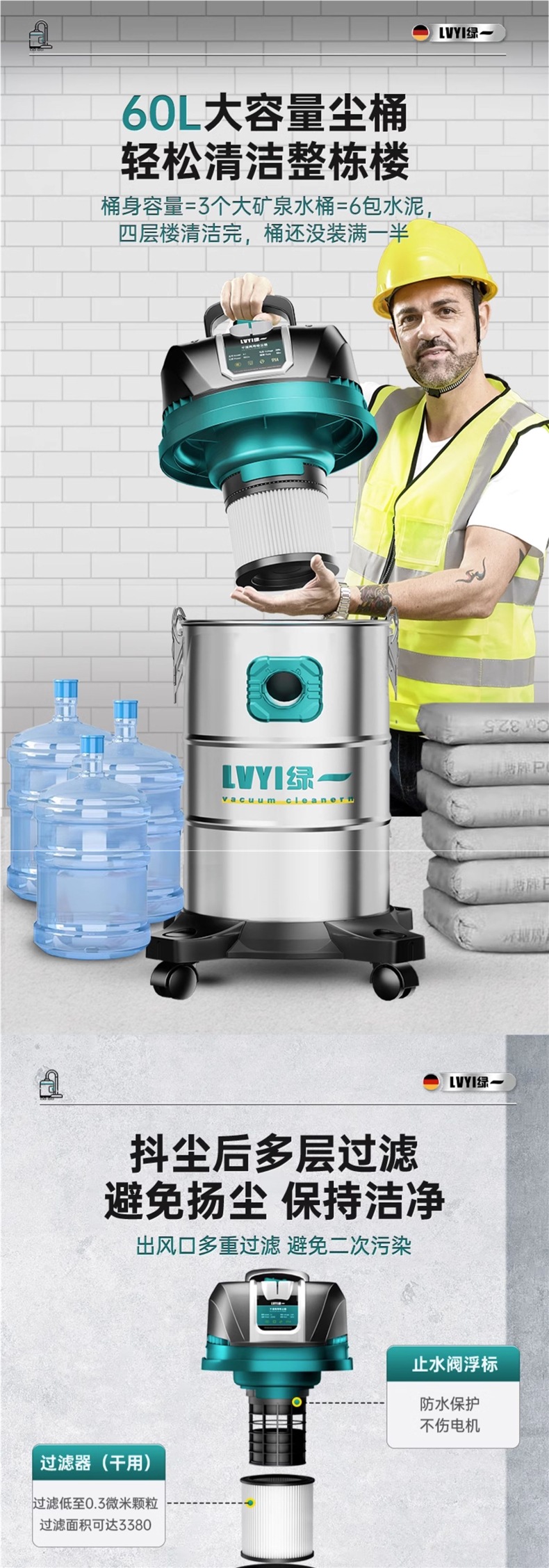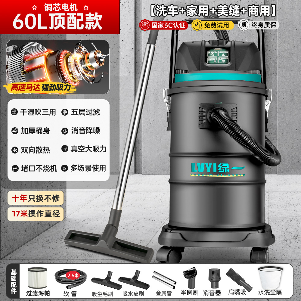 • 3390W-60L [공냉식 모터-99900Pa Pa Pa] 두꺼운 강철 드럼 + 3개의 필터 요소 + 금속 막대 + 다중 장면 사용