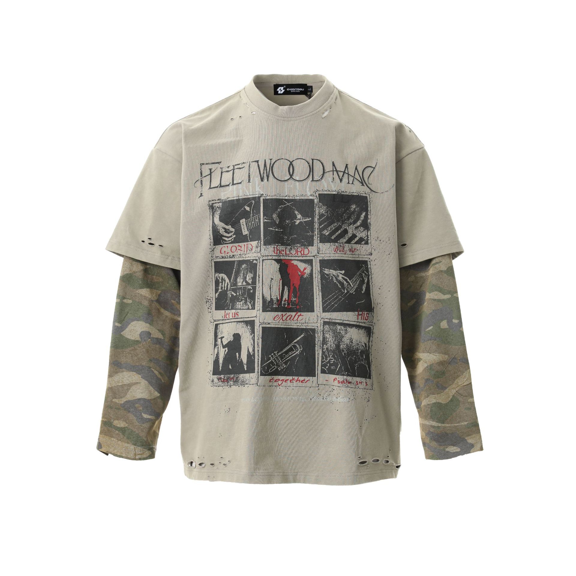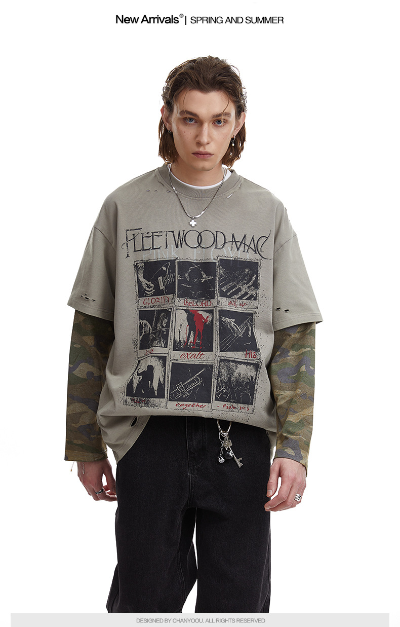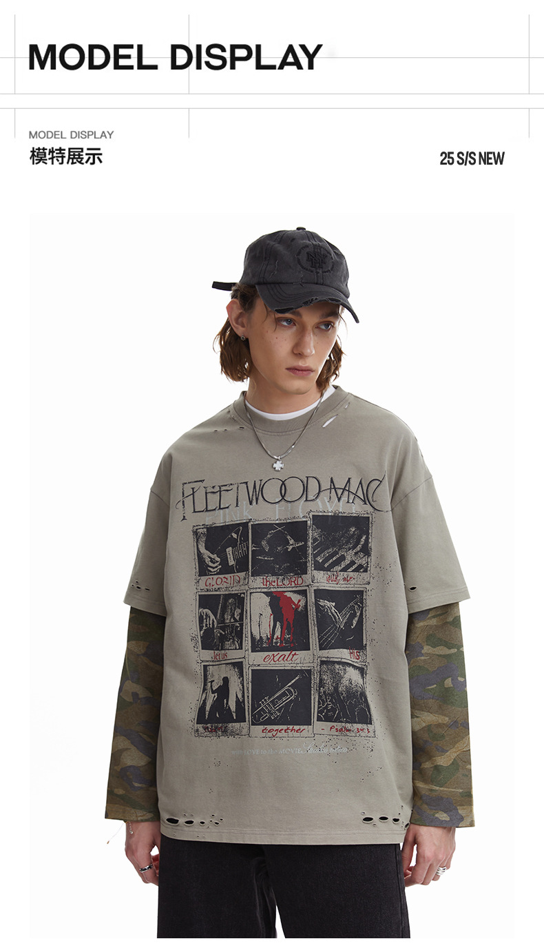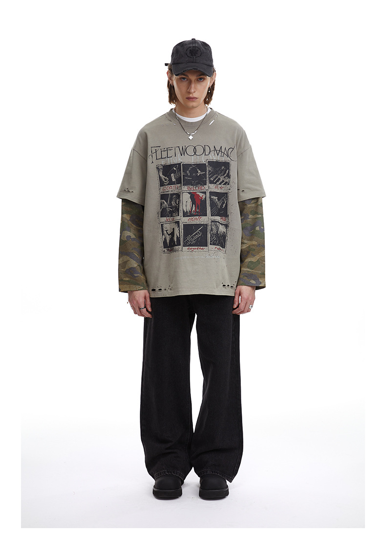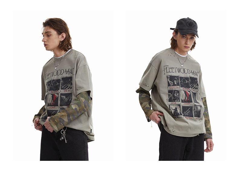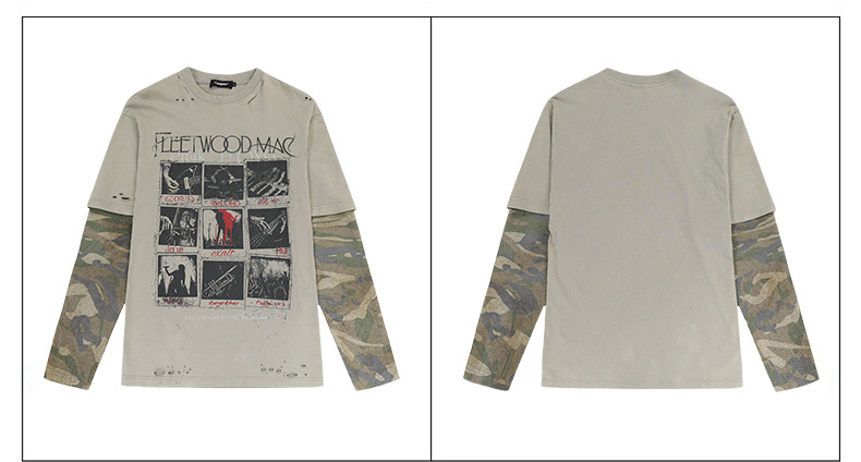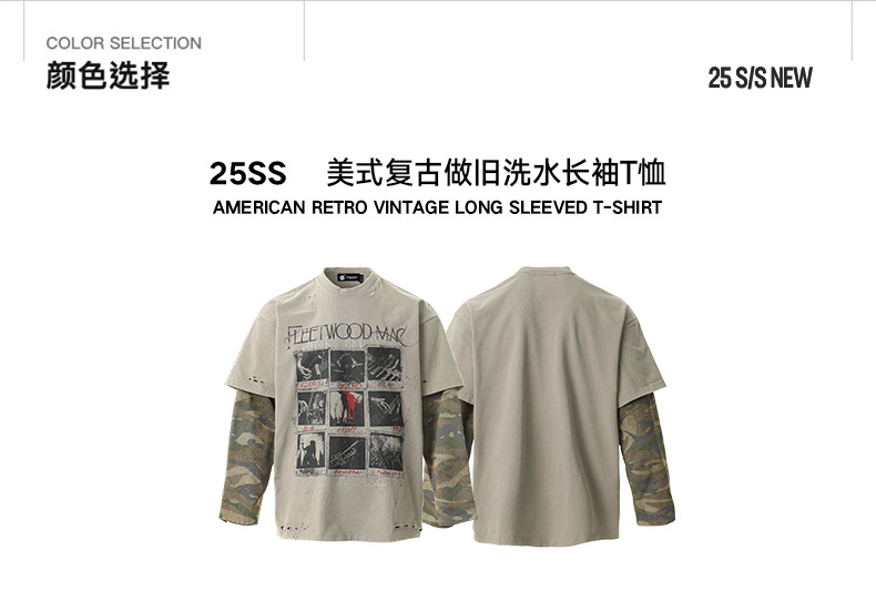 얕은 남성 의류 | 봄 미국 복고풍 가짜 두 긴팔 티셔츠 남성용 러피 잘 생긴 높은 위장 스티칭 재킷스토어 가기
