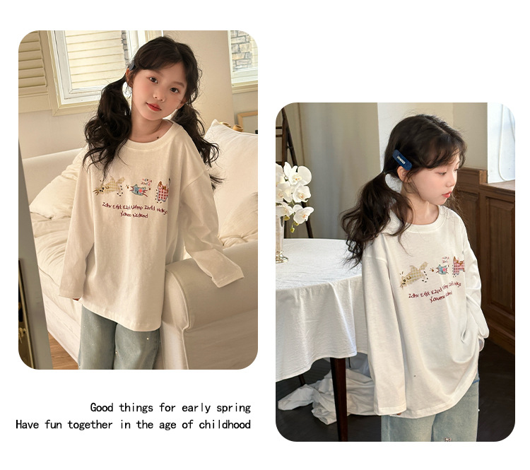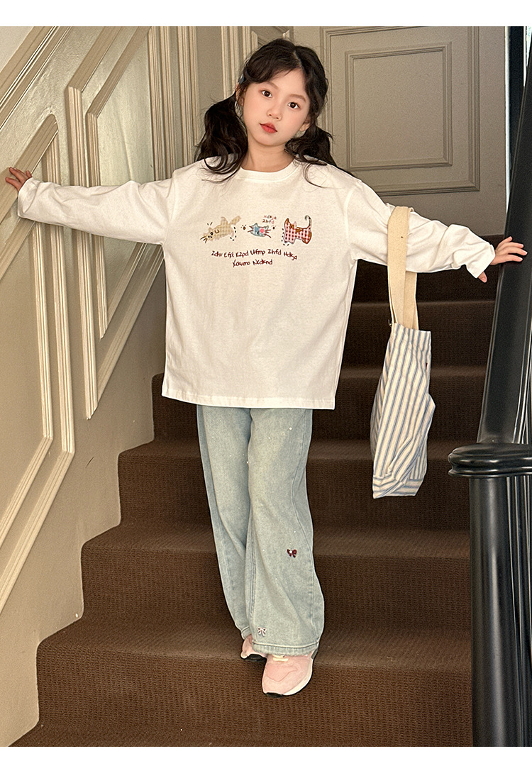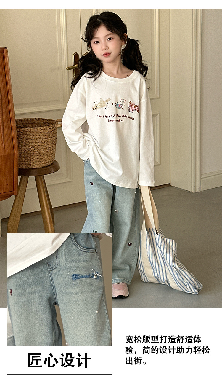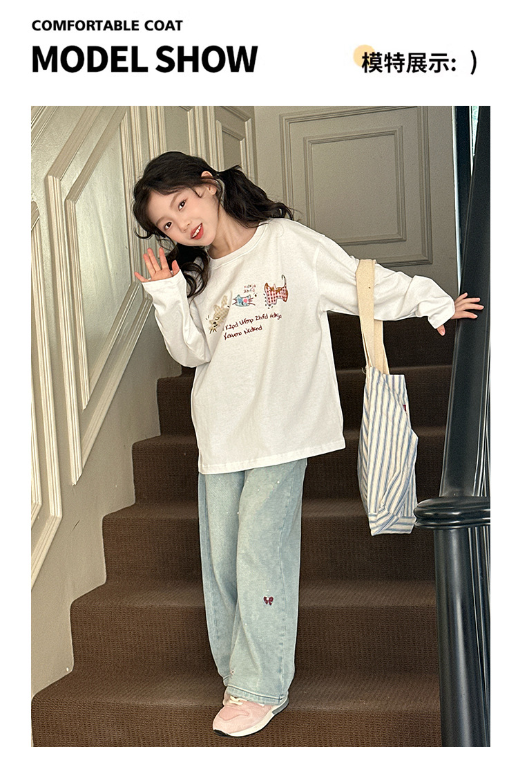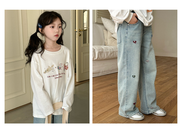 소녀 봄과 가을 2025 새로운 스타일 유행 세트 큰 소년 한국 만화 인쇄 티셔츠 청바지 세트스토어 가기