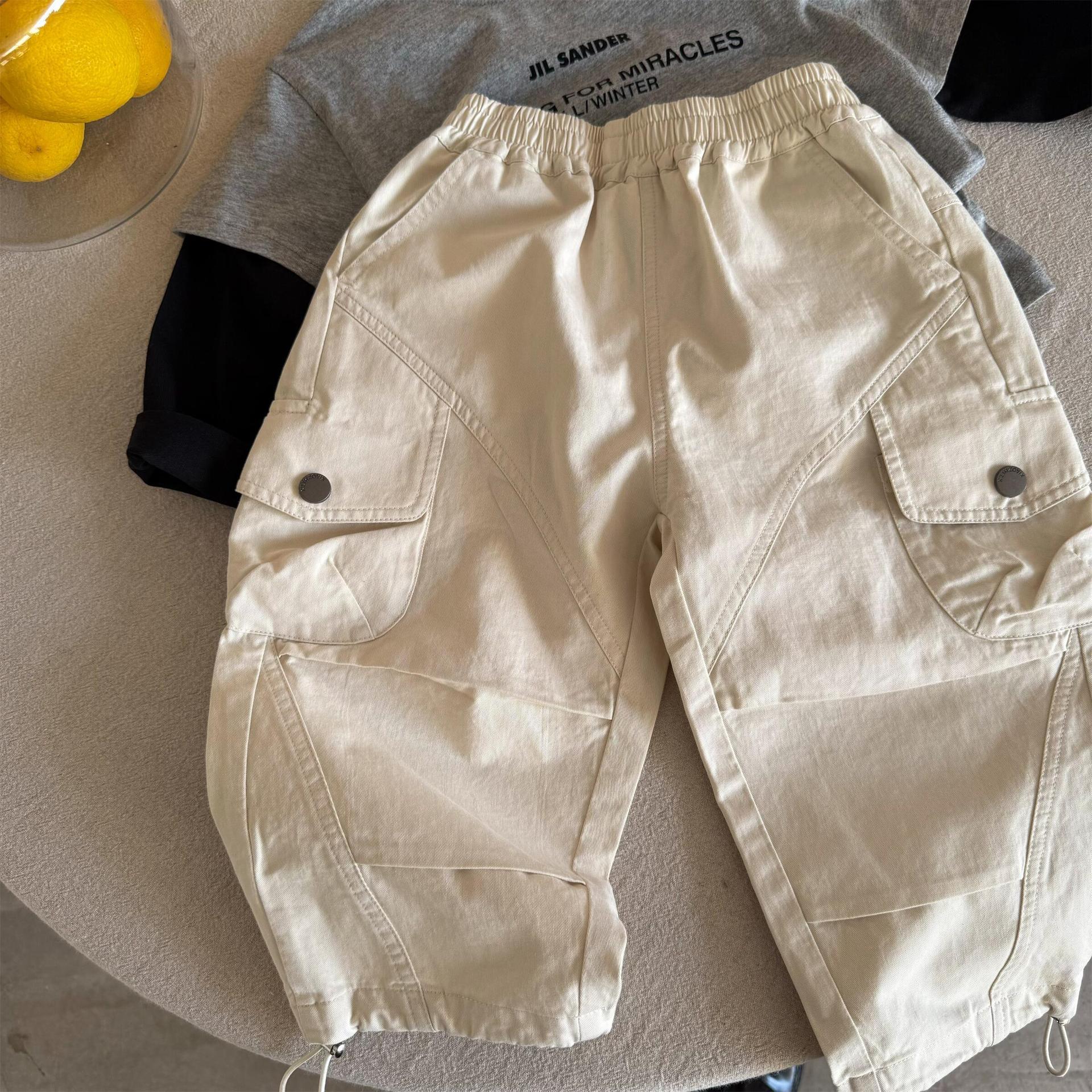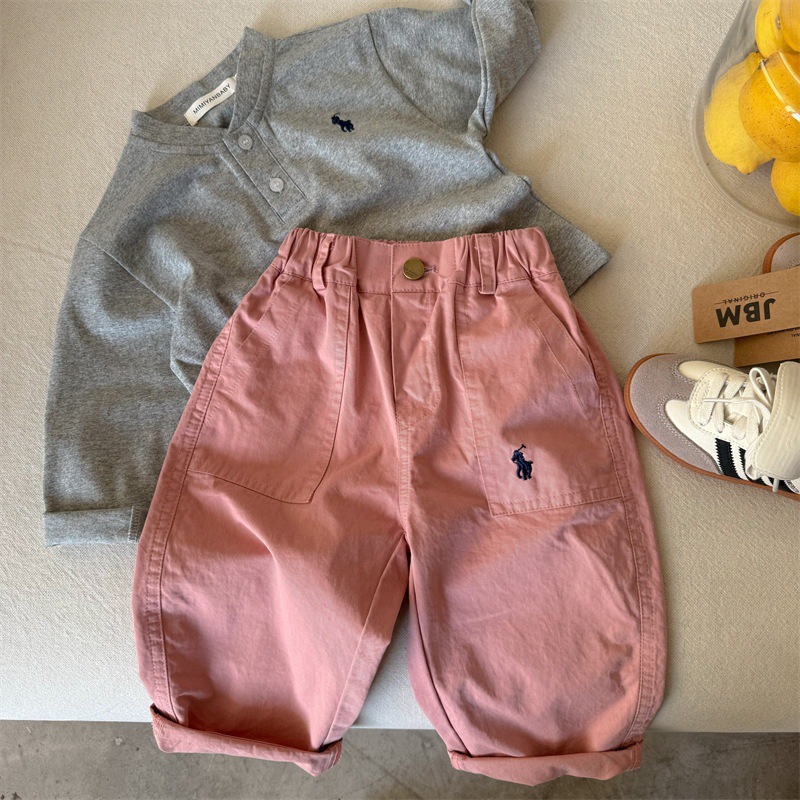 어린이 바지 2025 Lin Lin Mom 봄 소년과 소녀를위한 새로운 단색 포켓 크레인 바지 아기 끈 바지스토어 가기