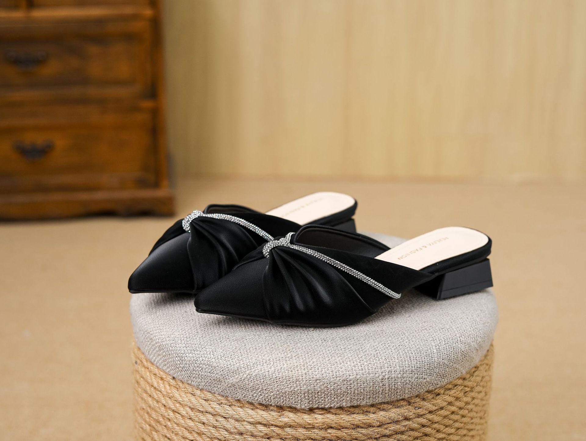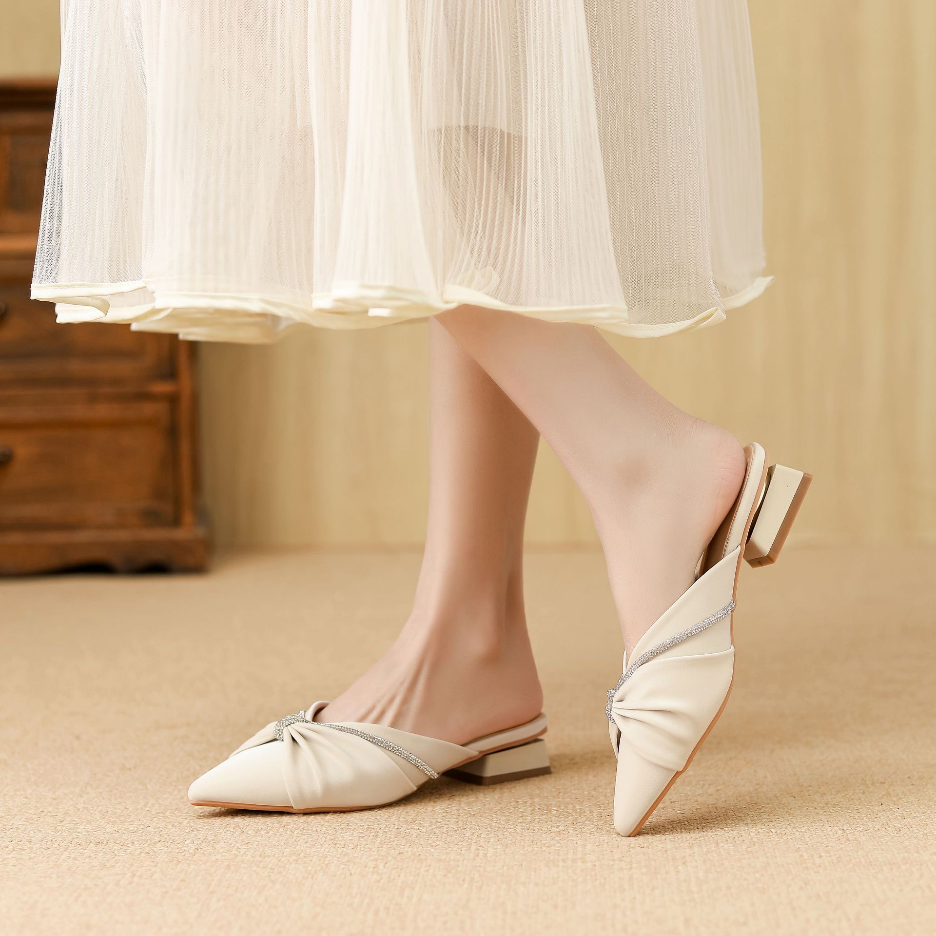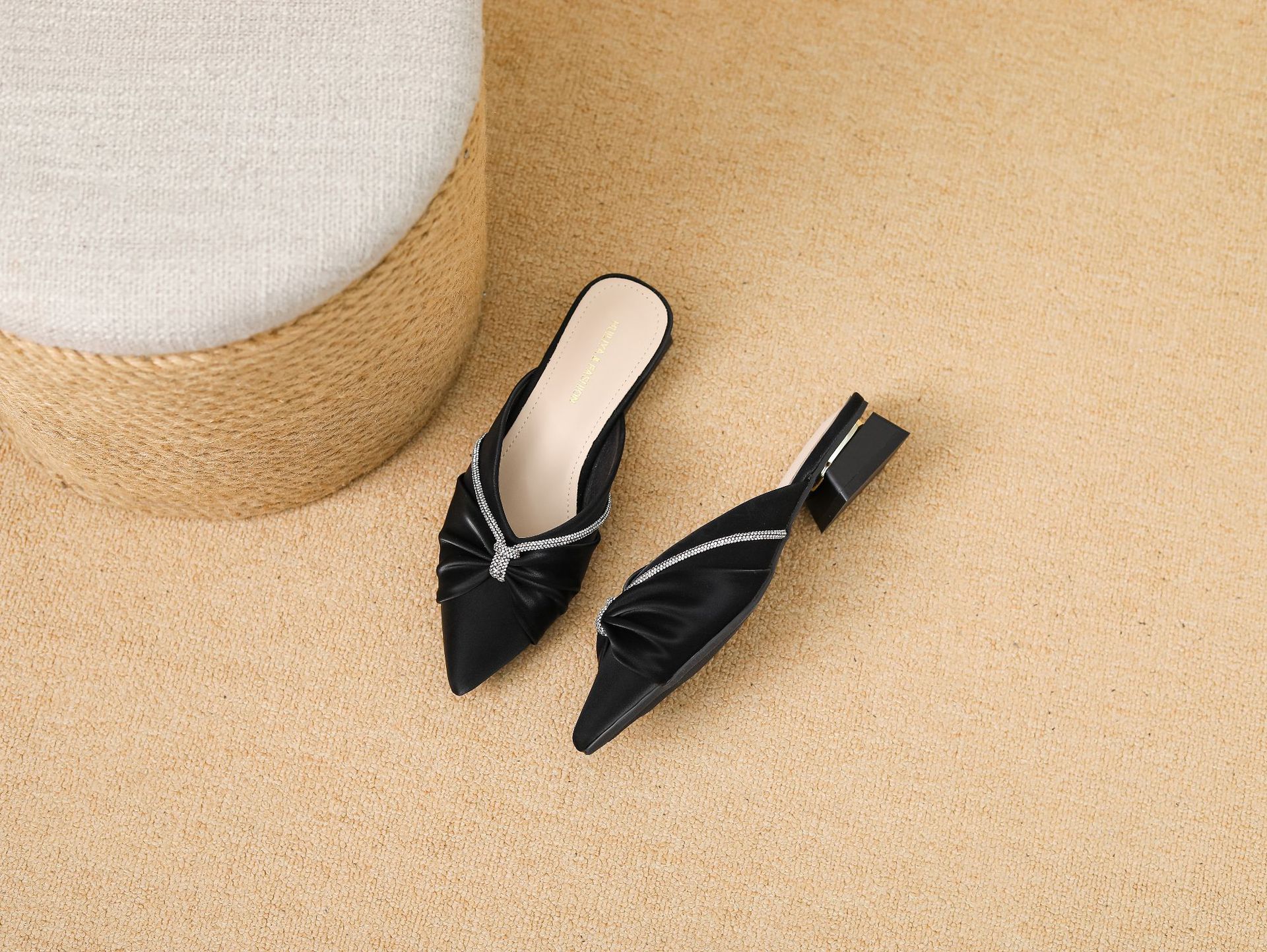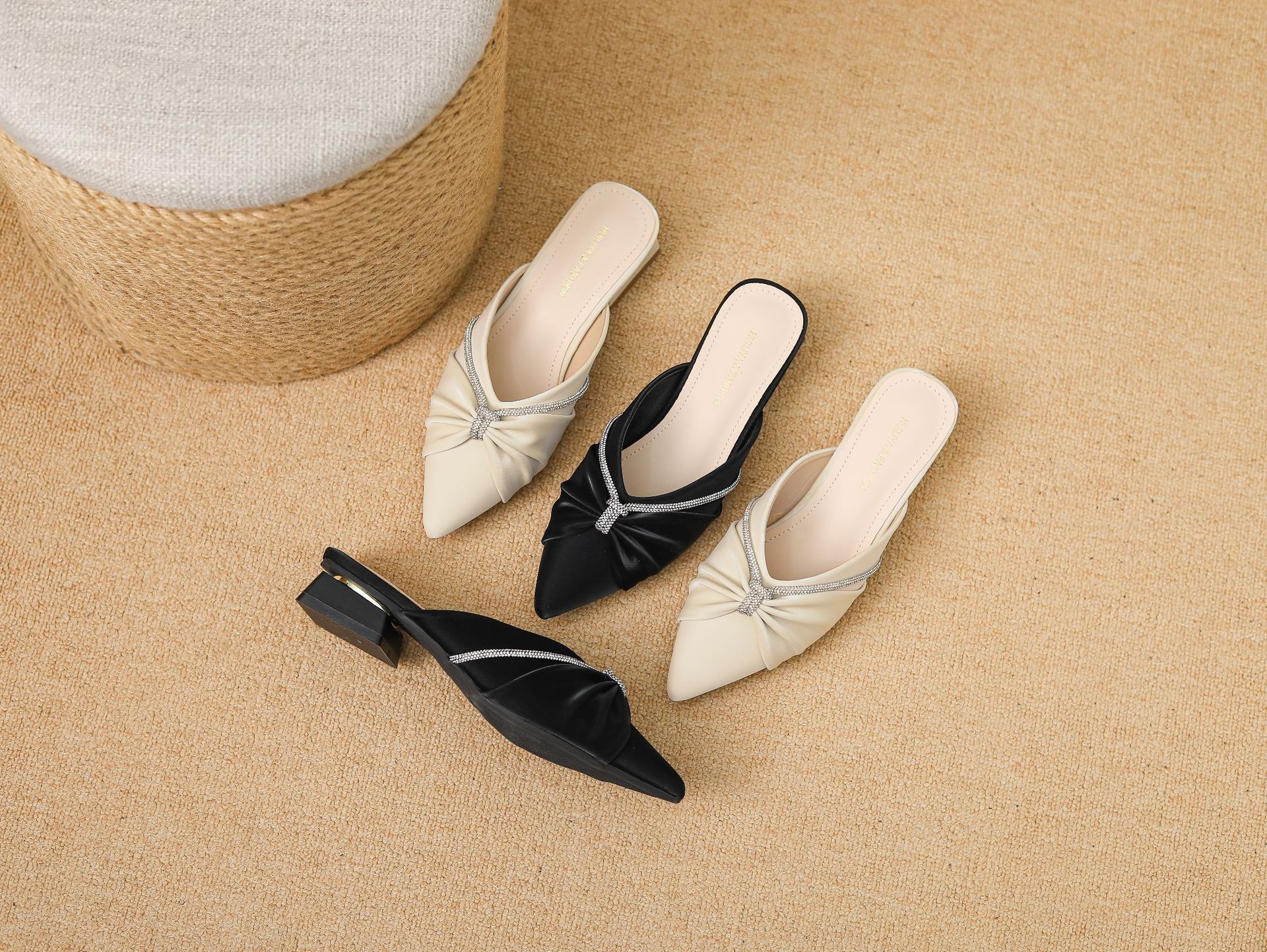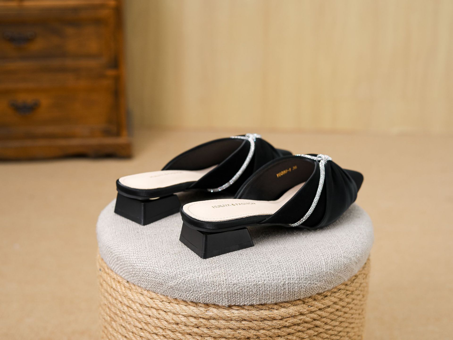 Huiliya Baotou 여성용 하프 슬리퍼 외부 착용 2025 새로운 뾰족한 우아한 프랑스 라인 스톤 뮬러 Y6088-1스토어 가기