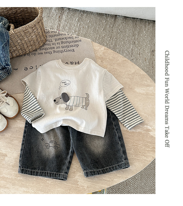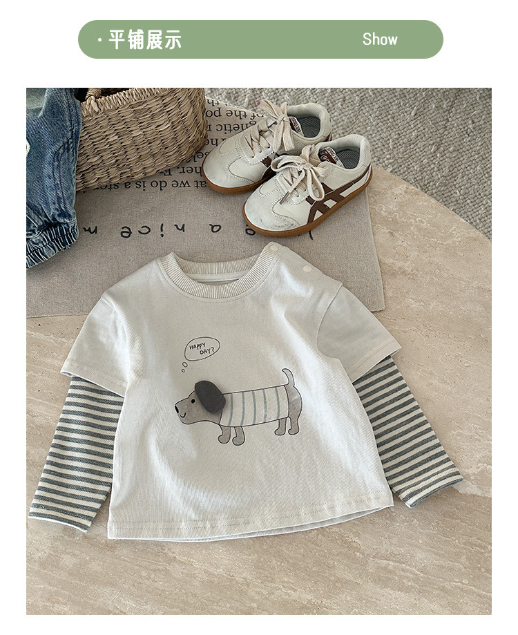 아기 긴팔 티셔츠 가을 신작 아기 가짜 투피스 만화 줄무늬 탑 유아 바닥 셔츠 가을 의류 카테고리 a