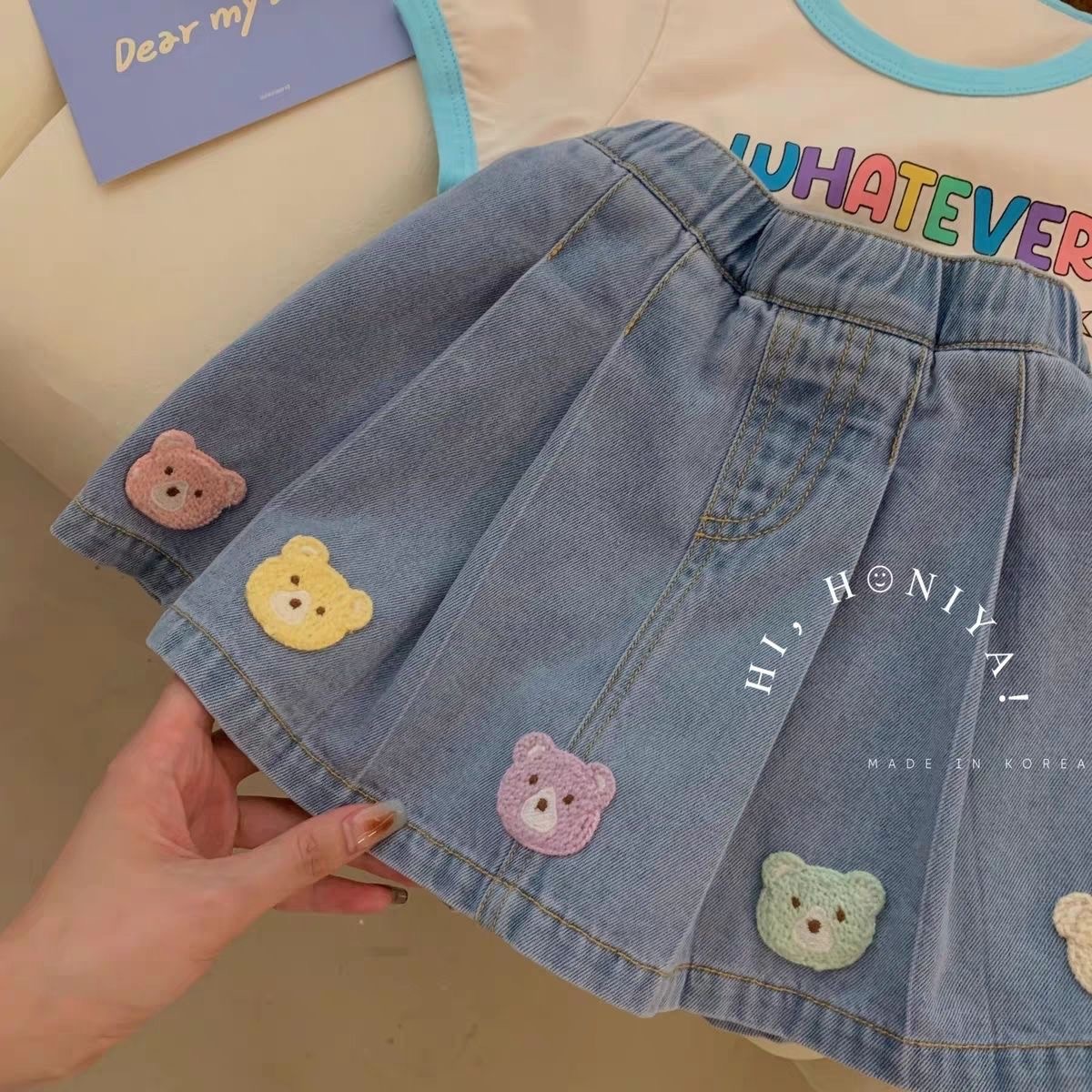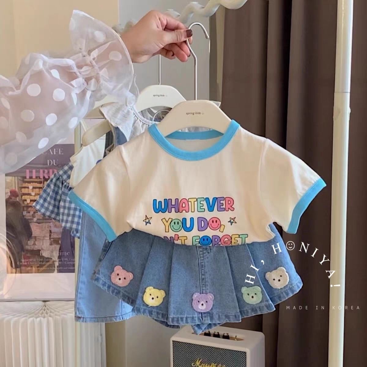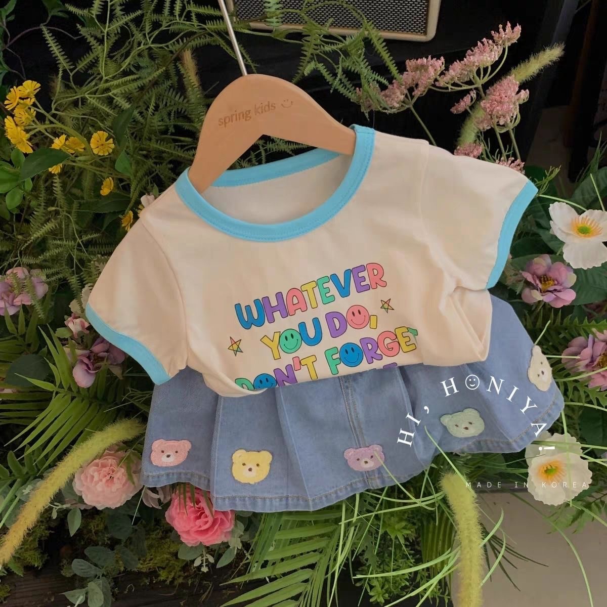 여자 여름 새로운 귀여운 곰 주름 치마 바지 밝은 가장자리 웃는 편지 티셔츠 둥근 목 짧은 소매 2 피스 세트