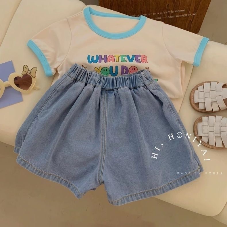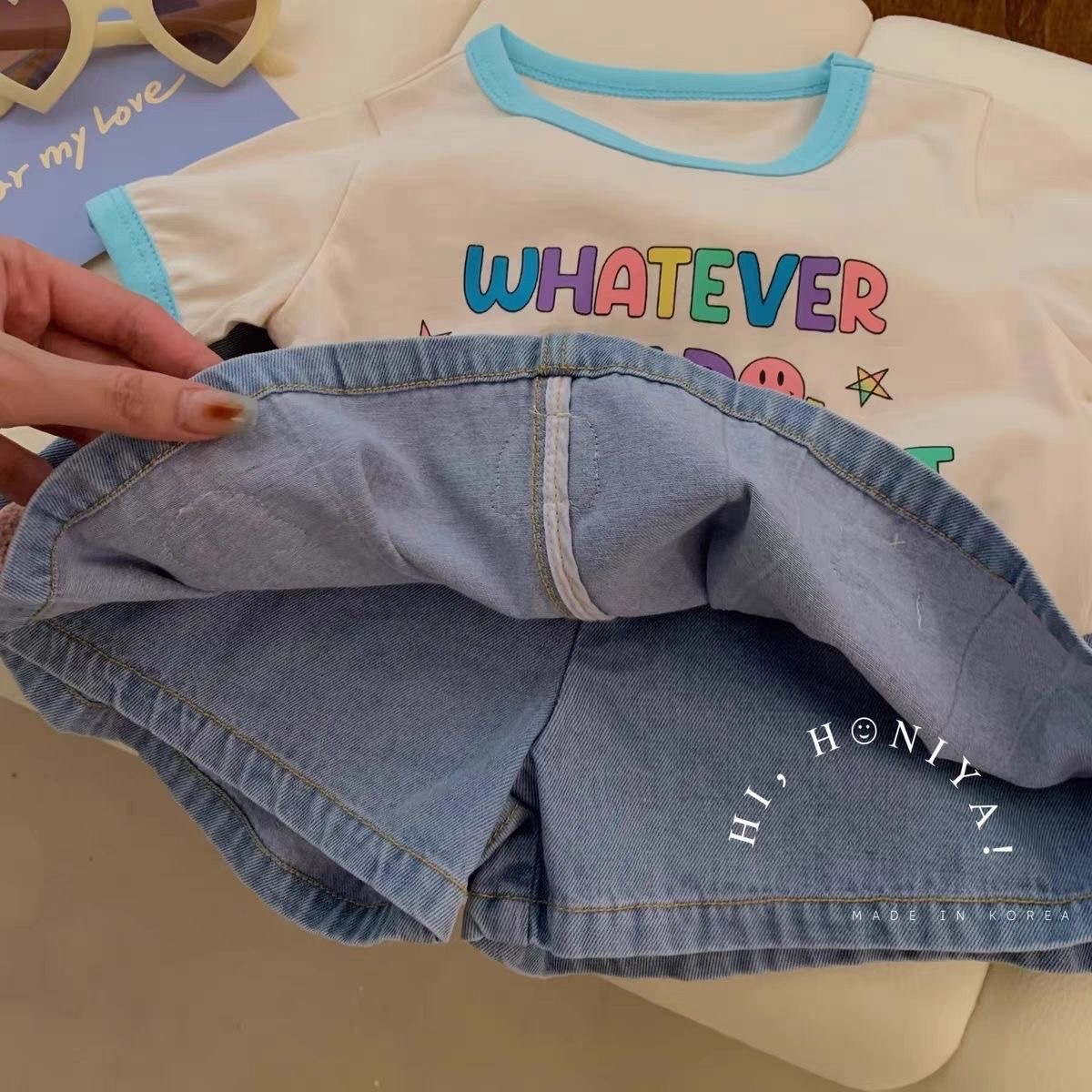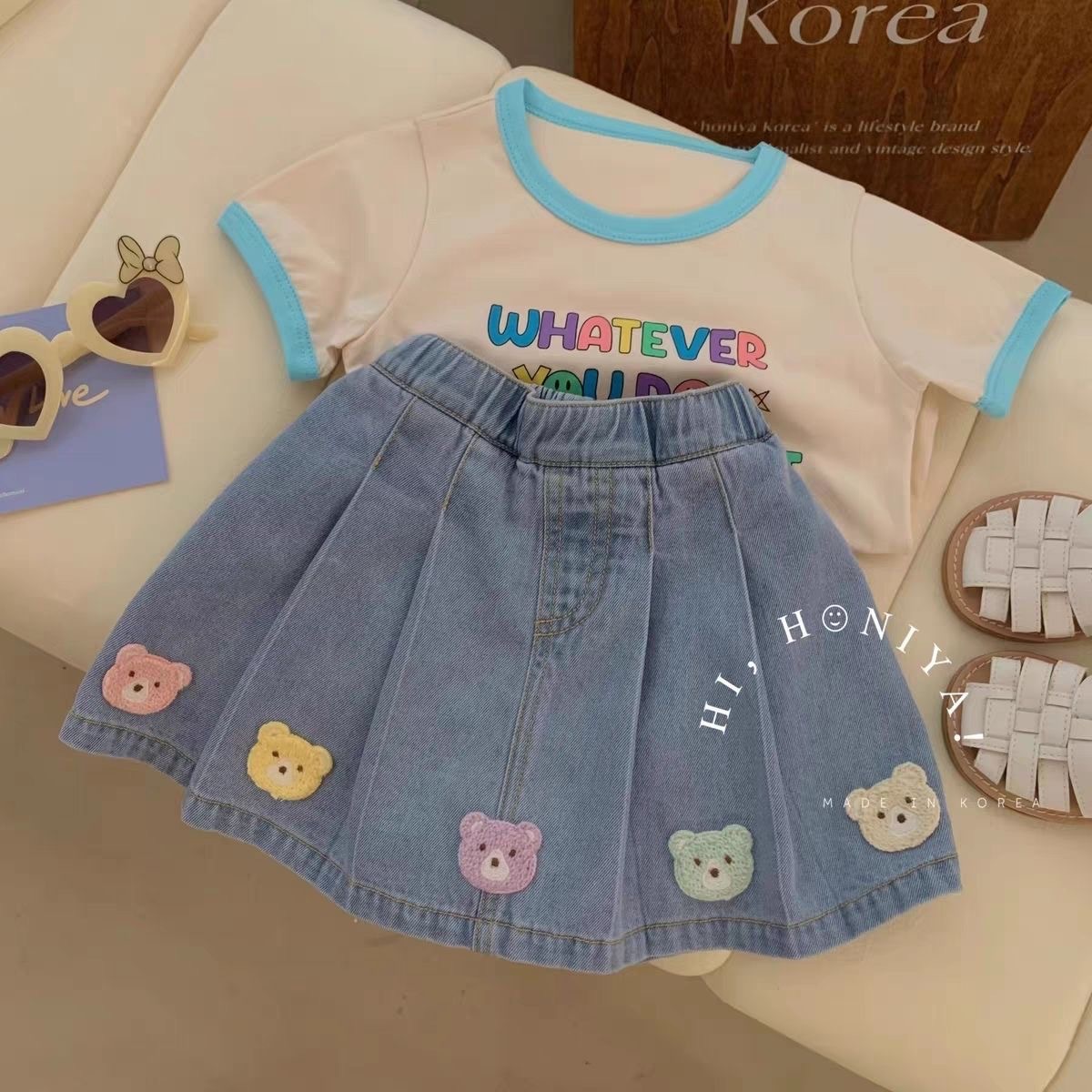 여자 여름 새로운 귀여운 곰 주름 치마 바지 밝은 가장자리 웃는 편지 티셔츠 둥근 목 짧은 소매 2 피스 세트