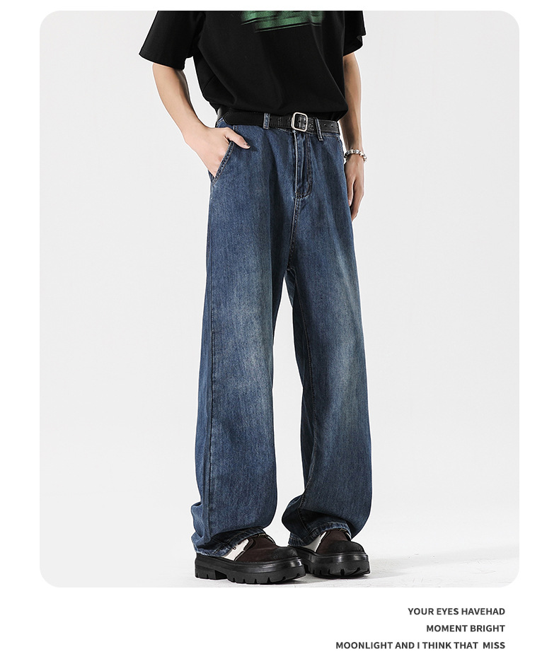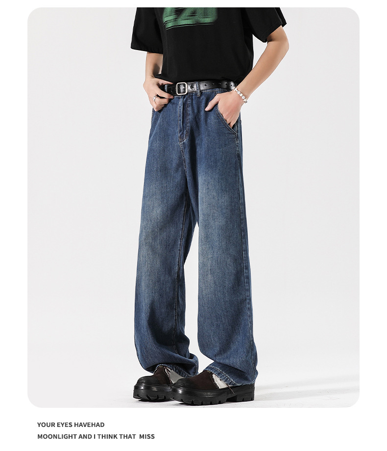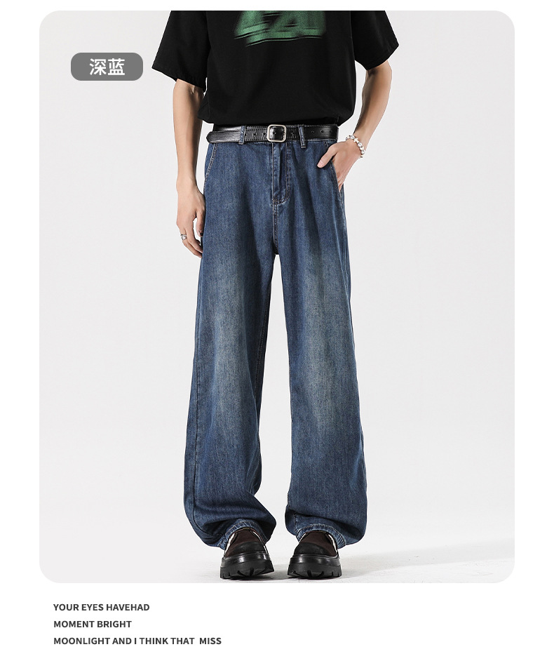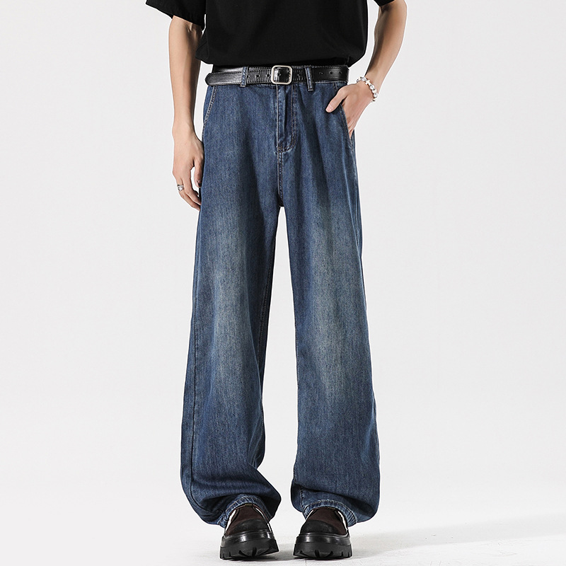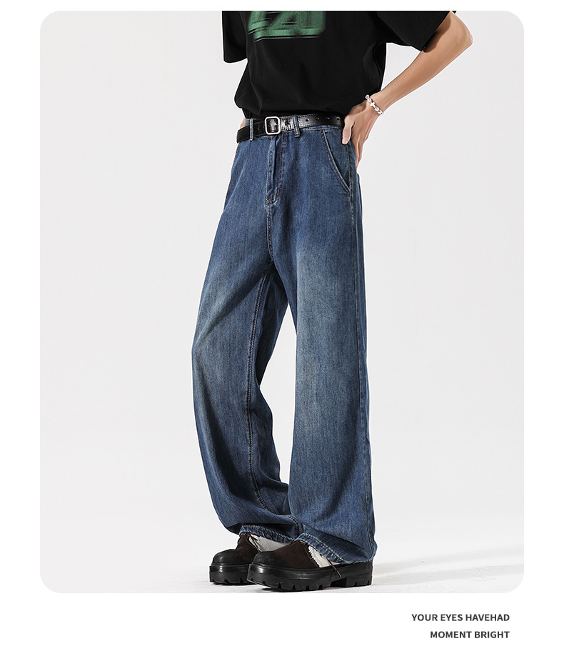 Muqiu 남성복 ∠ Tencel 얇은 청바지 남성용 Vibe Lyocell 레트로 느슨한 오래된 넓은 다리 바지스토어 가기