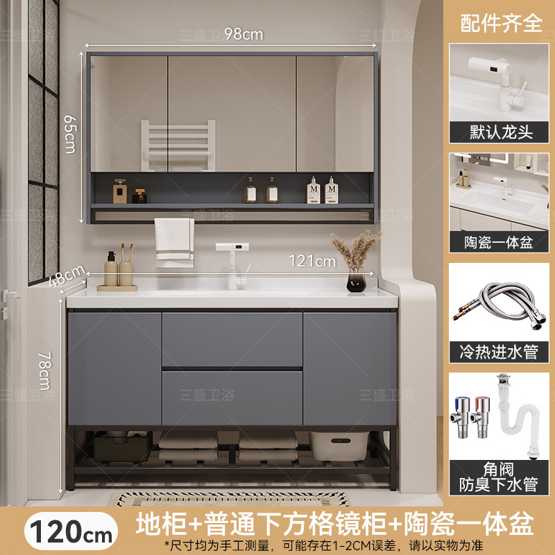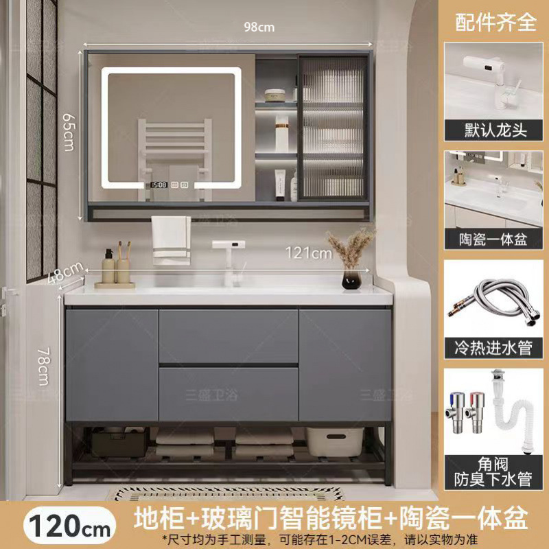 • 패셔너블한 그레이 하이 구성 - [타월걸이] 스마트거울장 - 100 플로어 스탠딩 - 1도어, 2인용 서랍 [레인댄스 폭포수전]