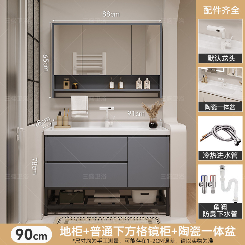 • 패셔너블한 그레이 하이 구성 - [타월걸이] 스마트거울장 - 90 플로어 스탠딩 - 1도어, 2인용 서랍 [레인댄스 폭포수전]