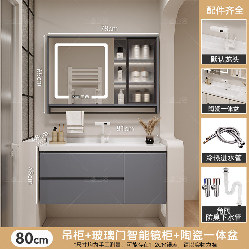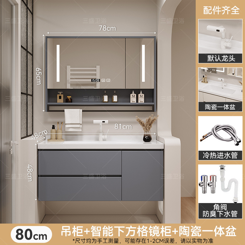 • 패셔너블한 그레이 하이 구성 - [수건걸이] 스마트거울장 - 80바닥형 - 1도어, 2인승 [레인댄스폭포수전]