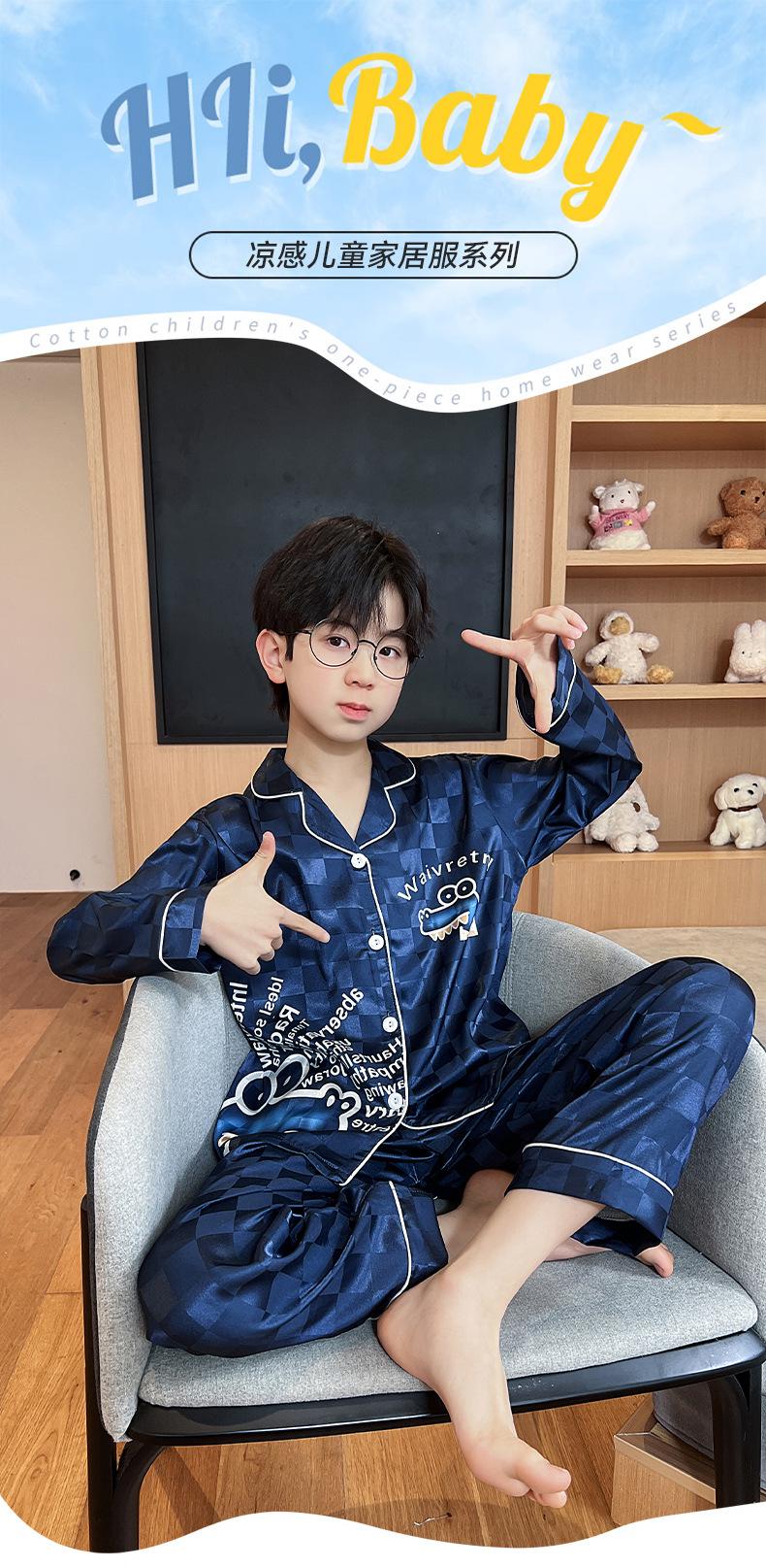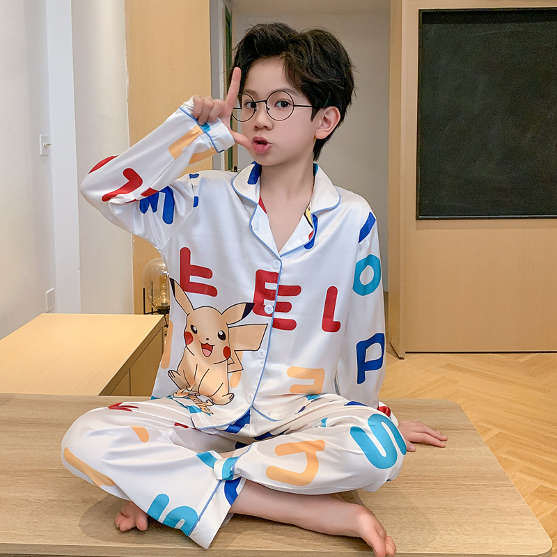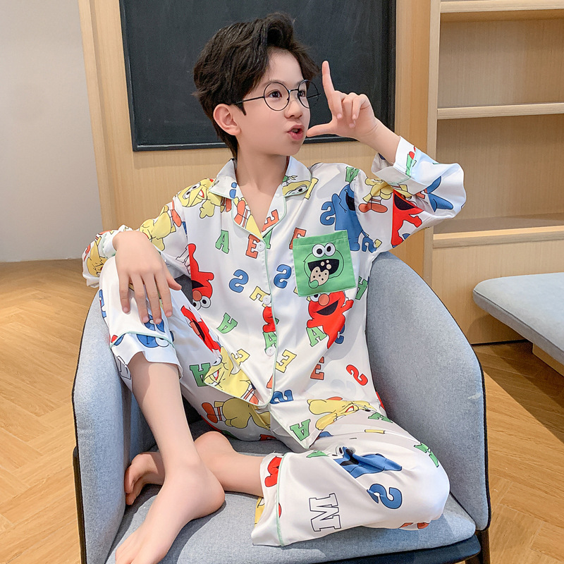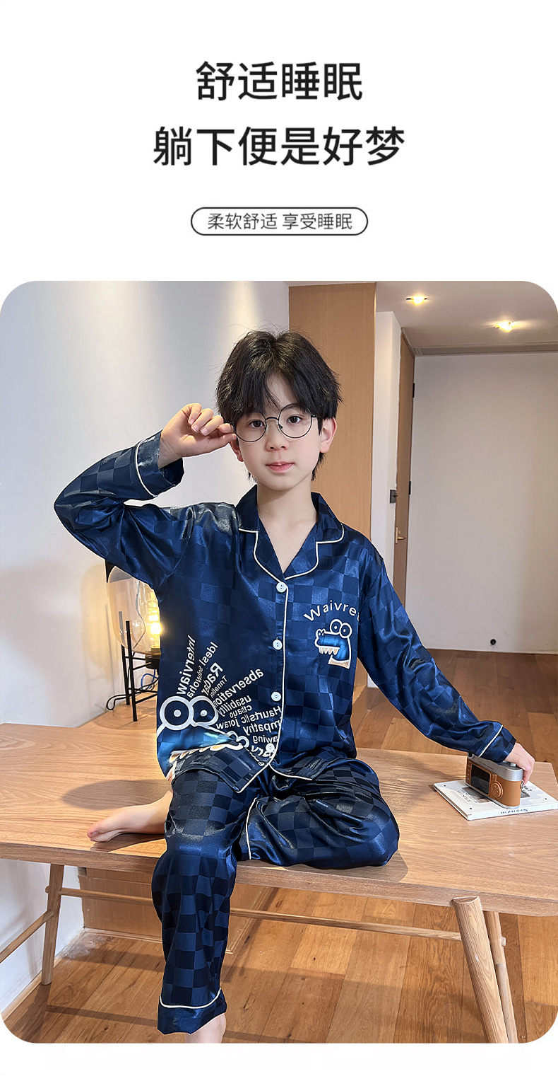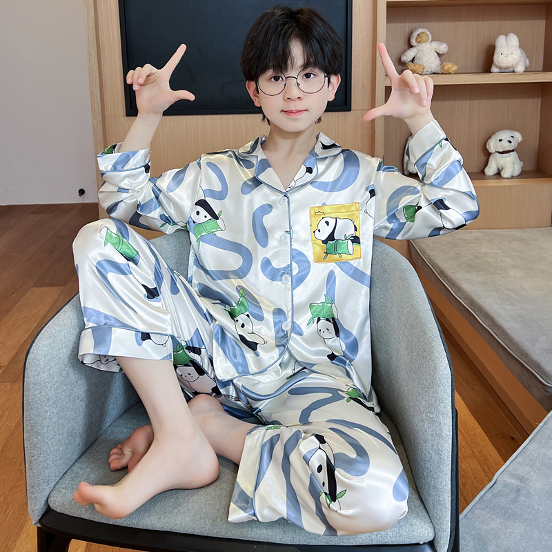 어린이 아이스 실크 잠옷 소년 봄 얇은 긴 소매 만화 소년 중 큰 어린이 실크 여름 홈 의류 세트