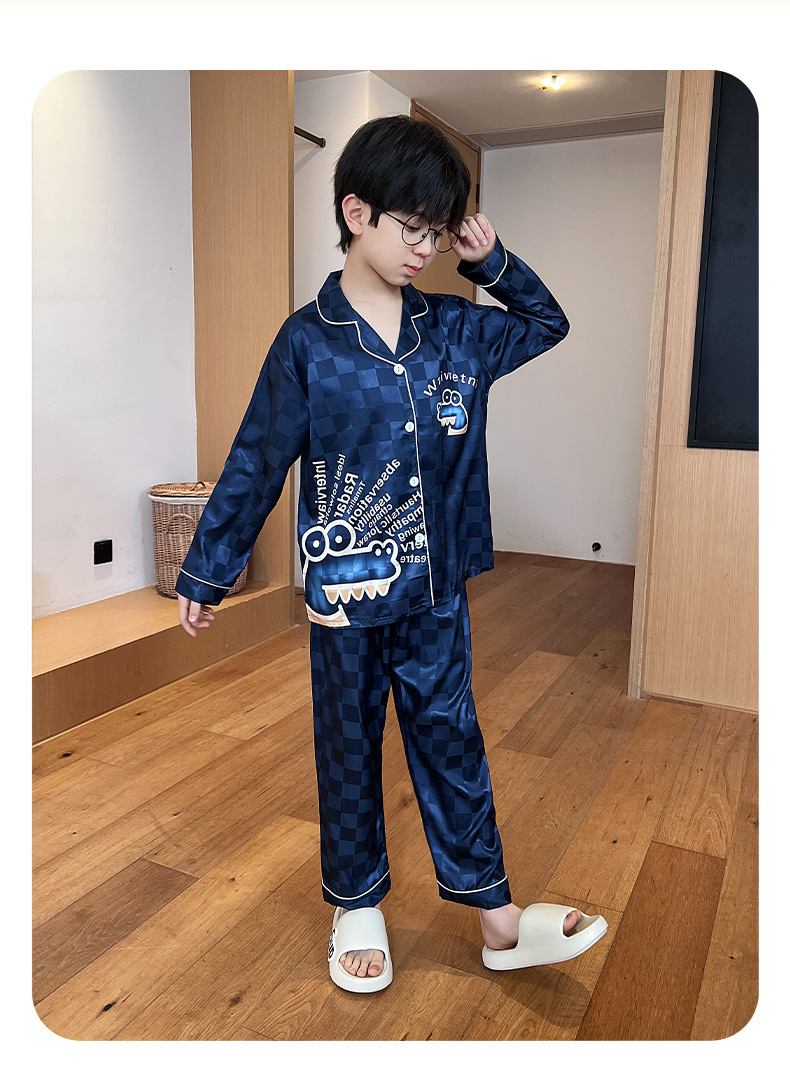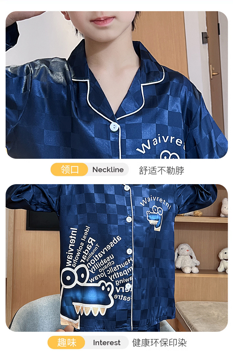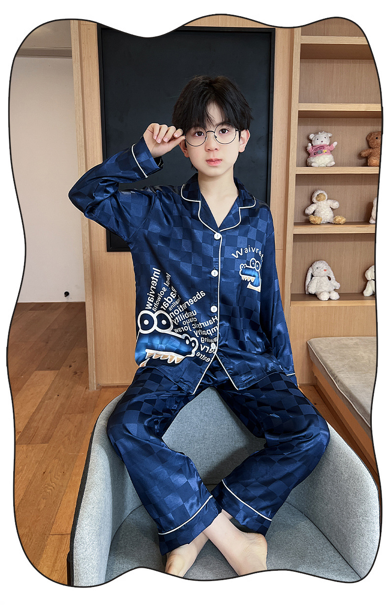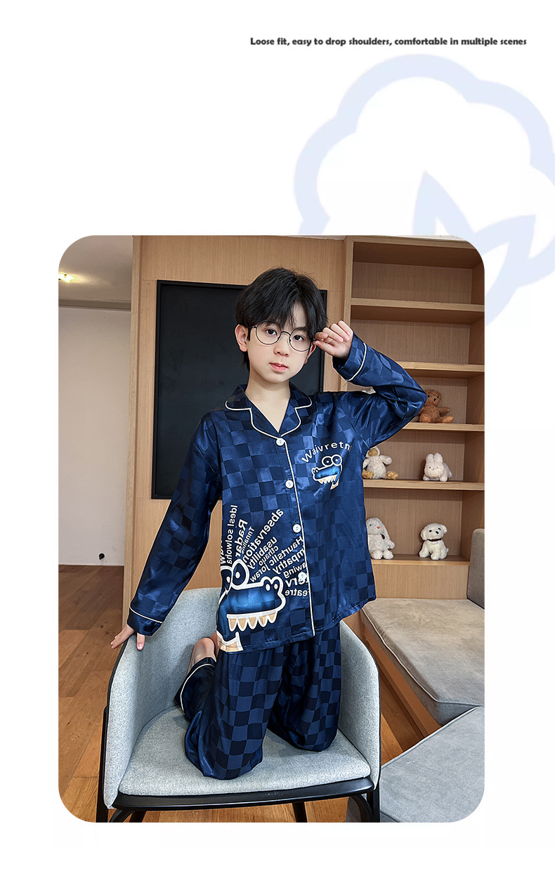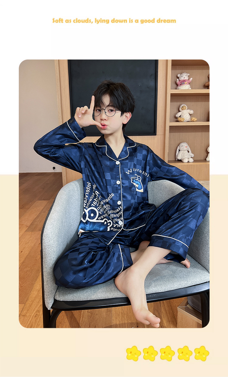 어린이 아이스 실크 잠옷 소년 봄 얇은 긴 소매 만화 소년 중 큰 어린이 실크 여름 홈 의류 세트
