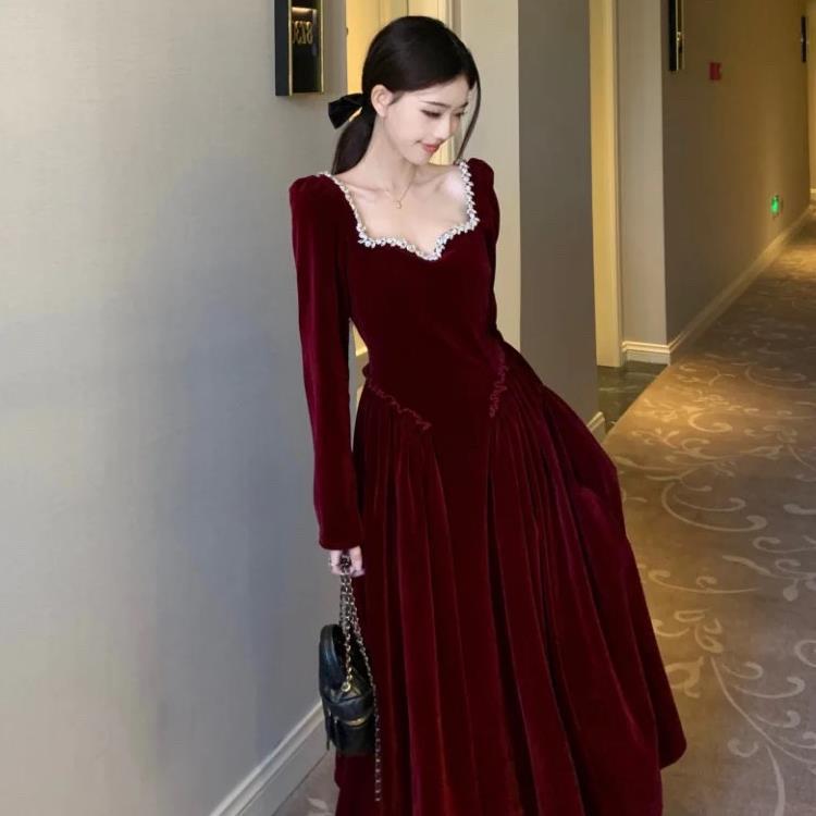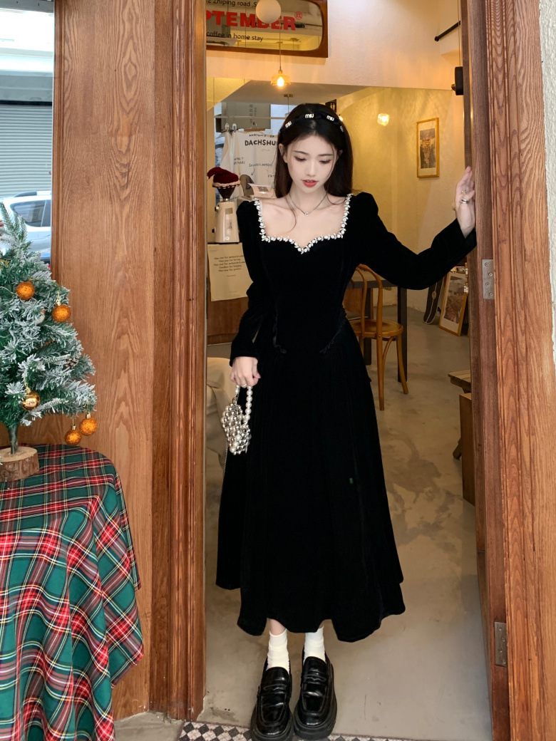 플러스 사이즈 프렌치 레트로 벨벳 원피스 여성의 가을과 겨울 통통녀 타이트한 허리 슬리밍 디자인 센스 우아한 연예인 리틀 블랙 원피스