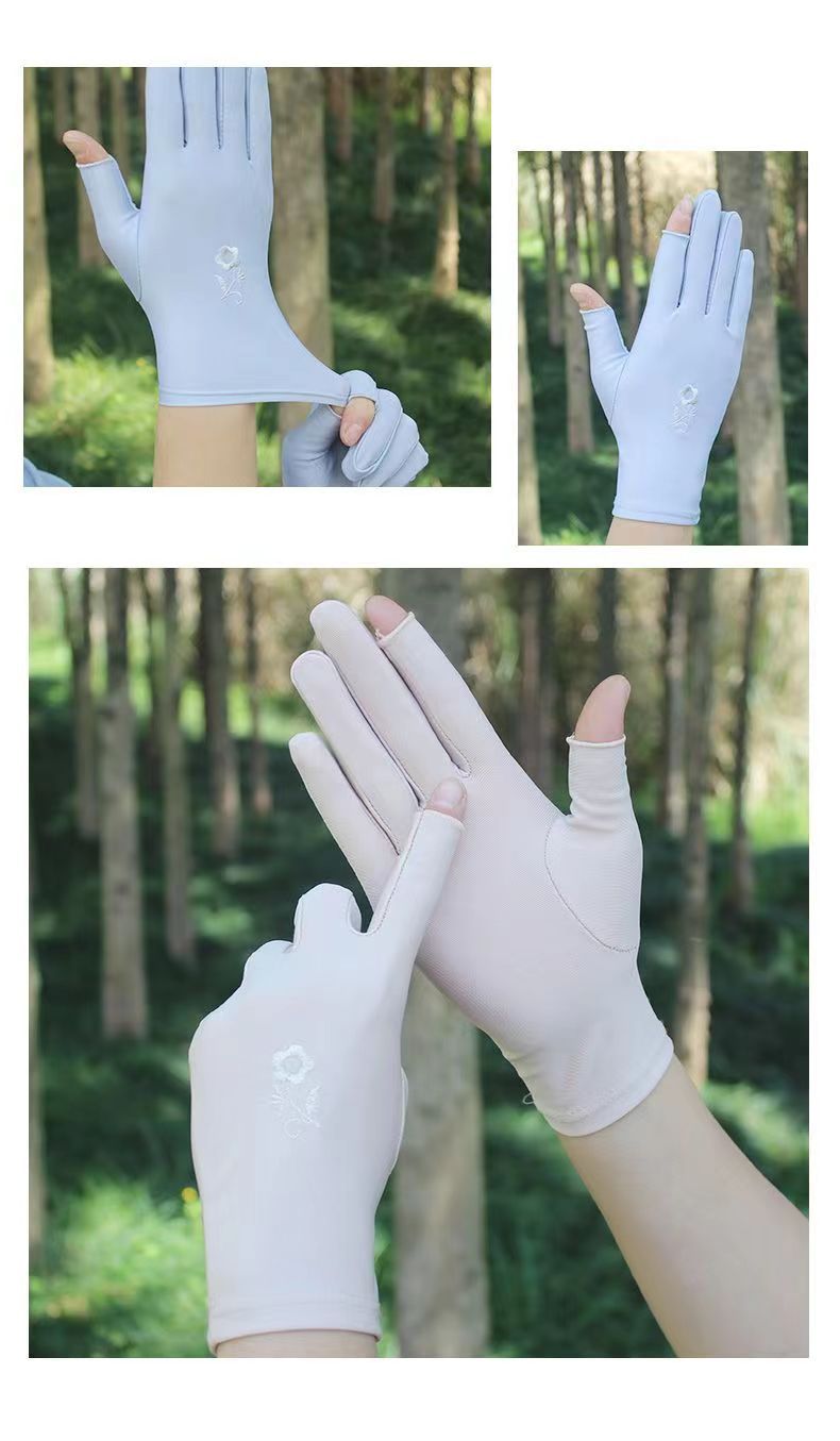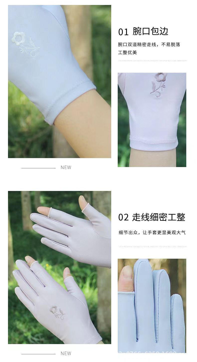 두 손가락 자수 장갑 여성 여름 얇은 봄과 가을 사이클링 운전 아이스 실크 손가락 선 스크린 장갑 차 따기