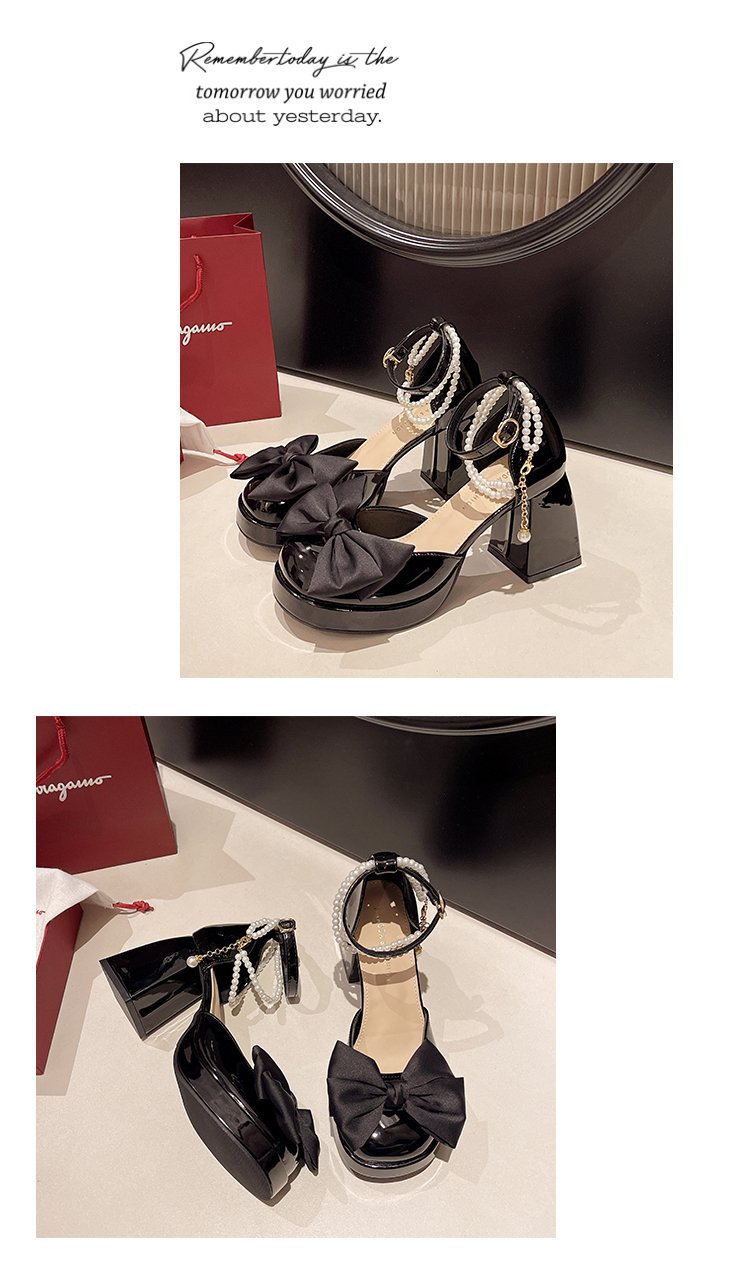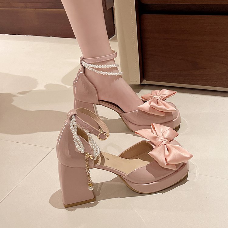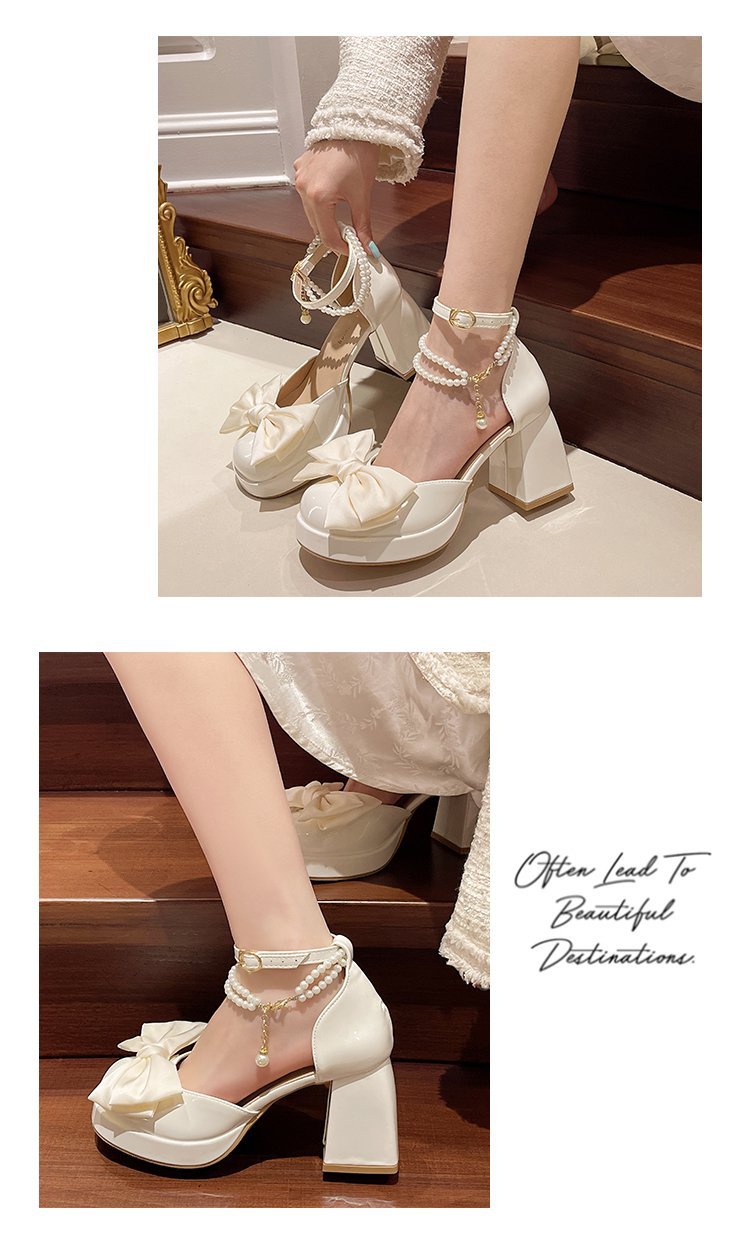 메리 제인 하이힐 스커트 두꺼운 힐 방수 플랫폼 화이트 웨딩 신발 프랑스 가죽 신발 진주 활 신발