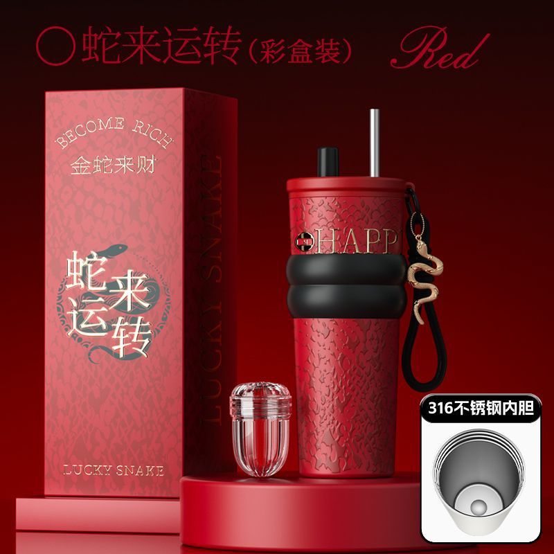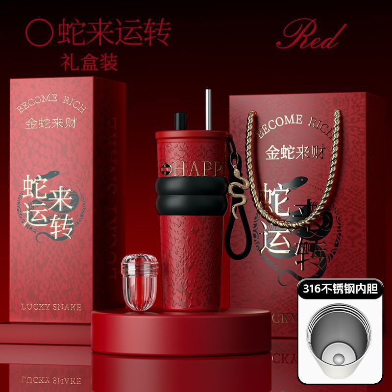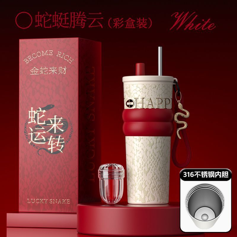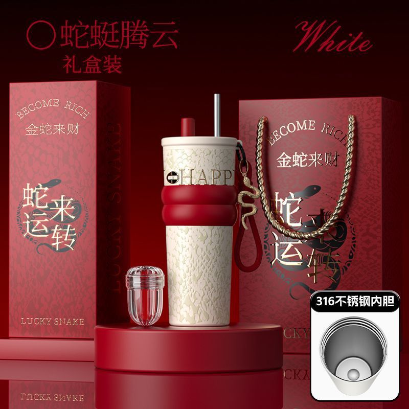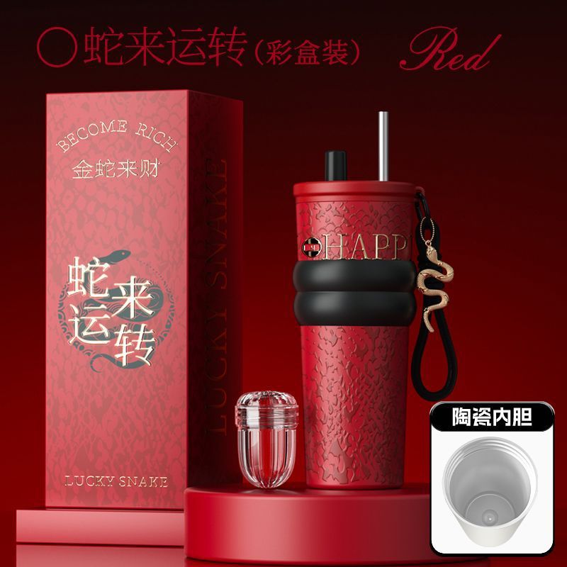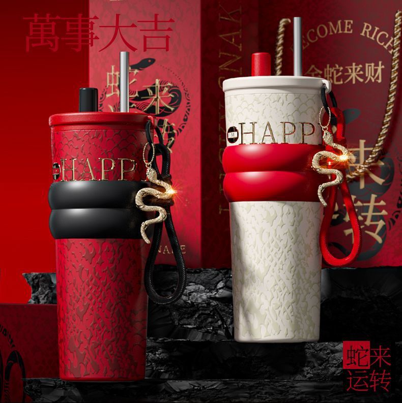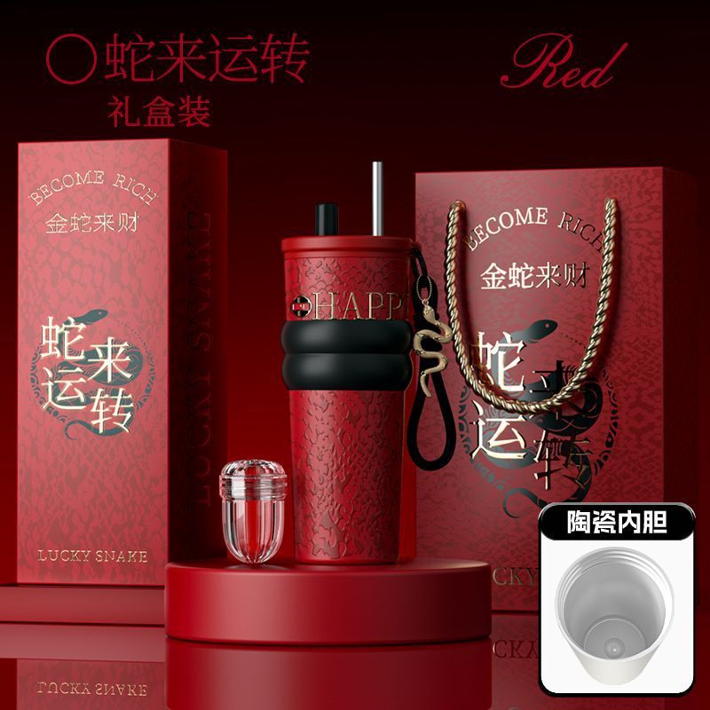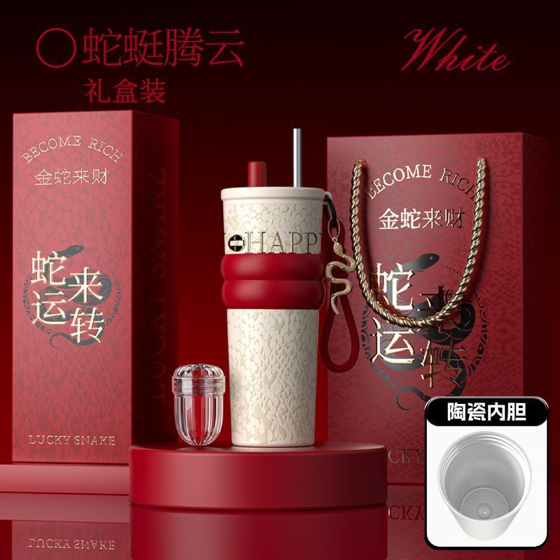 새로운 말년 한정판 빨대형 보온컵, 고급스러운 세라믹 내부 컵, 차량용 커피컵, 새해 기념 선물컵