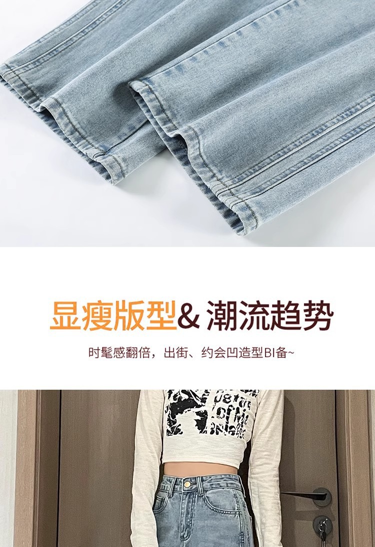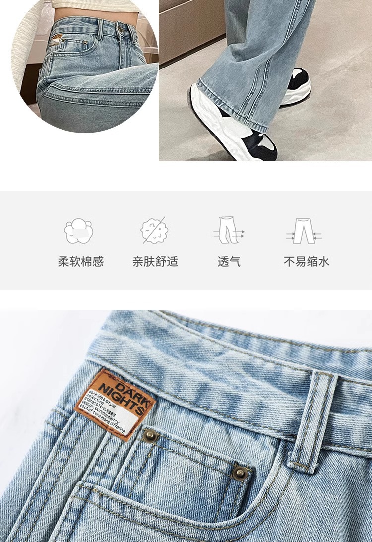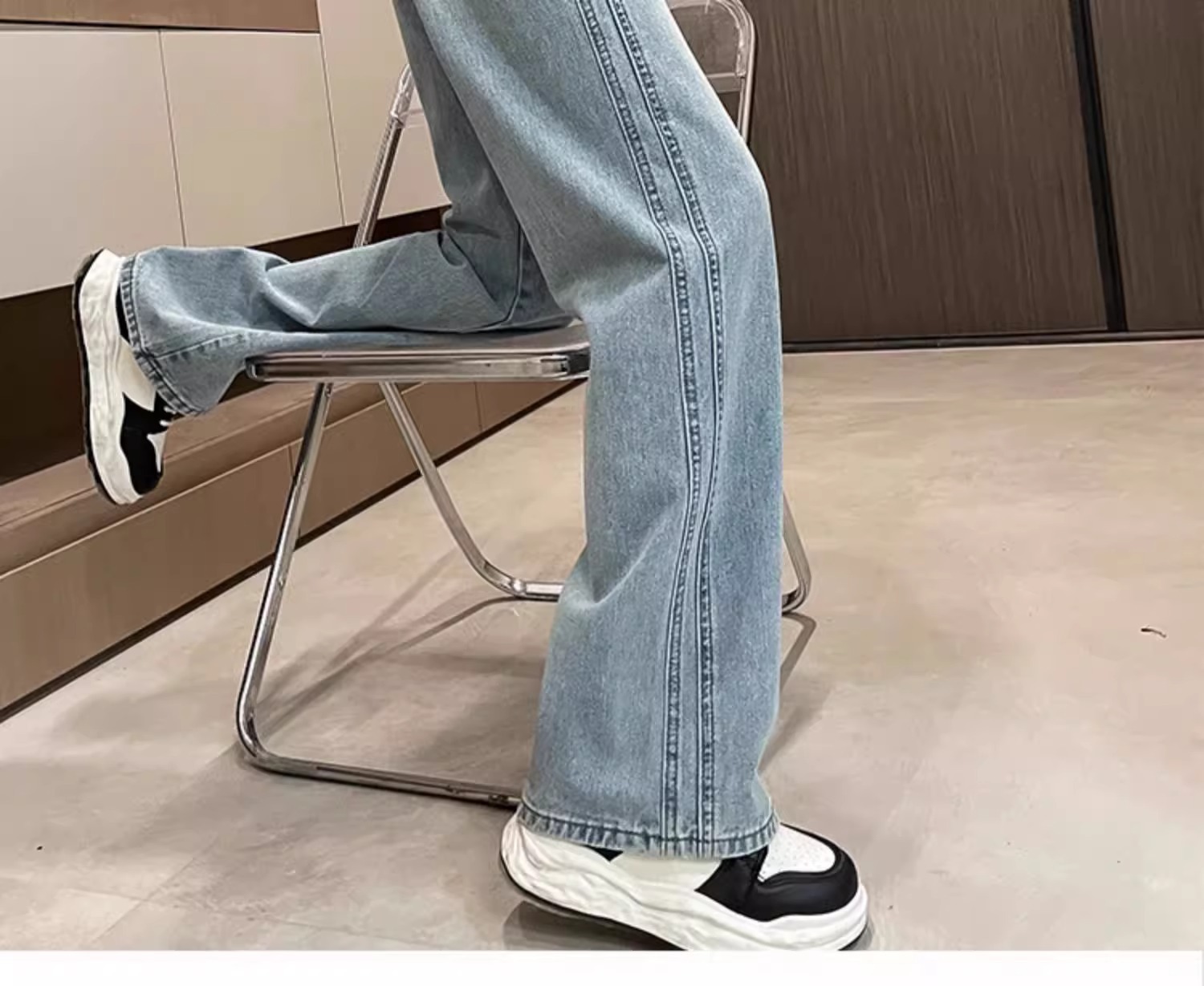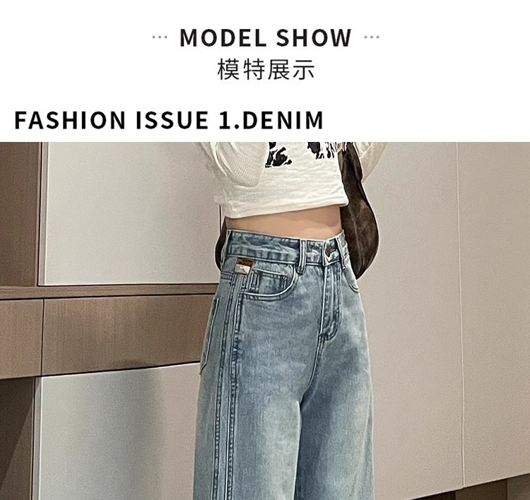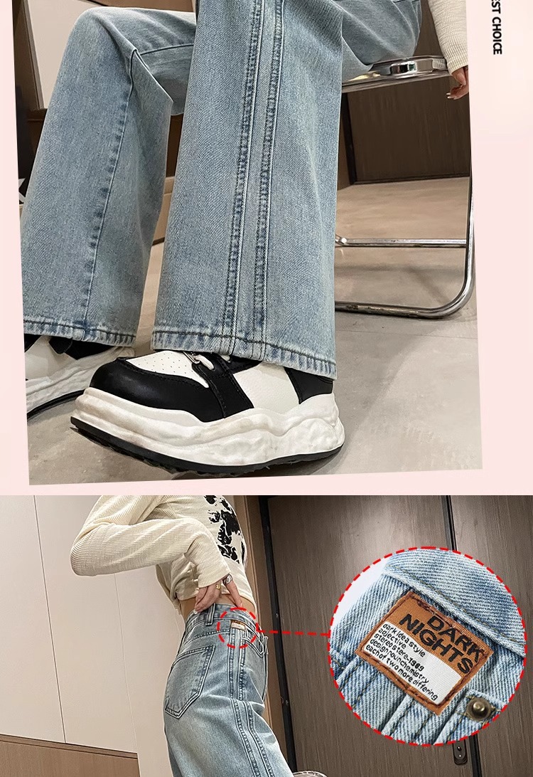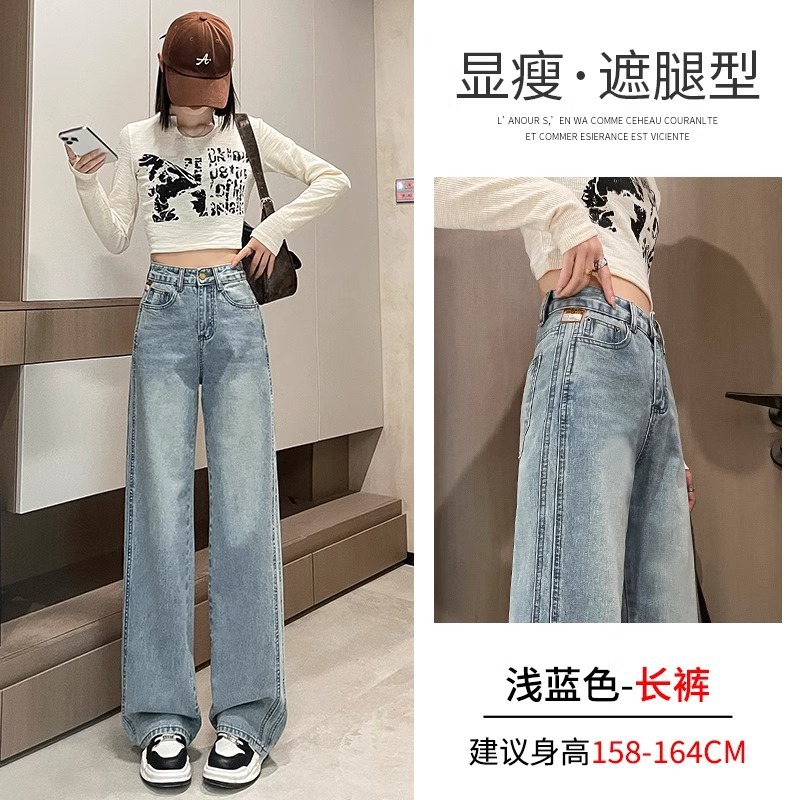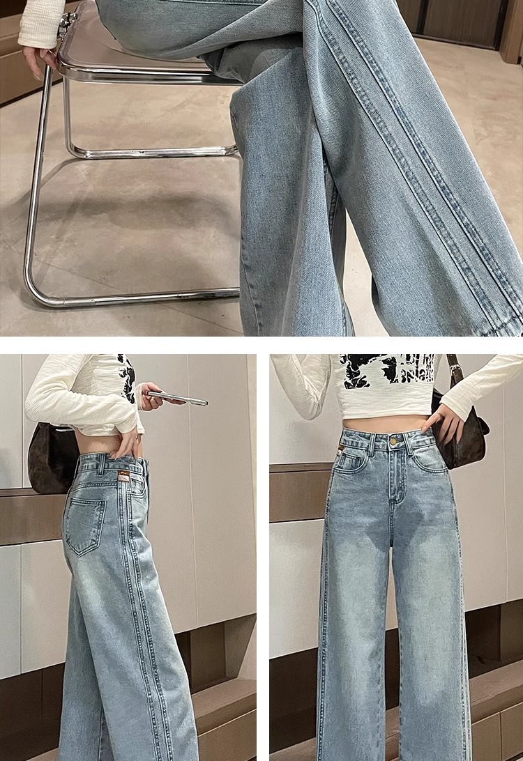레트로 향수를 가진 넓은 다리 청바지 여성의 2025 년 봄과 가을 새로운 명암 가죽 브랜드 측면 양측 긴 유행 바지스토어 가기