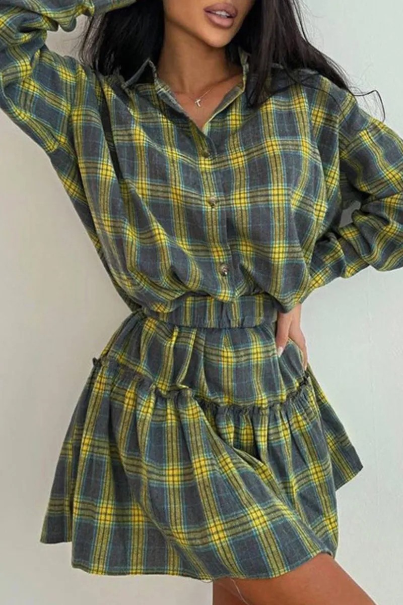 2025 새로운 패션 캐주얼 격자 무늬 원피스 세트 여성용 옷깃 느슨한 셔츠 스트랩 주름 치마 투피스 세트