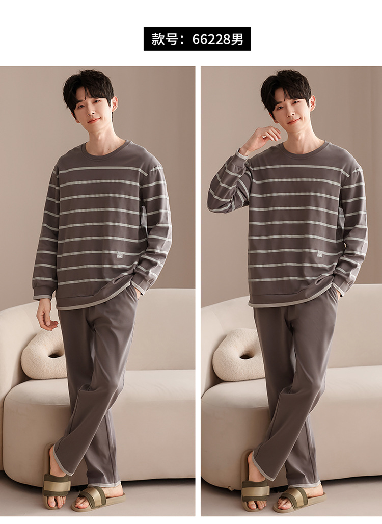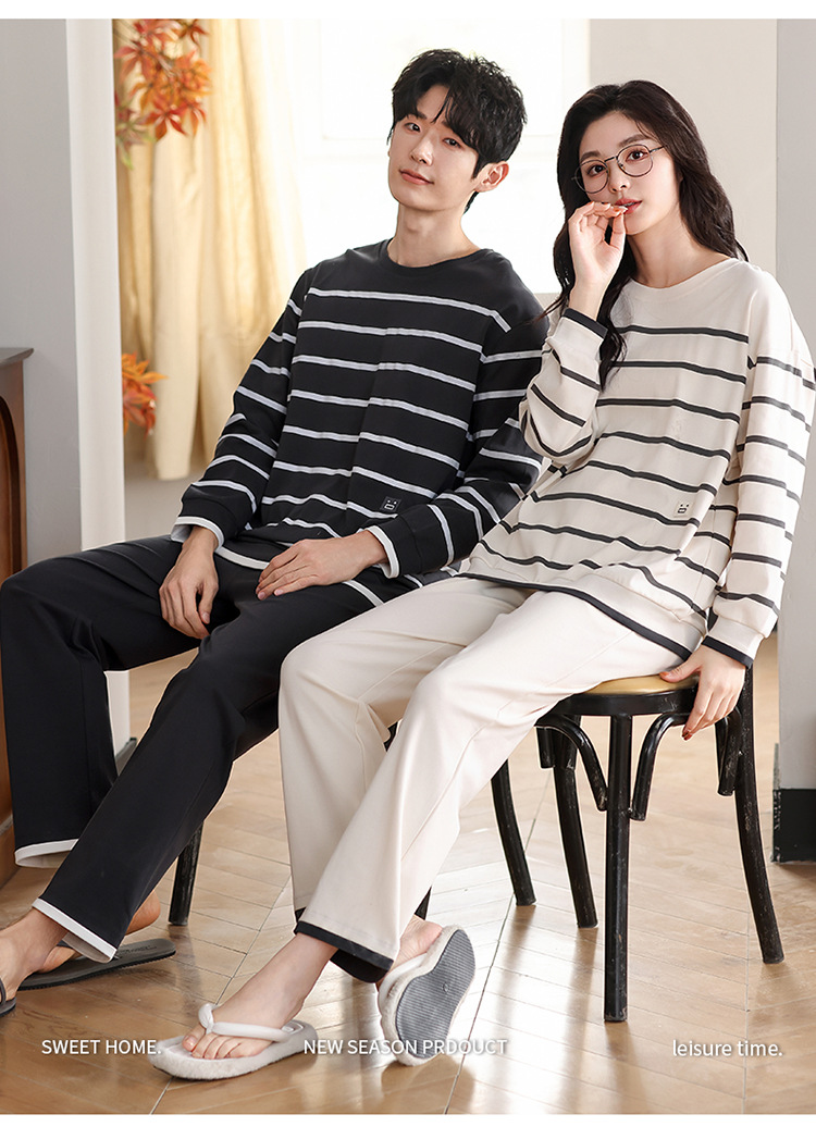 Chun Baifen 커플 잠옷 봄과 가을 남자 면 긴팔 간단한 줄무늬 여자 홈 옷 가슴 패드 세트
