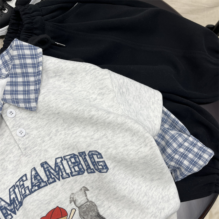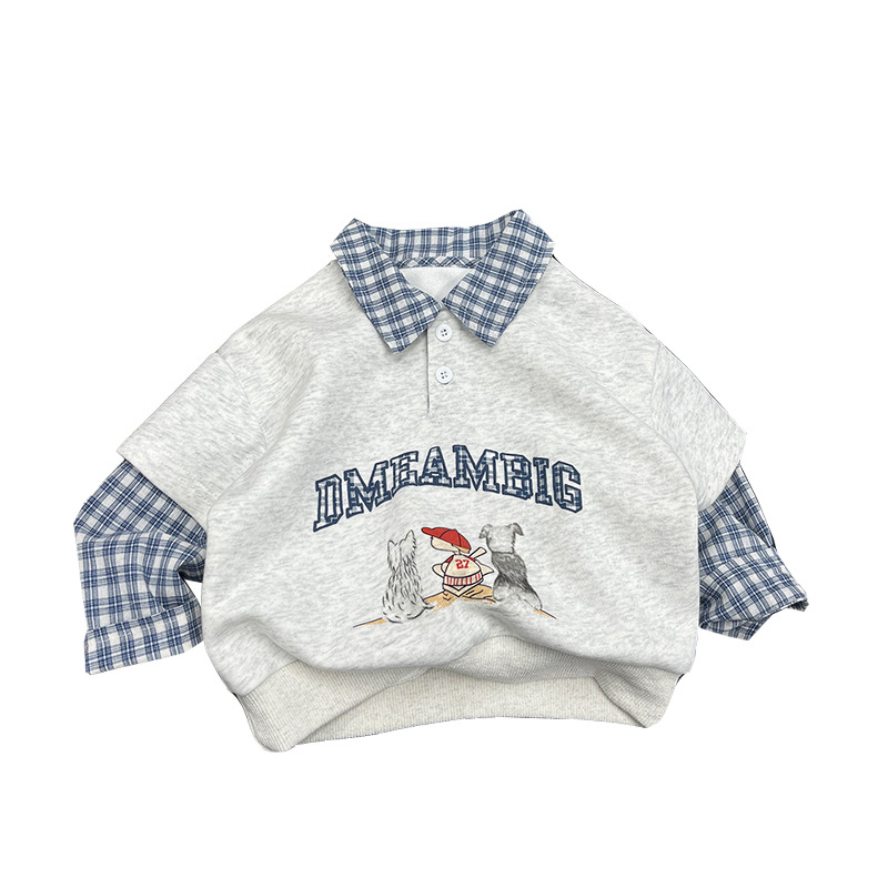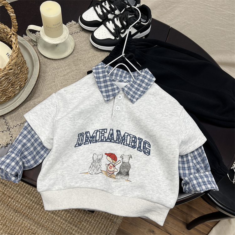 슈퍼 한국 스타일~ 어린이 봄철 체크무늬 배색 라펠 페이크 투피스 스웨트셔츠 남아 폴로셔츠 봄 상의 유아용