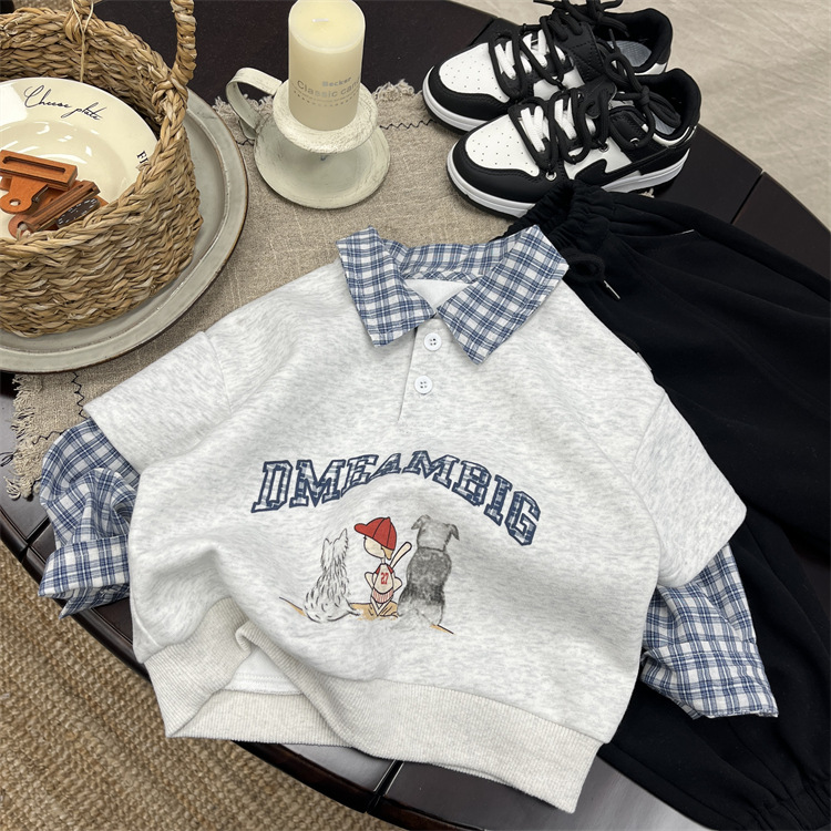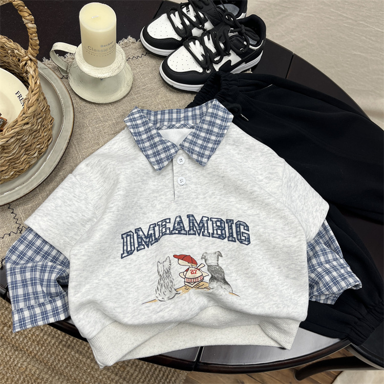 슈퍼 한국 스타일~ 어린이 봄철 체크무늬 배색 라펠 페이크 투피스 스웨트셔츠 남아 폴로셔츠 봄 상의 유아용스토어 가기