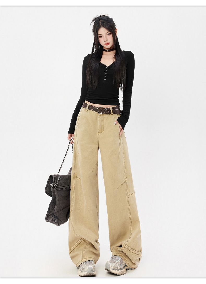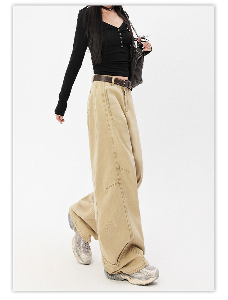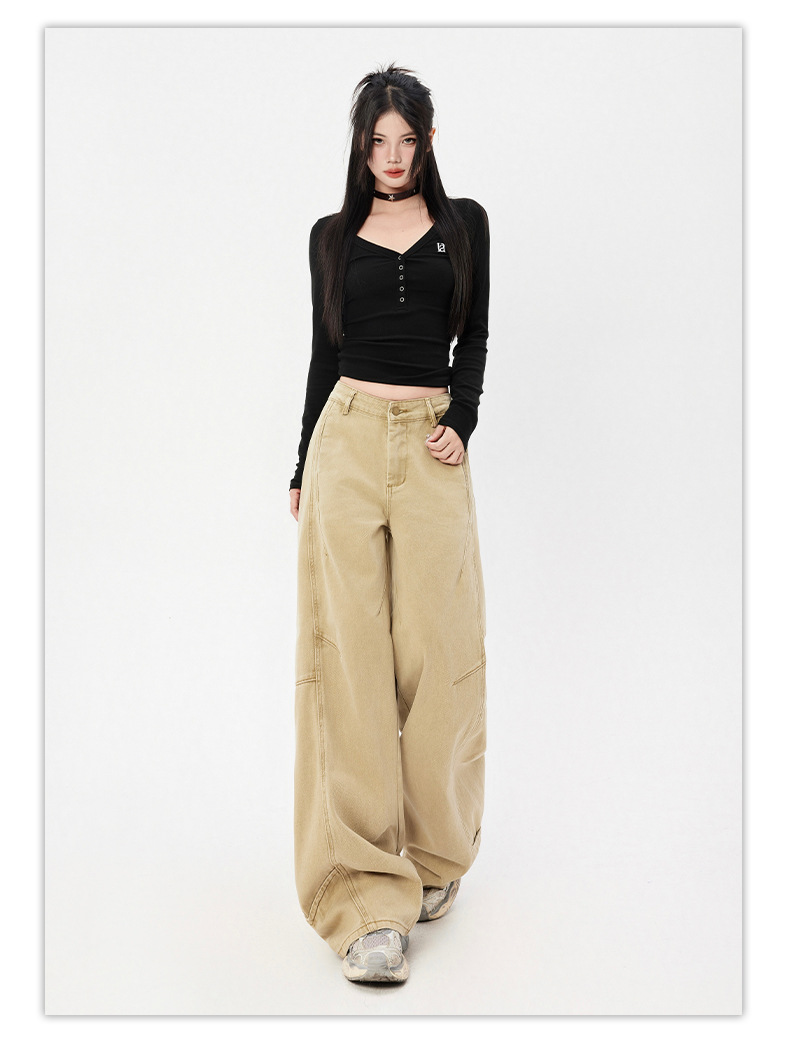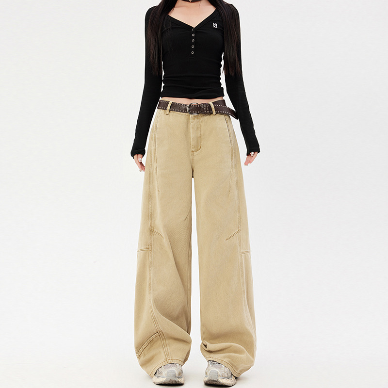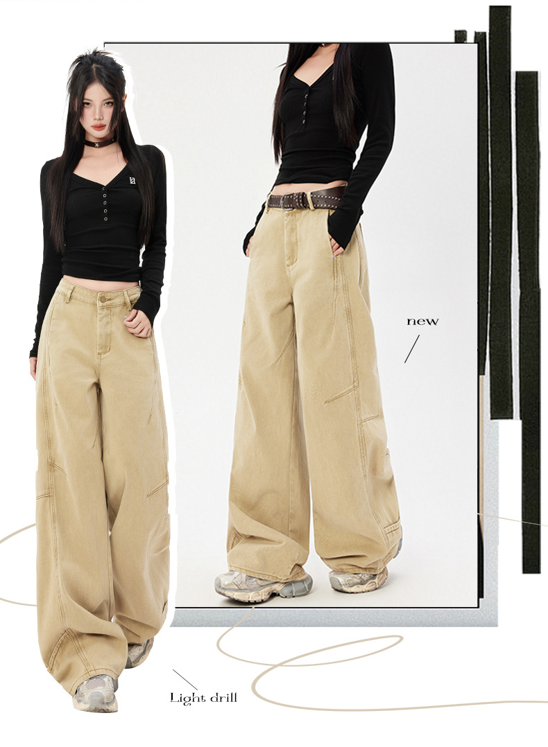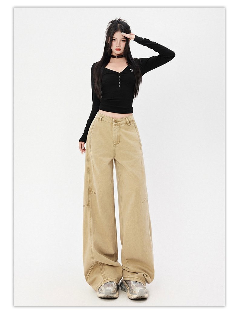 오렌지 실크 여성복 # 미국 레트로 스타일 주름 와이드 레그 카이트 팬츠 여름 신상 라이트 카키 하이웨이스트 슬림핏 청바지