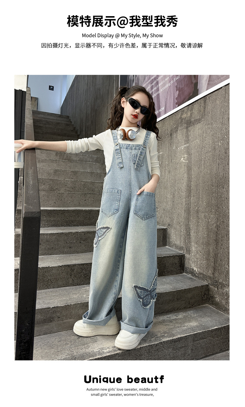 소녀의 봄과 가을 청바지 2025 새로운 패션 소녀 한국 스타일 세련된 패딩 데님 스트랩 바지스토어 가기
